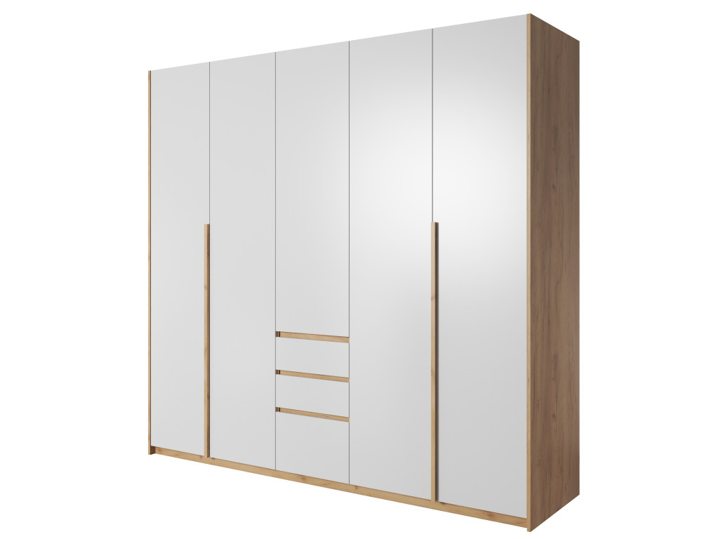 Šatníková skriňa Xelo spája čistú bielu farbu s prírodným dekorom dub craft zlatý, čím do spálne prináša sviežosť a elegantný kontrast. Rozmery skrine sú 225 × 60 × 213,5 cm (š × h × v), čo z nej robí priestranné riešenie pre uloženie oblečenia a doplnkov.