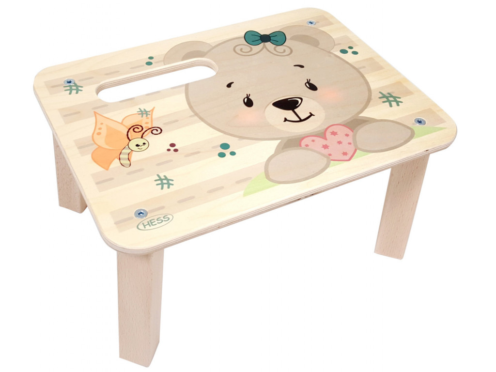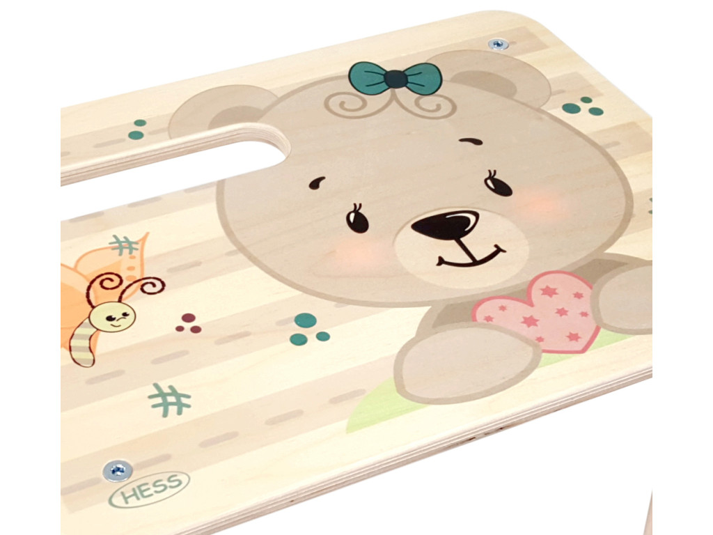 Táto robustná stolička s otvorom na uchytenie je skvelým pomocníkom a tiež pútačom v detskej izbe. Je zdobená jemnými pastelovými ilustráciami motýľa, medvedíka so srdiečkom a drobnými prvkami.