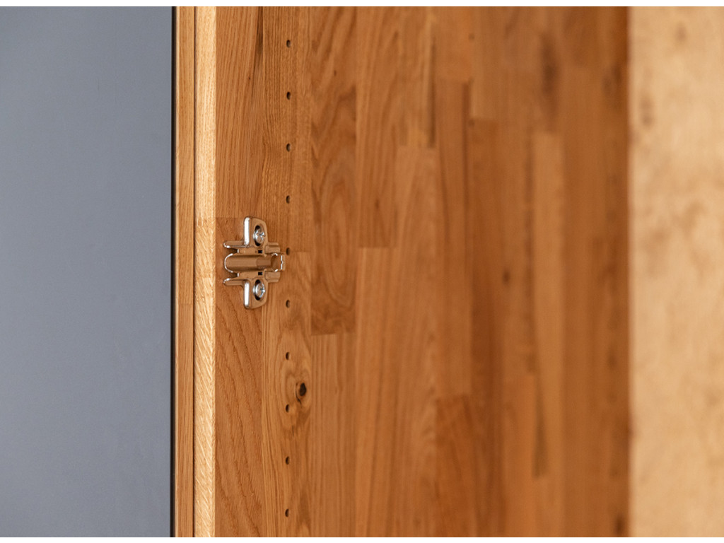Dubová 4D skriňa má 4 dvierka a vo vnútri policu a závesnú tyč, ktoré si môžete umiestniť tam, kde potrebujete. Úchytky sú kovové, čiernej práškovej farby a efektne kontrastujú s celým vizuálom nábytku. Pánty dvierok Hettich vynikajú komfortným systémom tichého zatvárania. Pri výrobe skrine bolo použité prvotriedne dubové drevo a prírodné oleje v svetlom prírodnom odtieni.