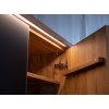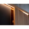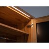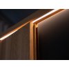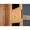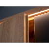 Na prednej strane sa nachádzajú pevné kovové úchyty s práškovou povrchovou úpravou v matnej čiernej farbe. Vnútri v strede sú otvory po celej výške nábytku, aby ste si mohli individuálne nastaviť výšku každej police podľa svojich predstáv. Prírodné dubové drevo má nadčasový charakter, ktorý mu dodáva zlatý odtieň v kombinácii s čiernou farbou. Čiernu farbu možno vidieť na efektných vodorovných pruhoch prebiehajúcich po celej šírke masívu v strednej časti, ako aj na 2 pároch dvierok, ktoré sú kryté matným sklom. Doplnkové dekoratívne osvetlenie vyzdvihuje krásu dreva.