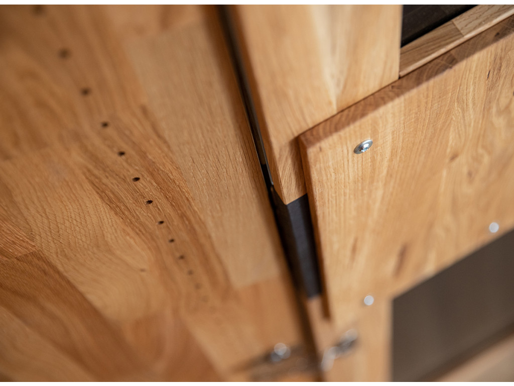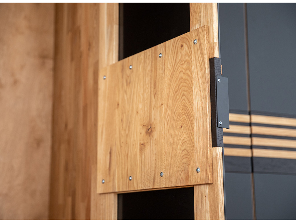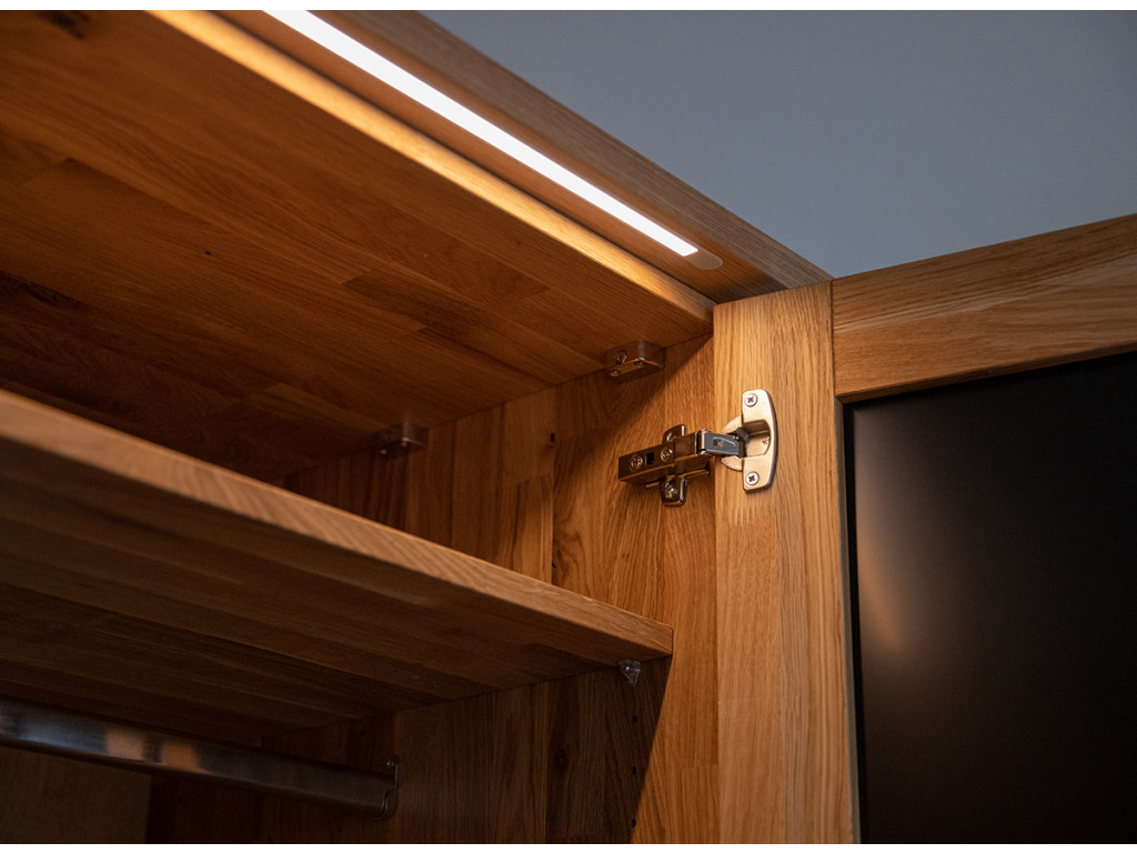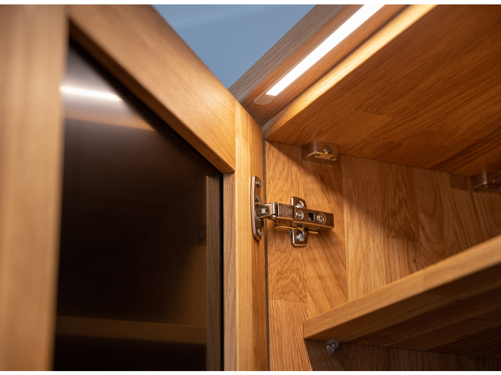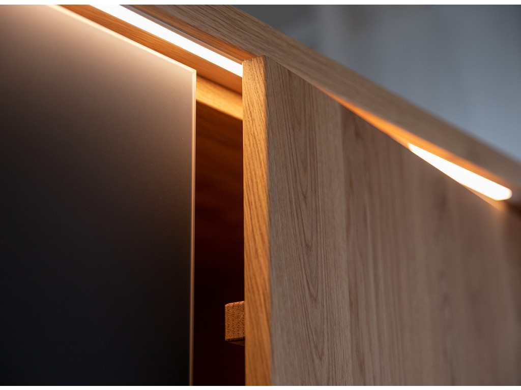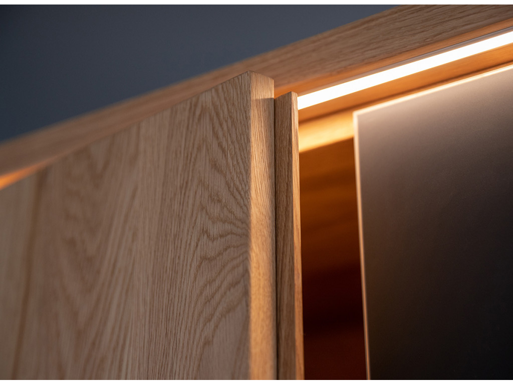 Na prednej strane sa nachádzajú pevné kovové úchyty s práškovou povrchovou úpravou v matnej čiernej farbe. Vnútri v strede sú otvory po celej výške nábytku, aby ste si mohli individuálne nastaviť výšku každej police podľa svojich predstáv. Prírodné dubové drevo má nadčasový charakter, ktorý mu dodáva zlatý odtieň v kombinácii s čiernou farbou. Čiernu farbu možno vidieť na efektných vodorovných pruhoch prebiehajúcich po celej šírke masívu v strednej časti, ako aj na 2 pároch dvierok, ktoré sú kryté matným sklom. Doplnkové dekoratívne osvetlenie vyzdvihuje krásu dreva.