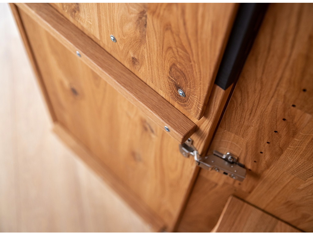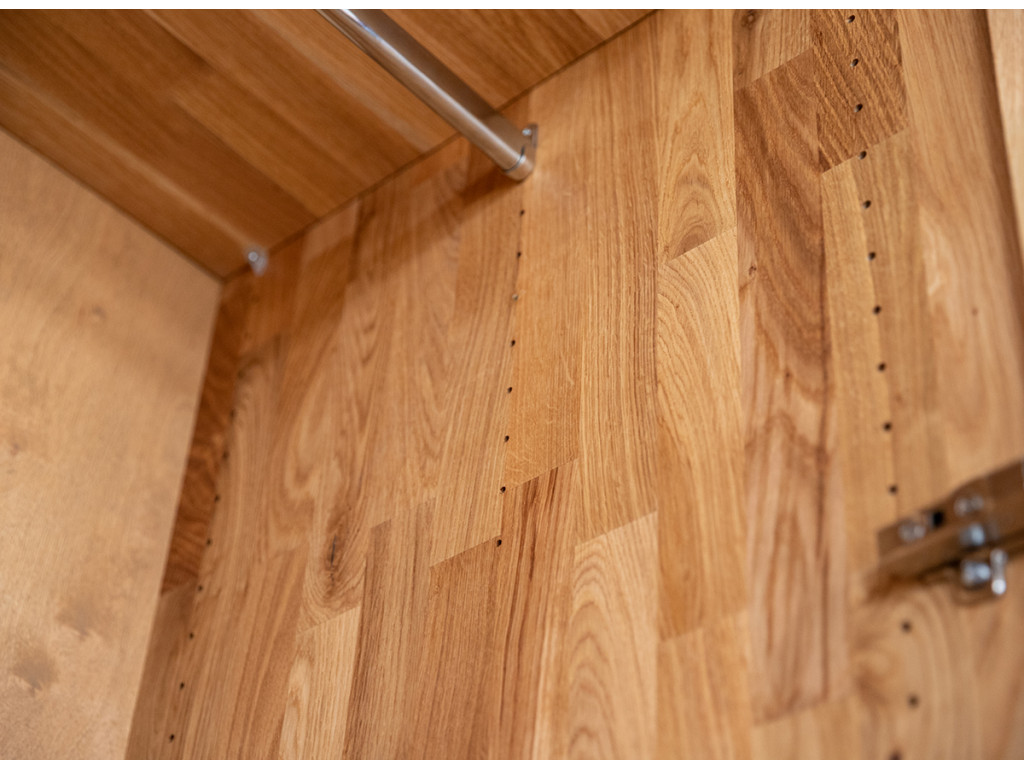 Dubová šatníková skriňa z kolekcie Ravello je odolná, pevná a robustná, vďaka čomu si dlhodobo zachová svoj bezchybný vzhľad. Vďačí za to použitému materiálu - prírodnému dubu, ktorý je podrobený procesu olejovania na ochranu jeho vzhľadu a štruktúry.