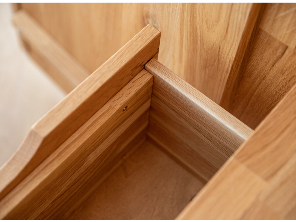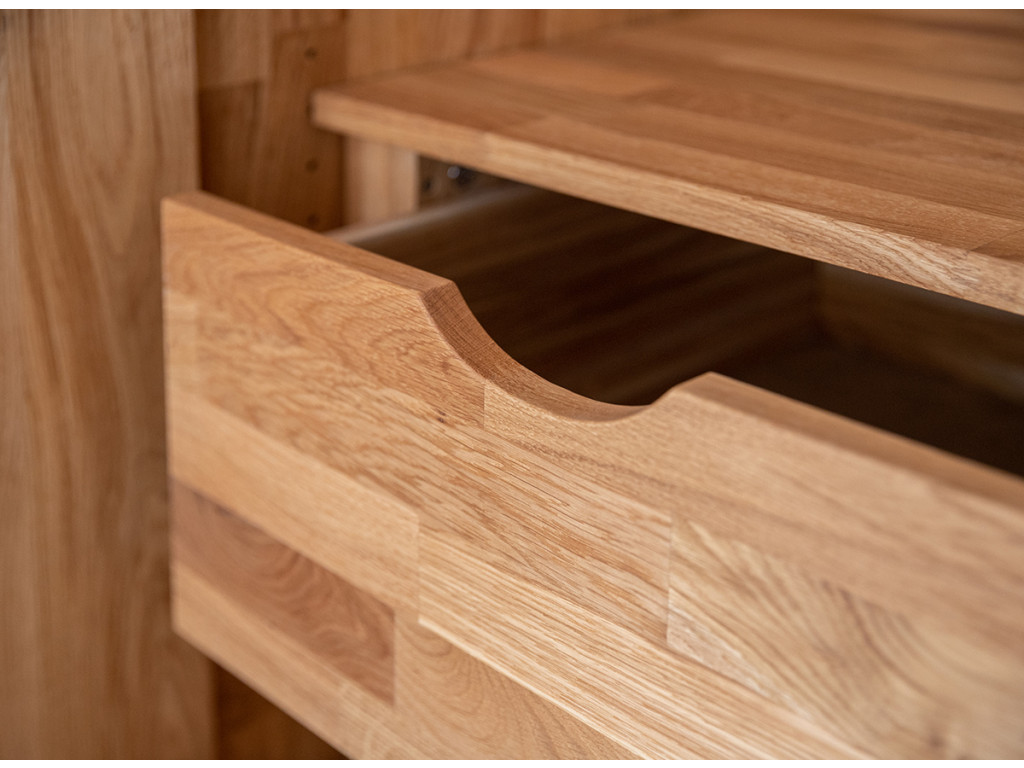 Modul Ravello je vyrobený z dubových dosiek s hrúbkou až 2 cm. Toto masívne vyhotovenie dodáva nábytku potrebnú stabilitu aj napriek intenzívnemu používaniu. Dve hlboké zásuvky s efektnými výrezmi namiesto úchytiek sa hladko vysúvajú v plnom rozsahu. Je to umožnené vďaka pojazdom značky Hettich.