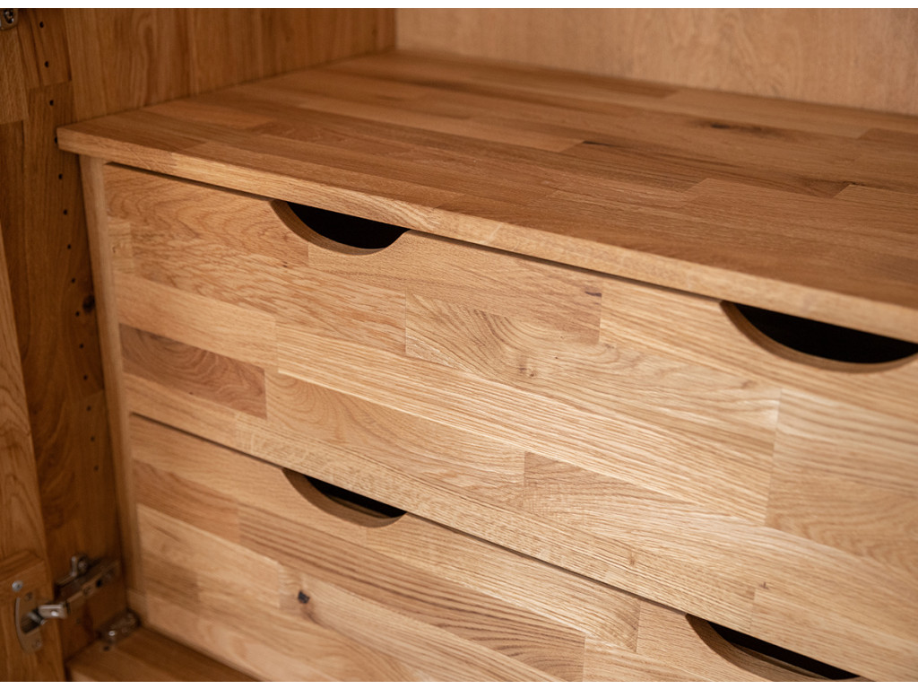 Účelný a pritom dizajnový modul do šatníkovej skrine Ravello je ideálny na praktické rozčlenenie priestoru v šatníku. Zároveň pomáha prehľadnejšie usporiadať uskladnené veci. Dubový modul do skrine Ravello je plne kompatibilný so šatníkom z tejto kolekcie a zároveň výrazne zefektívňuje jeho úložný priestor. Modul disponuje 2 šikovnými zásuvkami s výrezmi namiesto úchytiek.