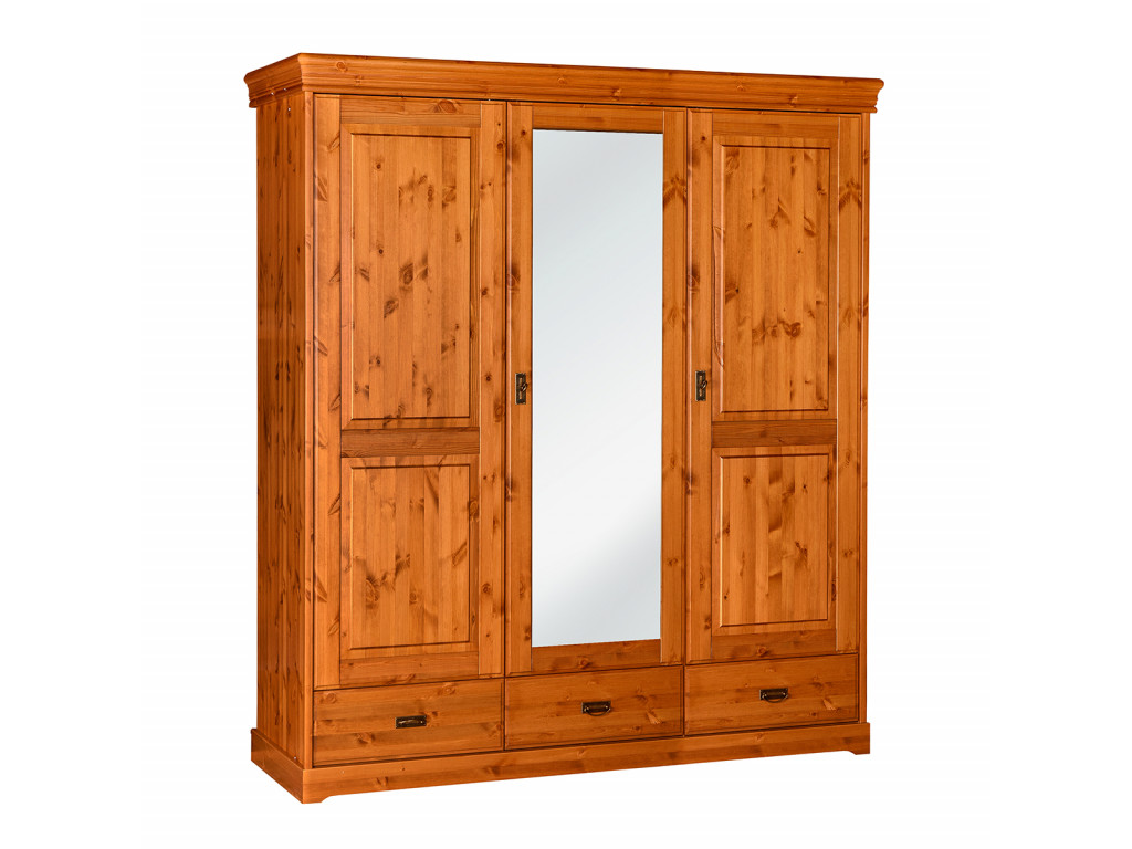 Šatníková 3-dverová skriňa z masívnej borovice zmodernizuje každú spálňu. Disponuje 5 policami, tyčou na zavesenie a 3 zásuvkami. Okrem toho očarí aj veľkým zrkadlom a rustikálnym dizajnom.
