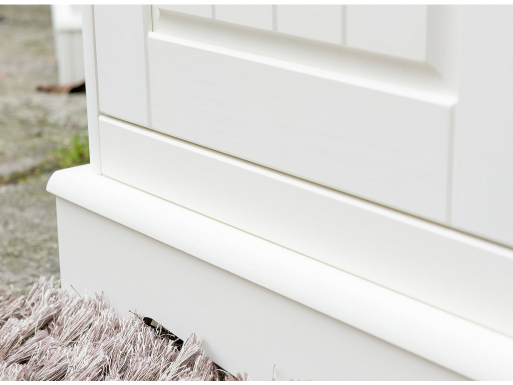 Vďaka svojmu jednoduchému tvaru a nadčasovej bielej farbe môže byť biela skriňa použitá ako šatník do spálne aj do predsiene. Drevená skriňa je ozdobená výkrojmi na dverách. Celok je doplnený postriebrenými úchytkami.
