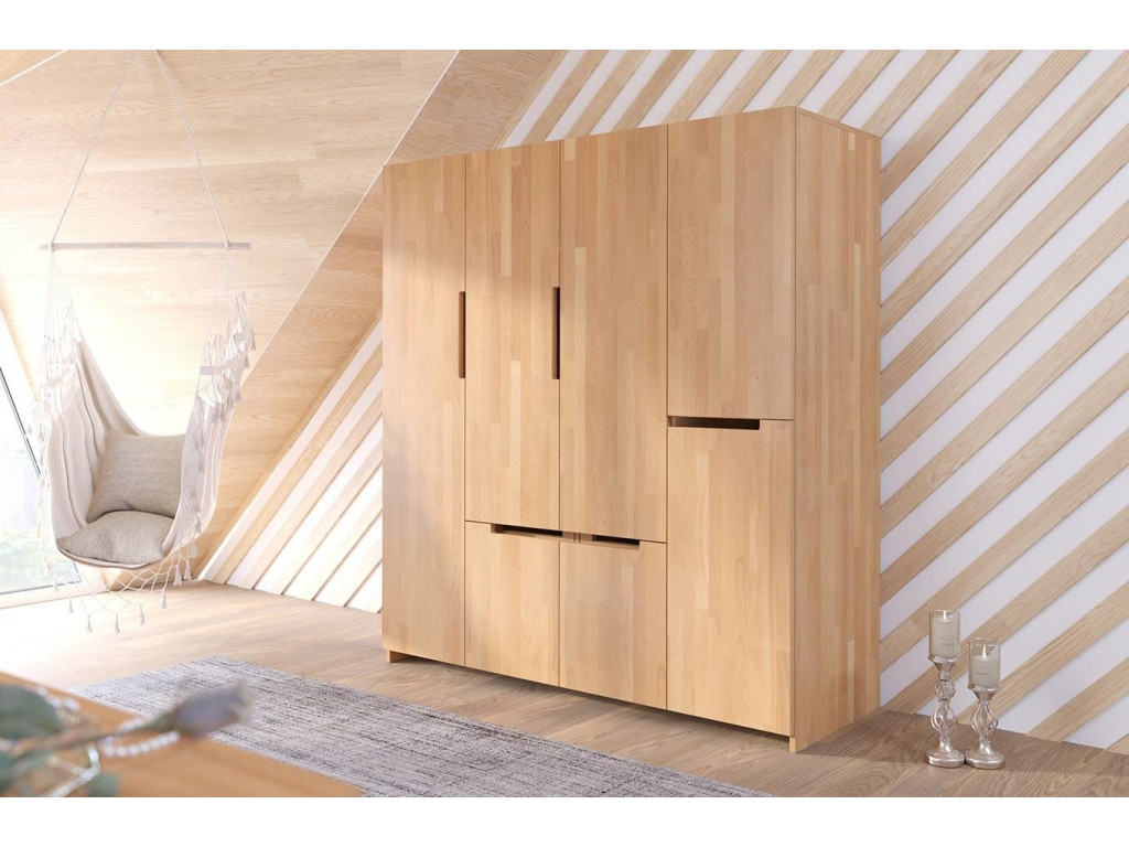 Bergman 4D5S je masívna skriňa z buku navrhnutá v minimalistickom dizajne. Disponuje až 4 dvierkami, za ktorými nájde budúci majiteľ dostatočný priestor na zavesenie všetkých odevov. Aby toho nebolo málo, tak dizajnéri pridali aj 5 priestranných zásuviek. Vybrať si môžete zo 6 farebných prevedení.