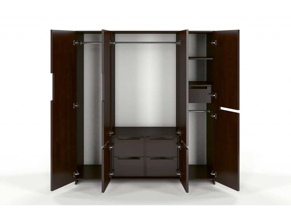 Šatníková skriňa z masívneho dreva ideálna do spálne, chodby alebo dokonca aj predsiene. Za jej dverami je priestor rozdelený na 3 časti s 3 tyčami, 2 policami a 5 zásuvkami. Originálnym a neobvyklým riešením je použitie samostatných a asymetricky usporiadaných dverí, ktoré uľahčujú prístup k zásuvkám a policiam bez nutnosti otvárania celej šatníkovej skrine. Ľahko v nej nájdete vhodné miesto na uloženie dlhých šiat a pánskych oblekov.