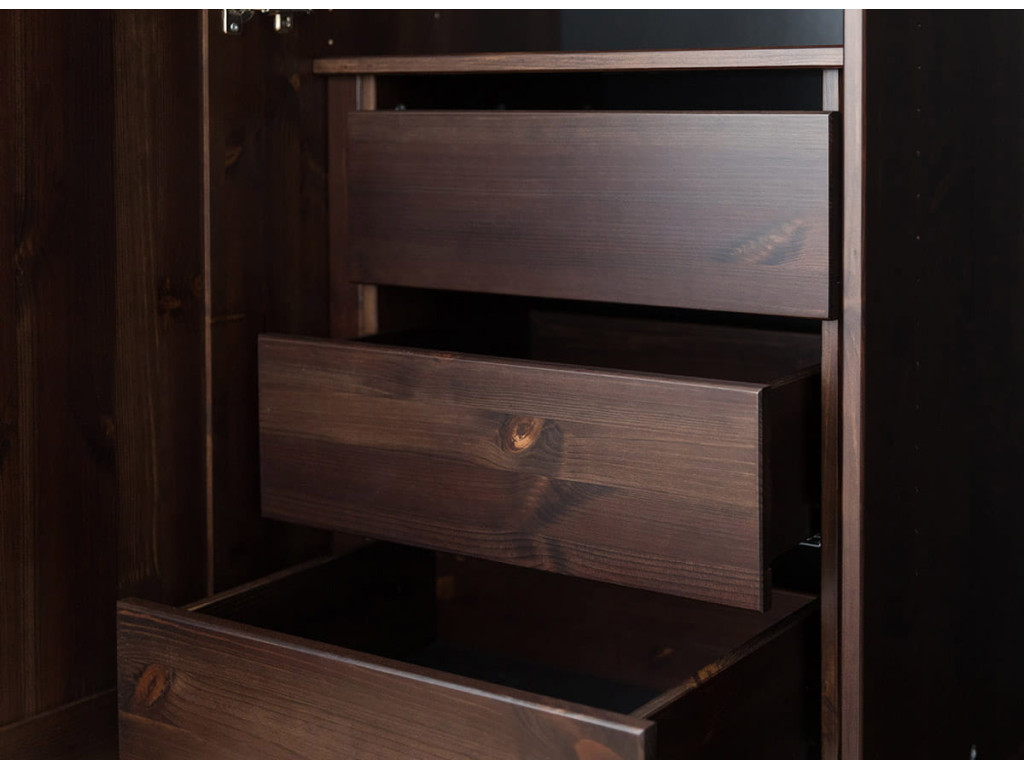 Úzky modul do šatníkovej skrine Rosella – 57 cm je navrhnutý ako súčasť modulárneho systému Rosella, ktorý umožňuje plne individuálne usporiadanie interiéru skrine. Vyrobený z masívnej borovice a ošetrený ekologickou farbou na vodnej báze so 70 % pokrytím, modul si zachováva prirodzenú kresbu dreva, ktorá podčiarkuje jeho rustikálny, no elegantný charakter. Teplý odtieň tabaku harmonicky ladí s ostatnými prvkami kolekcie.