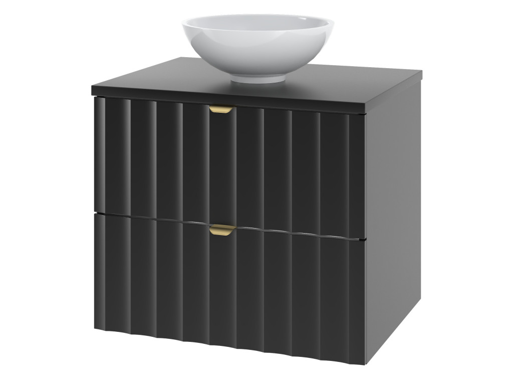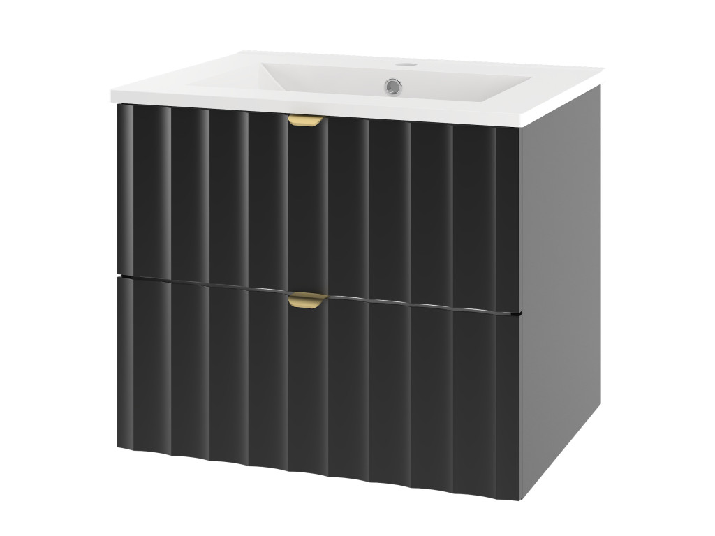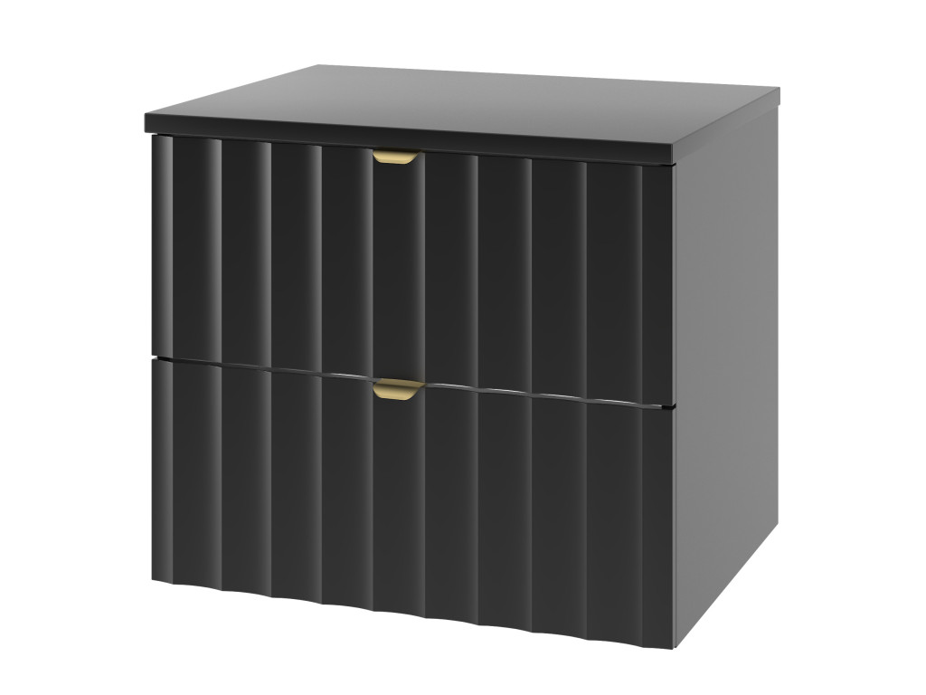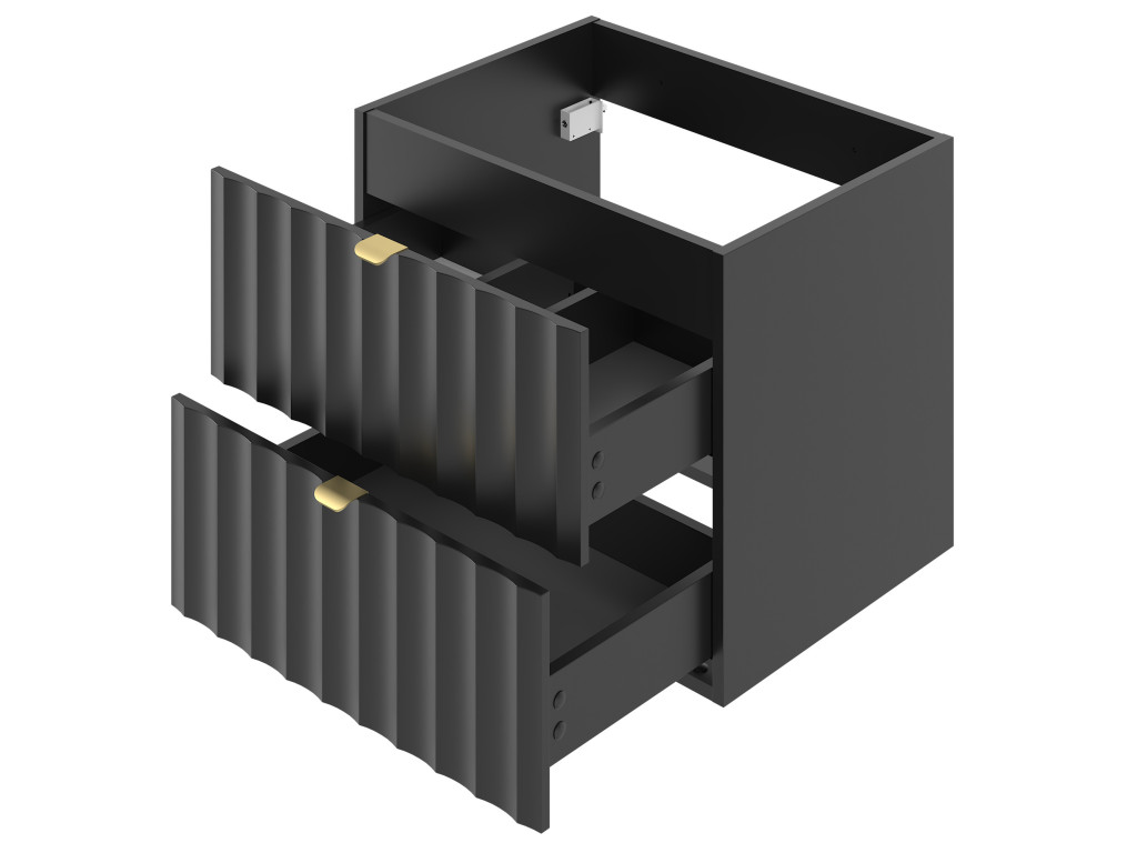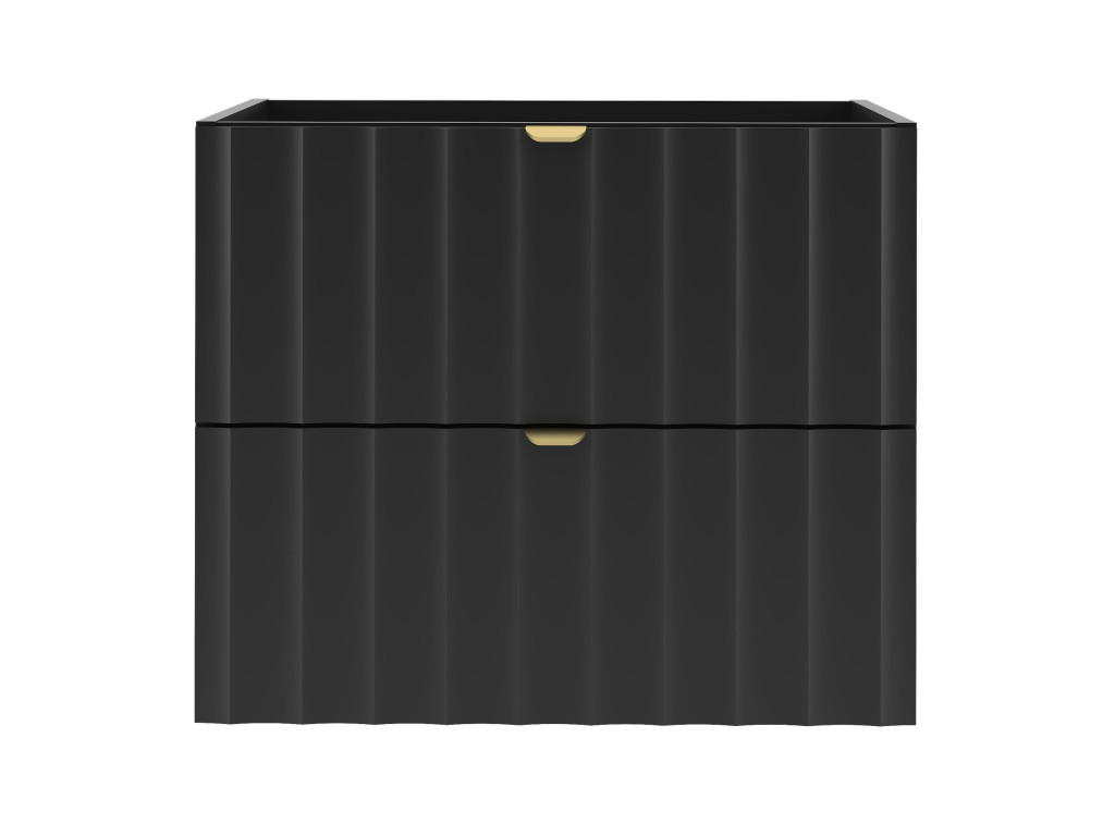 Kúpeľňová skrinka pod umývadlo Arkos 06 v matnej čiernej farbe so šírkou 60 cm a dvomi zásuvkami je perfektným doplnkom pre moderné kúpeľne. Profil vtlačených vĺn a zlaté kovové úchytky dodávajú skrinke elegantný a sofistikovaný vzhľad. Závesné prevedenie a praktický úložný priestor z nej robia funkčný aj estetický kúsok do vášho interiéru.