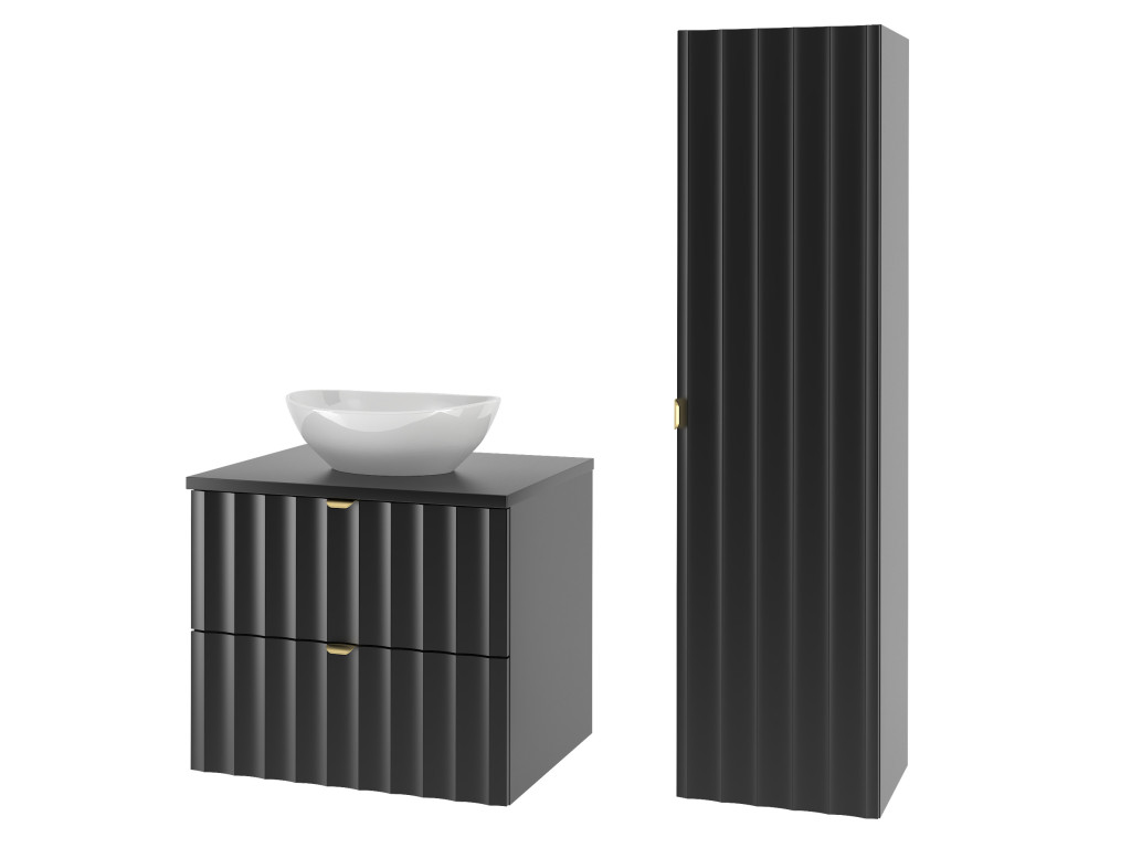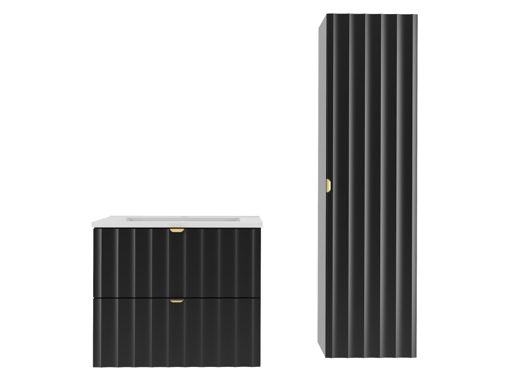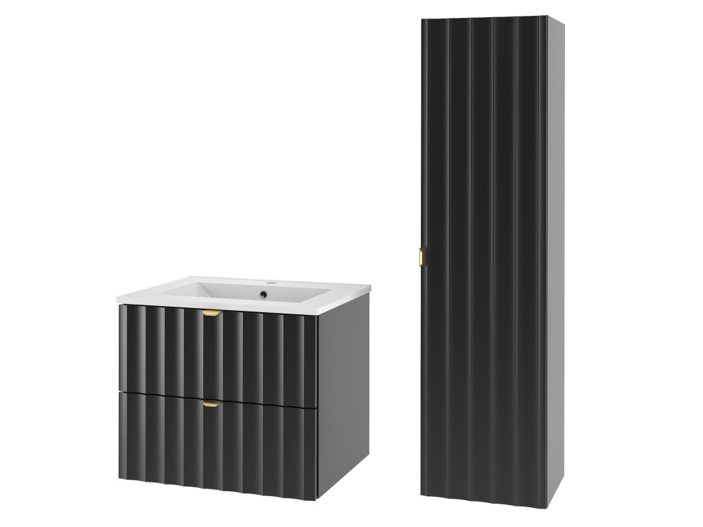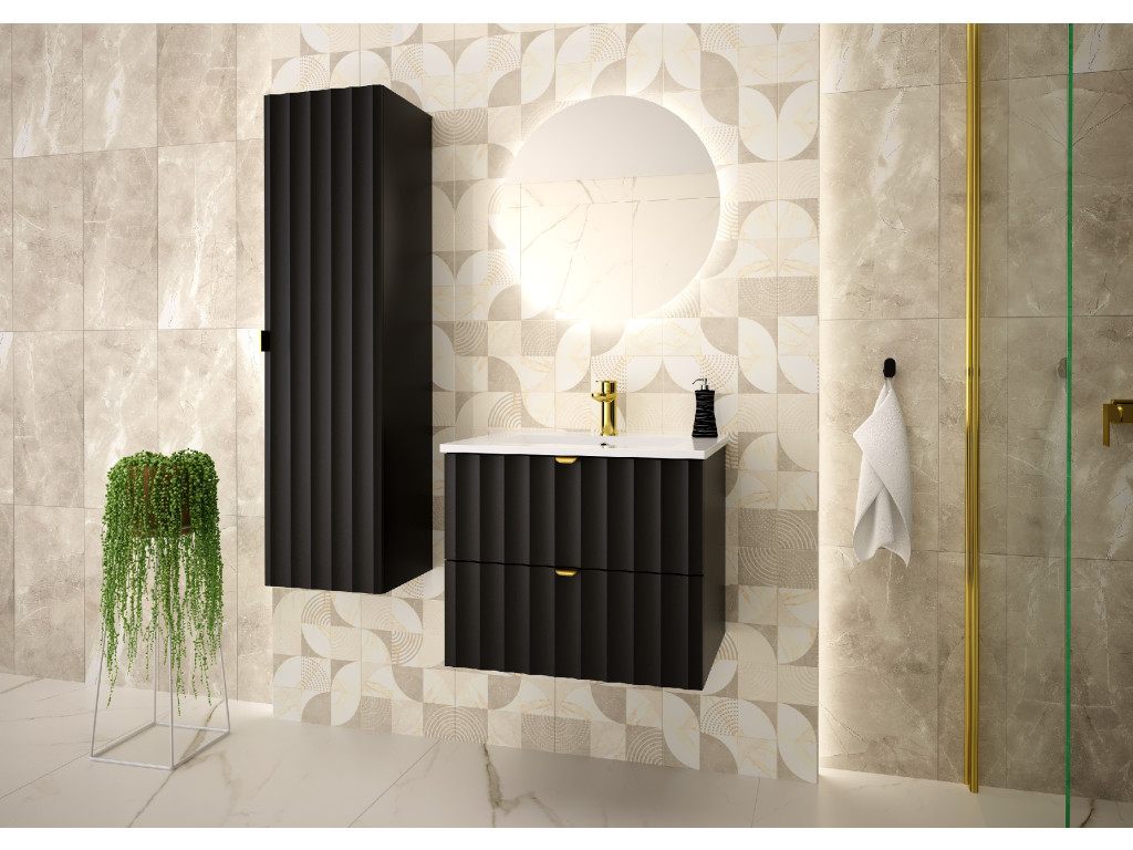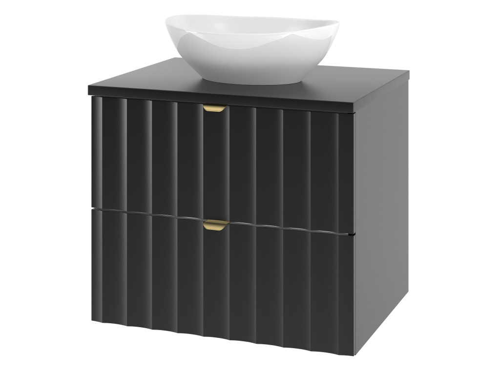 Kúpeľňová skrinka pod umývadlo Arkos 06 v matnej čiernej farbe so šírkou 60 cm a dvomi zásuvkami je perfektným doplnkom pre moderné kúpeľne. Profil vtlačených vĺn a zlaté kovové úchytky dodávajú skrinke elegantný a sofistikovaný vzhľad. Závesné prevedenie a praktický úložný priestor z nej robia funkčný aj estetický kúsok do vášho interiéru.