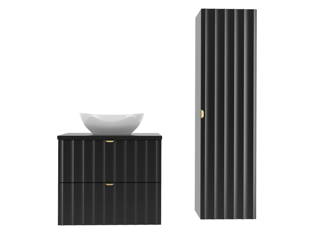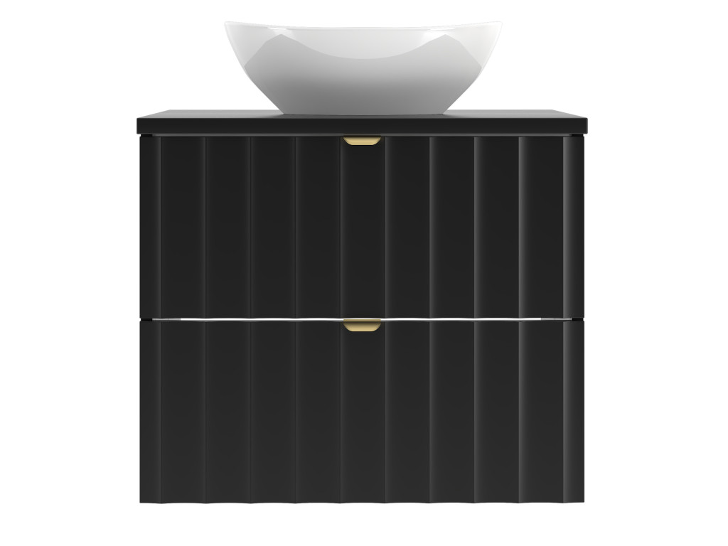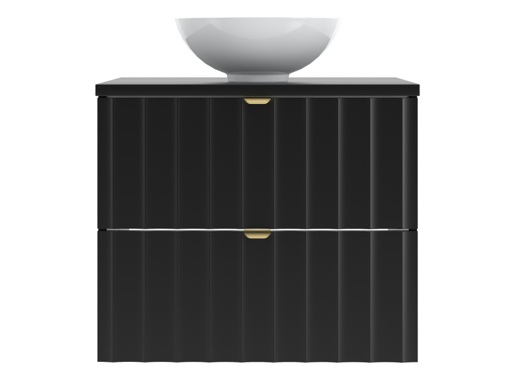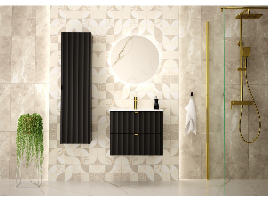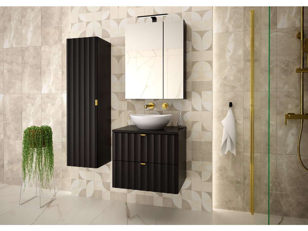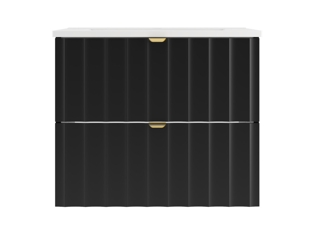 Kúpeľňová skrinka Arkos 06 z kolekcie Arkos v matnej čiernej farbe je dokonalým spojením estetiky a praktickosti. So šírkou 60 cm a dvomi priestrannými zásuvkami ponúka dostatok úložného priestoru na všetko potrebné v kúpeľni. Profil vtlačených vĺn na čelách zásuviek a zlaté kovové úchytky dodávajú skrinke jedinečný a elegantný charakter, zatiaľ čo závesné prevedenie zaisťuje vzdušný a moderný vzhľad.