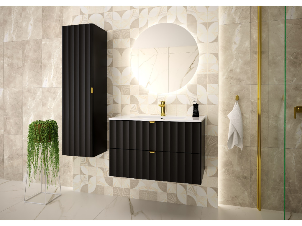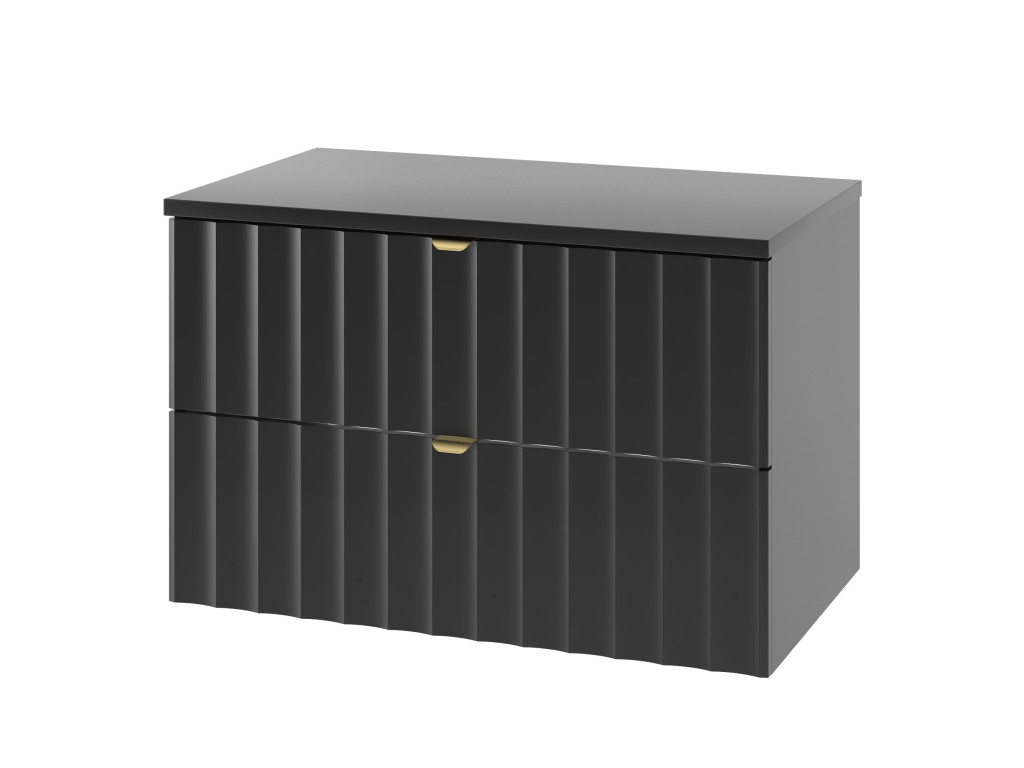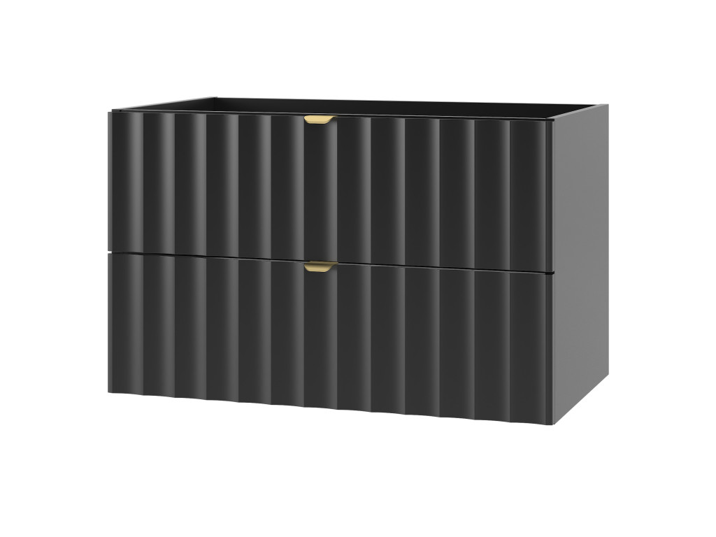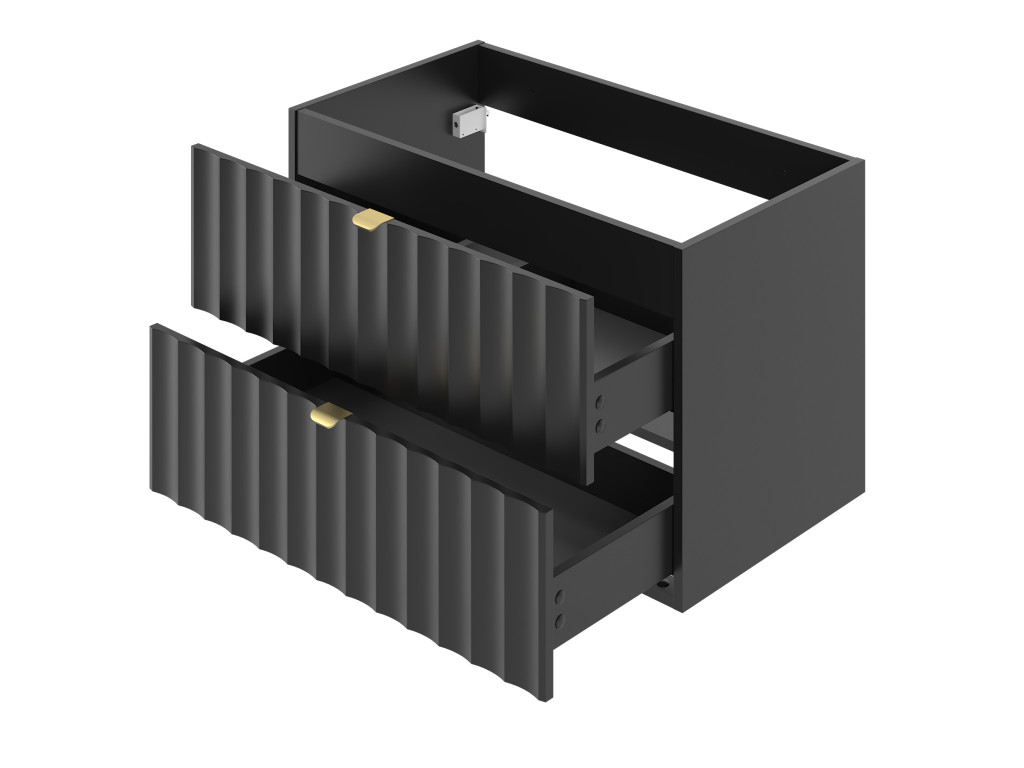 Kúpeľňová skrinka Arkos 07 v matnej čiernej farbe so šírkou 80 cm a dvomi zásuvkami ponúka štýlové riešenie pre moderné kúpeľne. Dostupná v štyroch variantoch: bez dosky, so vrchnou doskou, s umývadlom na dosku alebo so zápustným umývadlom, prispôsobí sa vašim potrebám. Profil vtlačených vĺn a zlaté kovové úchytky dodávajú luxusný vzhľad, zatiaľ čo závesné prevedenie podčiarkuje čisté línie a vzdušnosť interiéru.