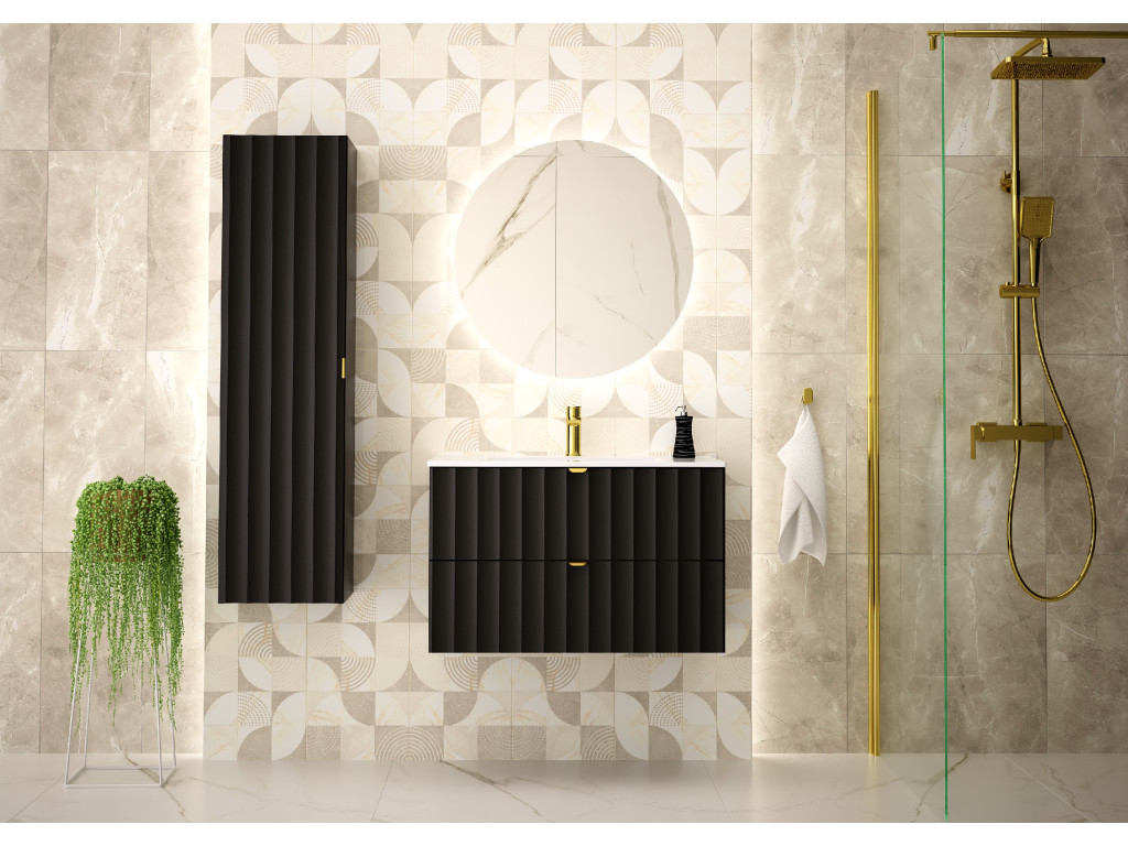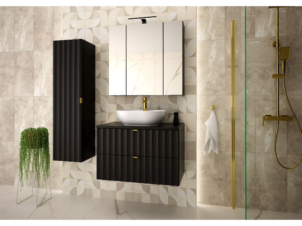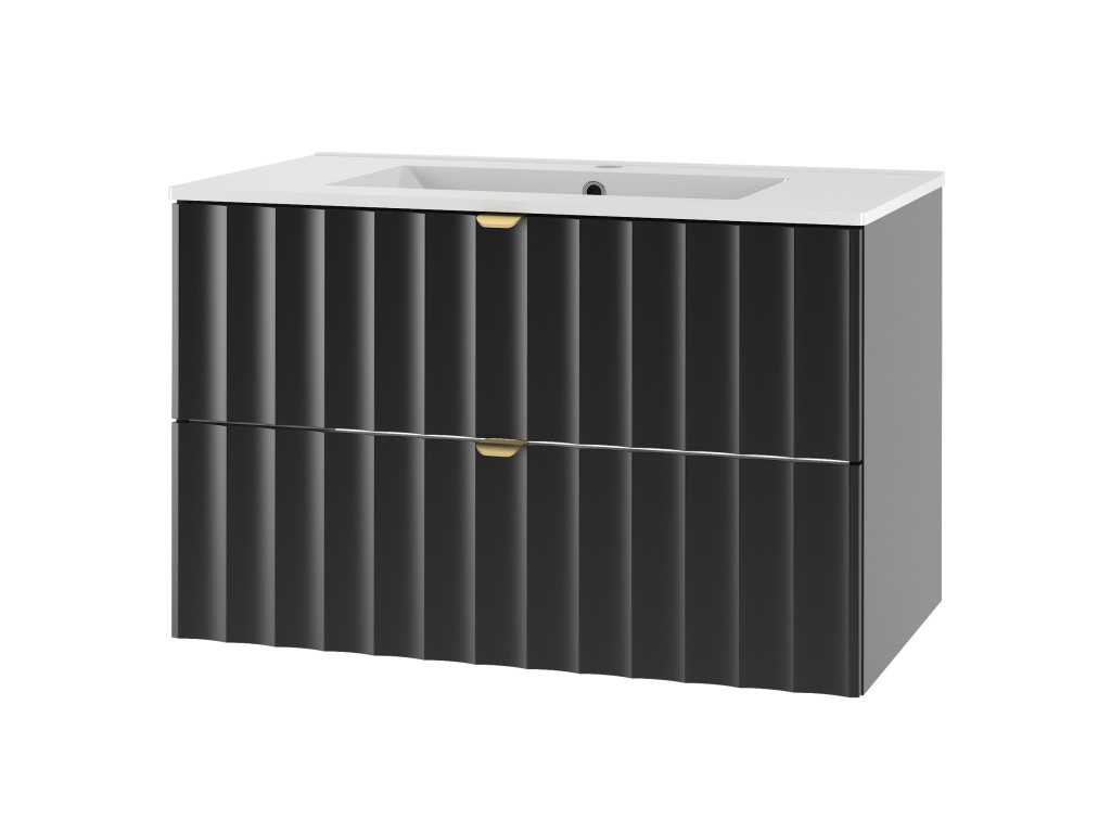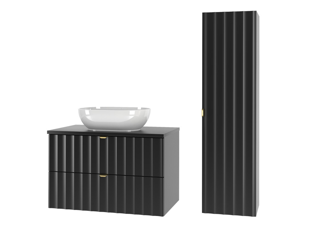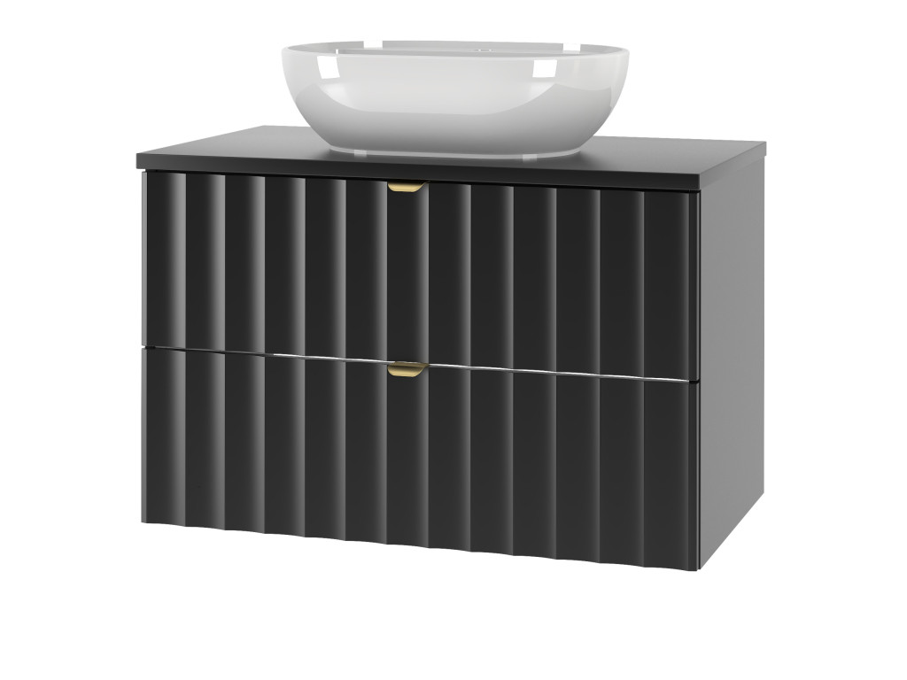 Kúpeľňová skrinka Arkos 07 v matnej čiernej farbe so šírkou 80 cm a dvomi zásuvkami ponúka štýlové riešenie pre moderné kúpeľne. Dostupná v štyroch variantoch: bez dosky, so vrchnou doskou, s umývadlom na dosku alebo so zápustným umývadlom, prispôsobí sa vašim potrebám. Profil vtlačených vĺn a zlaté kovové úchytky dodávajú luxusný vzhľad, zatiaľ čo závesné prevedenie podčiarkuje čisté línie a vzdušnosť interiéru.