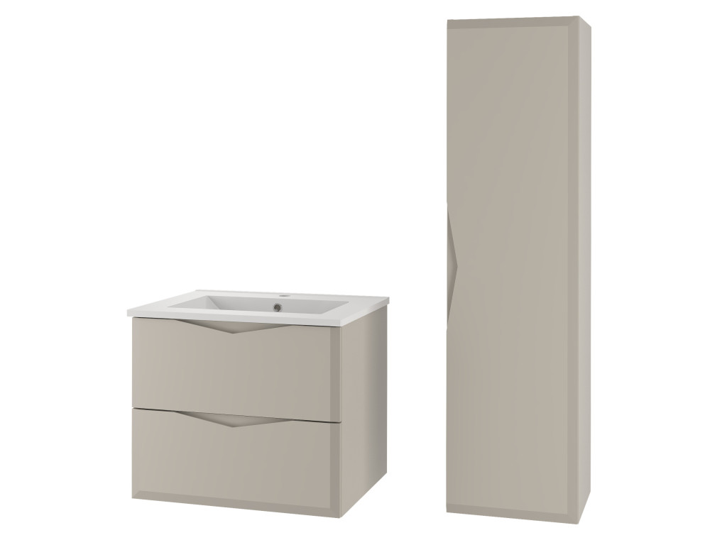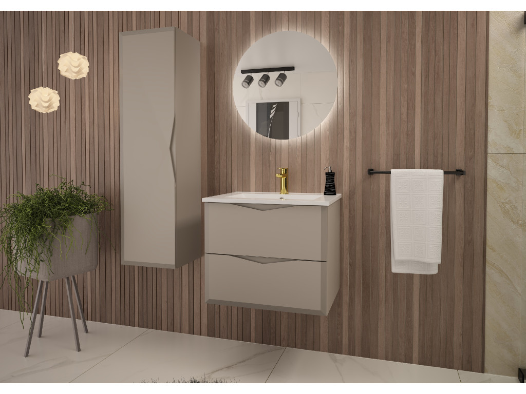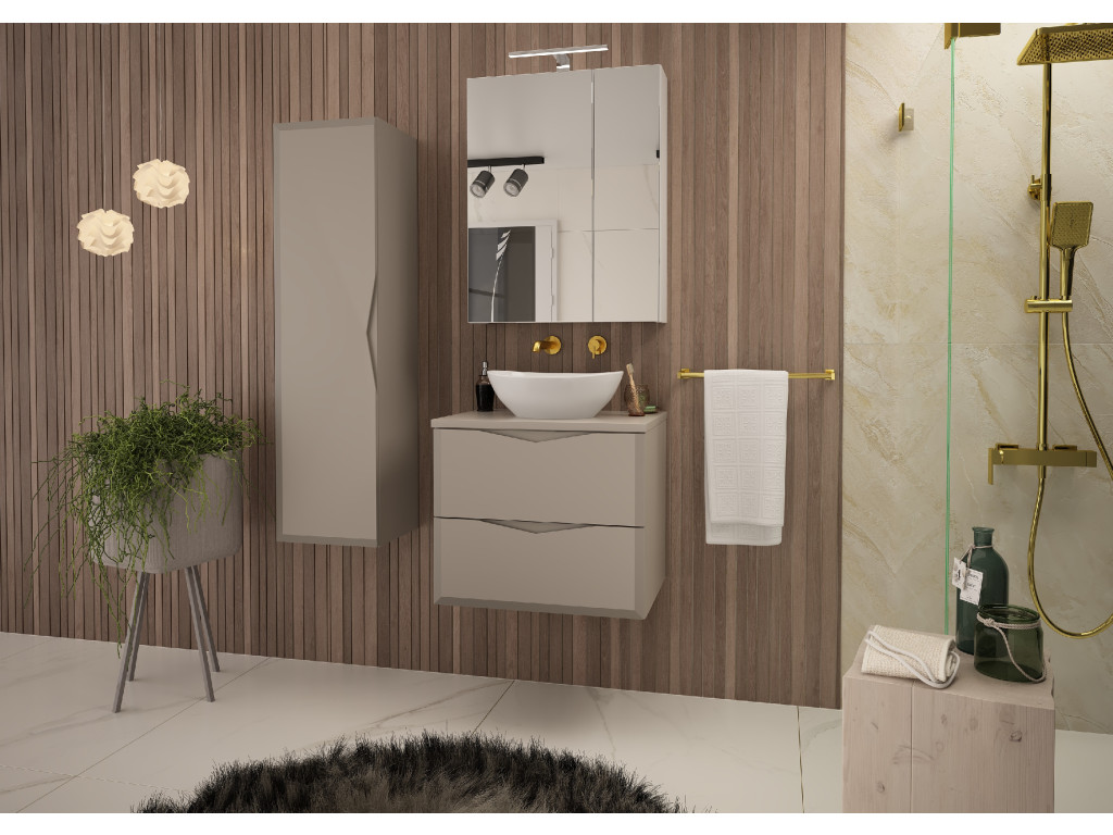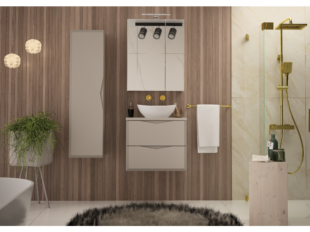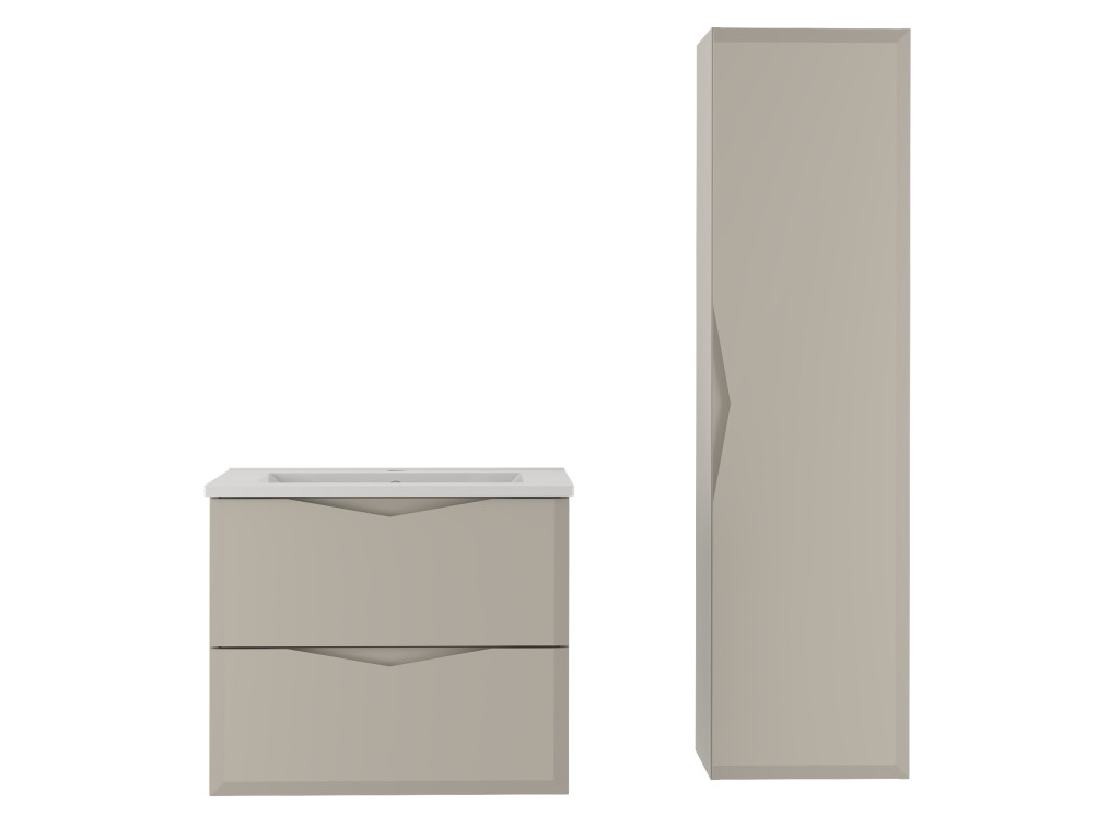 Delica 02 ponúka dve zásuvky s čiastočným výsuvom, tichým dovieraním a bezúchytkovým riešením, vďaka frézovaným úchytom priamo na dvierkach. Béžové matné prevedenie a elegantne zrezané hrany na frontoch vytvárajú luxusný vzhľad, ktorý sa stane dominantou každej modernej kúpeľne. Skrinka je závesná, čím šetrí priestor a uľahčuje udržiavanie čistoty. Na výber sú štyri varianty – bez dosky, s doskou, so zapusteným umývadlom alebo s umývadlom na dosku.
