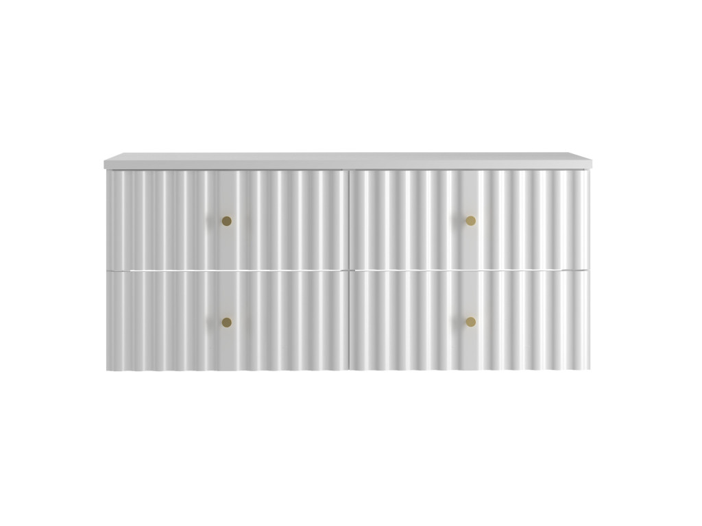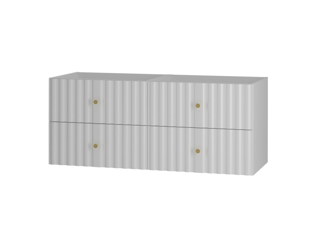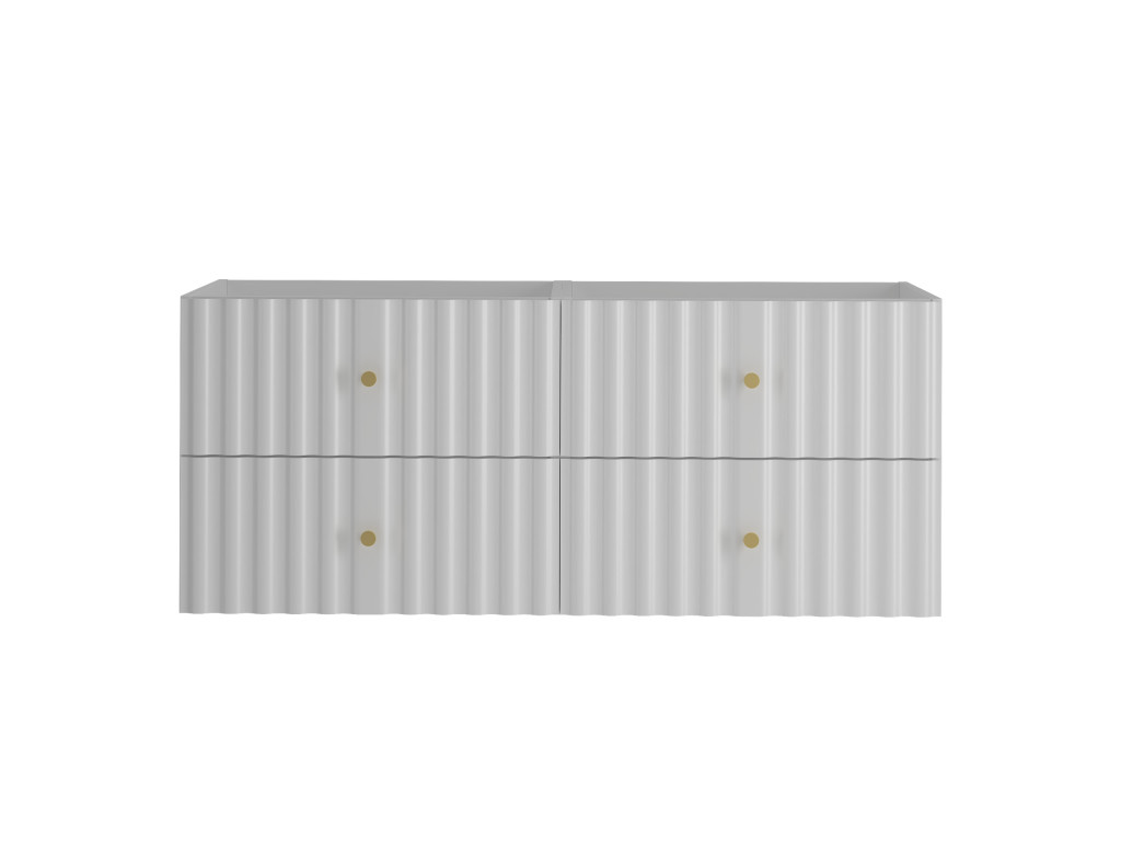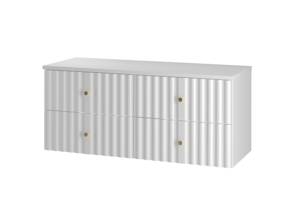 Široká skrinka Aqua 02 120 v matnej bielej farbe spája moderný dizajn a praktický úložný priestor. Vytvorená spojením dvoch skriniek 60 cm s celistvou doskou 120 cm, ponúka štyri zásuvky a možnosť výberu: bez dosky, s vrchnou doskou, s umývadlami na dosku alebo so zápustným umývadlom. Vlnovitý profil dvierok a zlaté úchytky podčiarkujú jej sofistikovaný vzhľad, ktorý oživí každú kúpeľňu.