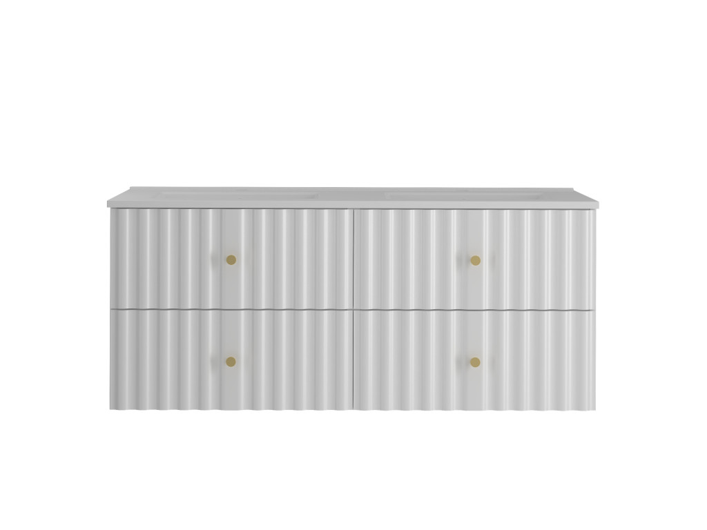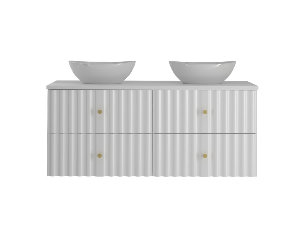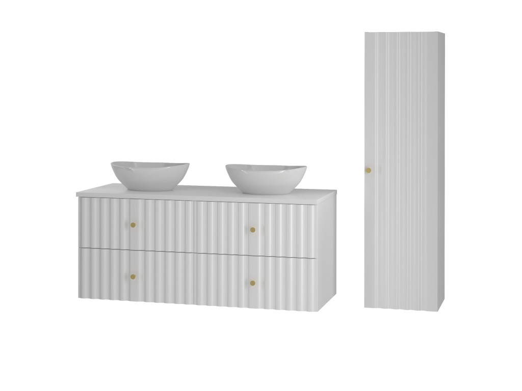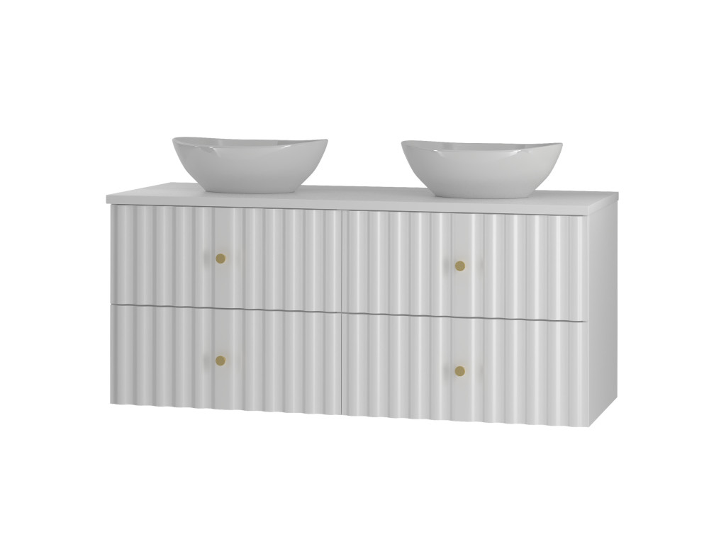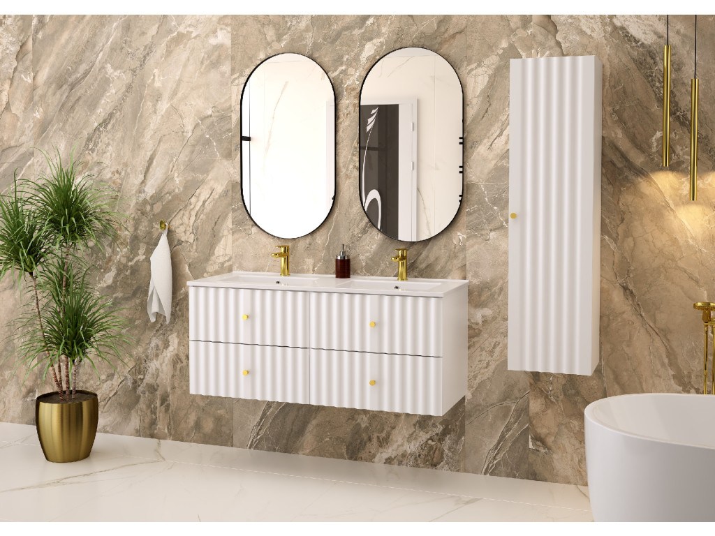 Široká skrinka Aqua 02 120 v matnej bielej farbe spája moderný dizajn a praktický úložný priestor. Vytvorená spojením dvoch skriniek 60 cm s celistvou doskou 120 cm, ponúka štyri zásuvky a možnosť výberu: bez dosky, s vrchnou doskou, s umývadlami na dosku alebo so zápustným umývadlom. Vlnovitý profil dvierok a zlaté úchytky podčiarkujú jej sofistikovaný vzhľad, ktorý oživí každú kúpeľňu.