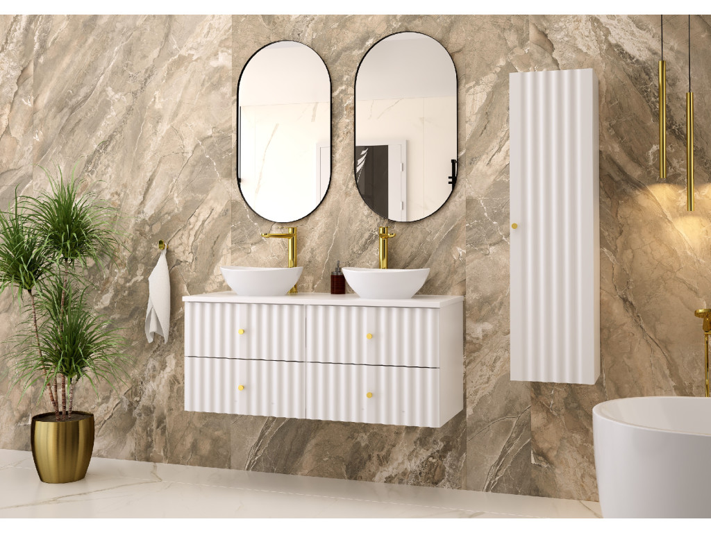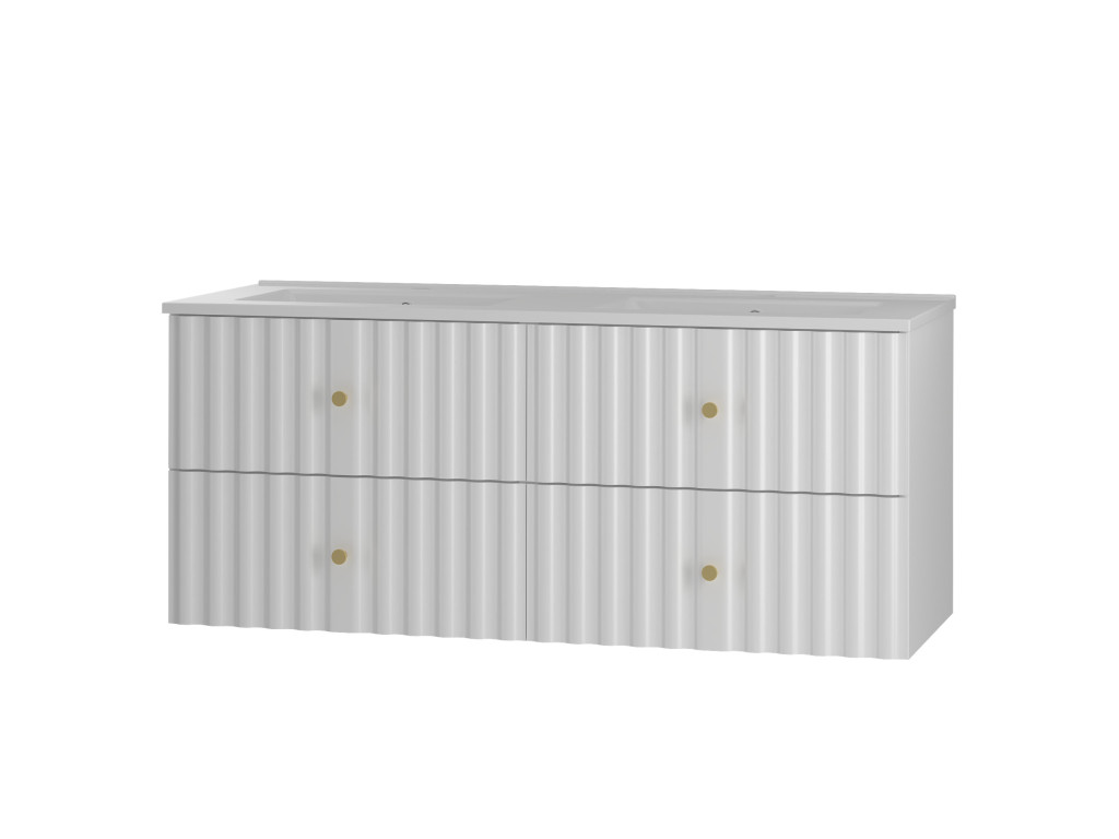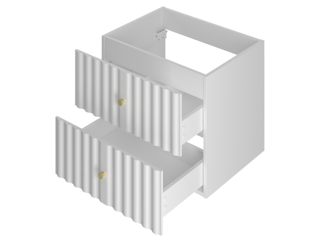 Závesné prevedenie, vlnovitý profil dvierok a štýlové zlaté úchytky v tvare guličiek dodávajú skrinke elegantný a nadčasový vzhľad, ktorý je ideálny pre každú modernú kúpeľňu.