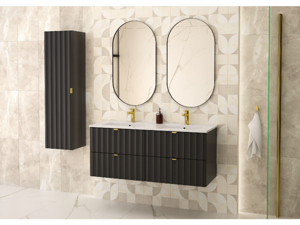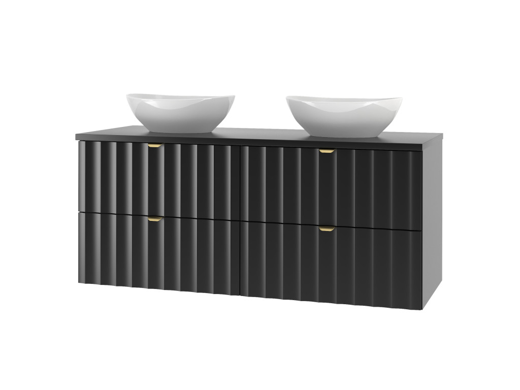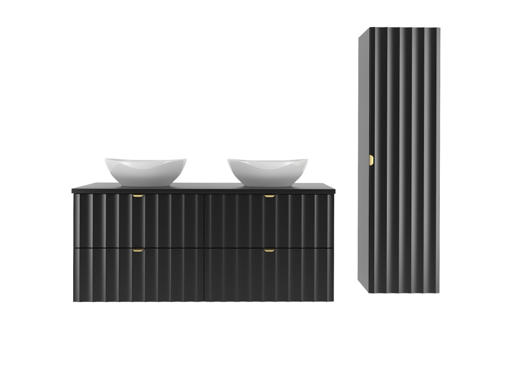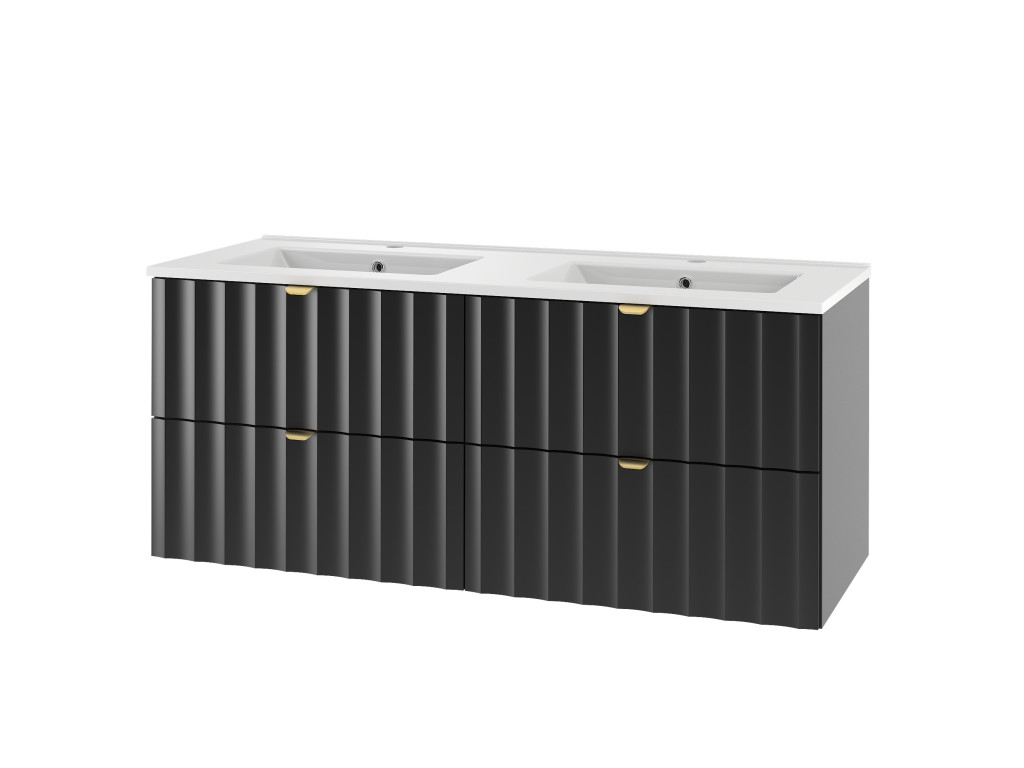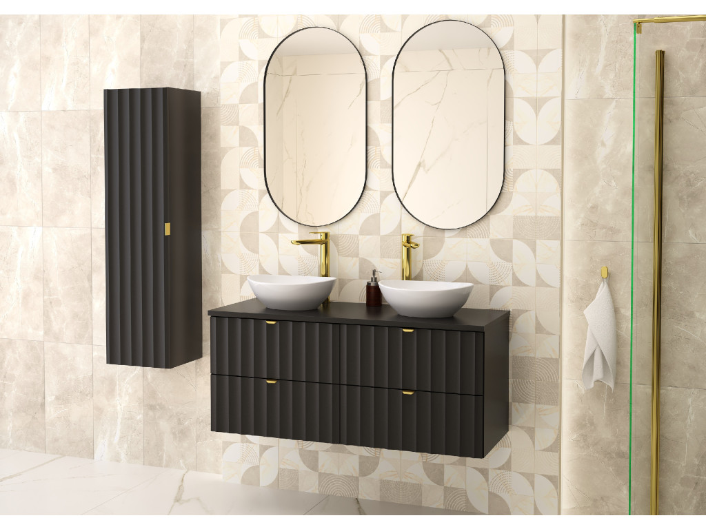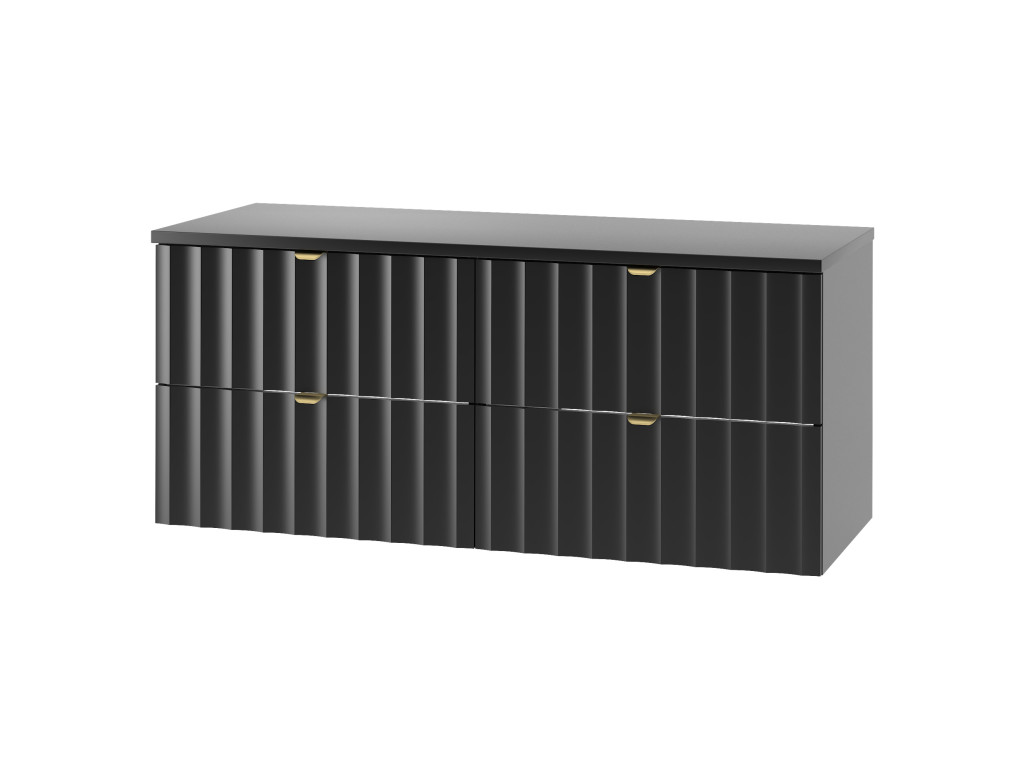 Široká kúpeľňová skrinka Arkos 06 120 v matnej čiernej farbe kombinuje moderný dizajn a praktický úložný priestor so štyrmi zásuvkami. Spája dve 60 cm skrinky a je dostupná v troch variantoch: s vrchnou doskou, s umývadlom na dosku alebo so zápustným umývadlom. Profil vtlačených vĺn a zlaté kovové úchytky dodávajú sofistikovaný vzhľad, zatiaľ čo závesné prevedenie podčiarkuje moderný štýl a vzdušnosť priestoru.