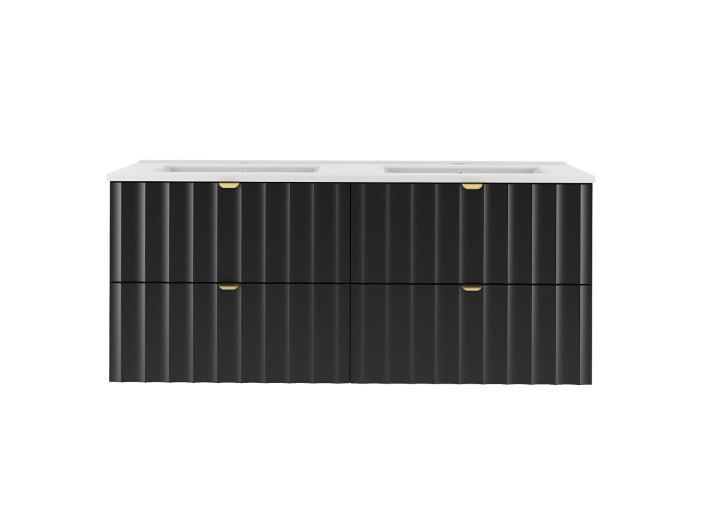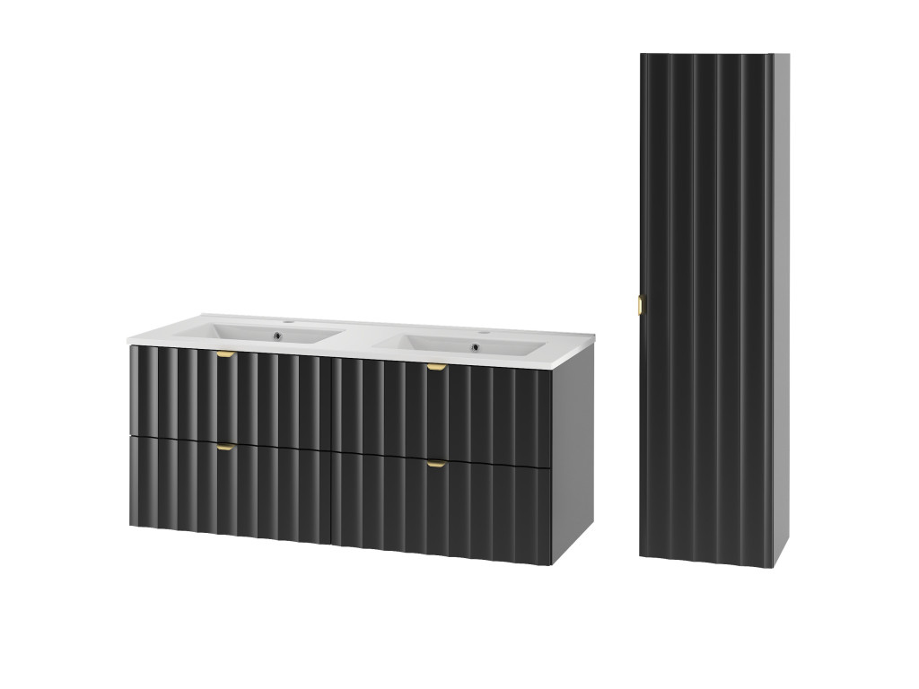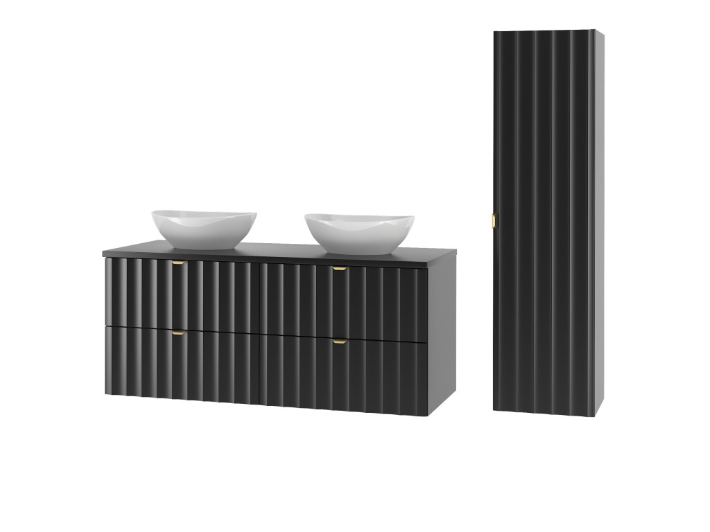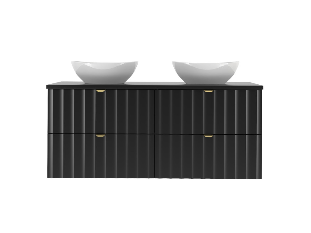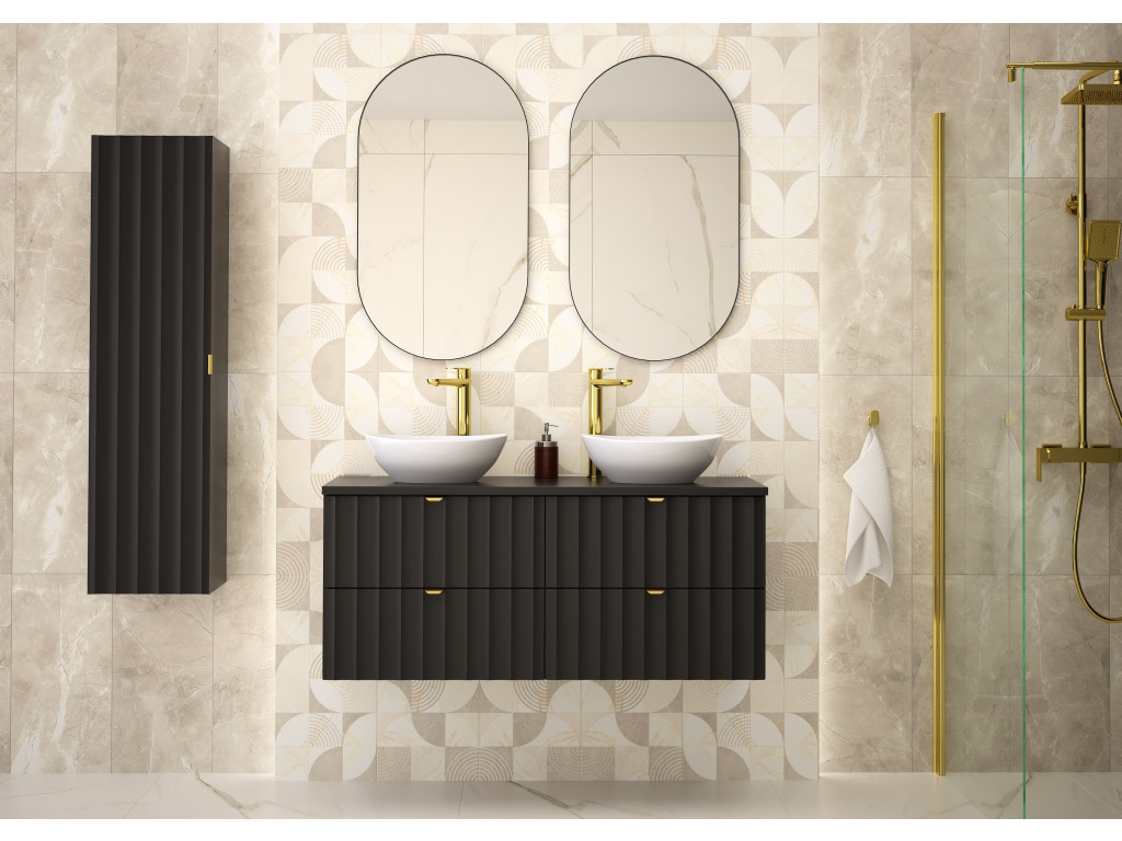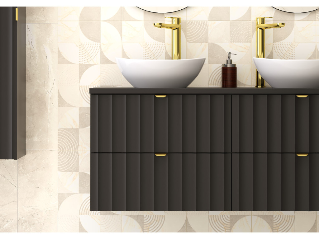 Široká kúpeľňová skrinka Arkos 06 120 v matnej čiernej farbe kombinuje moderný dizajn a praktický úložný priestor so štyrmi zásuvkami. Spája dve 60 cm skrinky a je dostupná v troch variantoch: s vrchnou doskou, s umývadlom na dosku alebo so zápustným umývadlom. Profil vtlačených vĺn a zlaté kovové úchytky dodávajú sofistikovaný vzhľad, zatiaľ čo závesné prevedenie podčiarkuje moderný štýl a vzdušnosť priestoru.