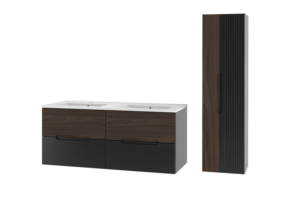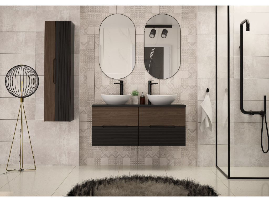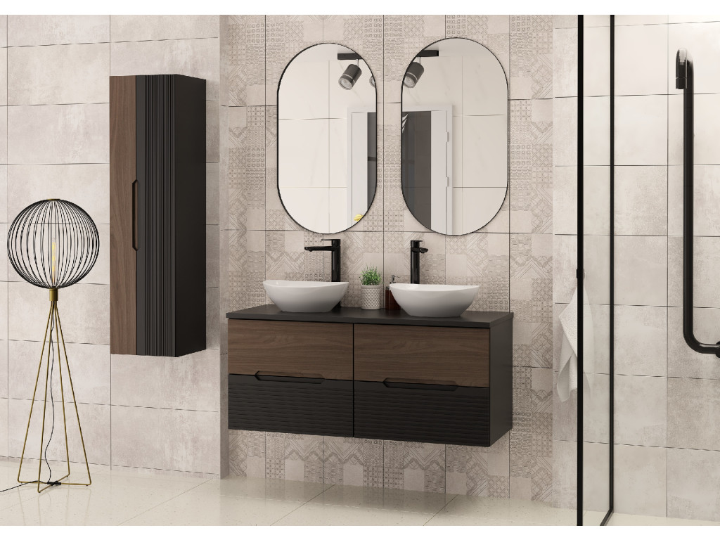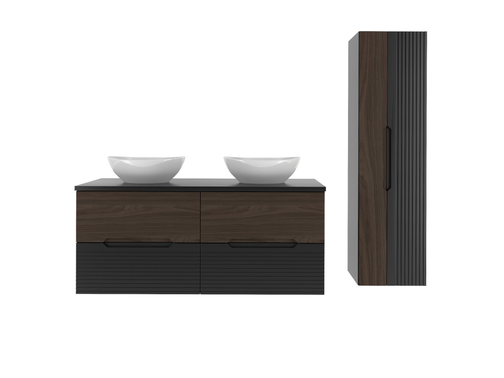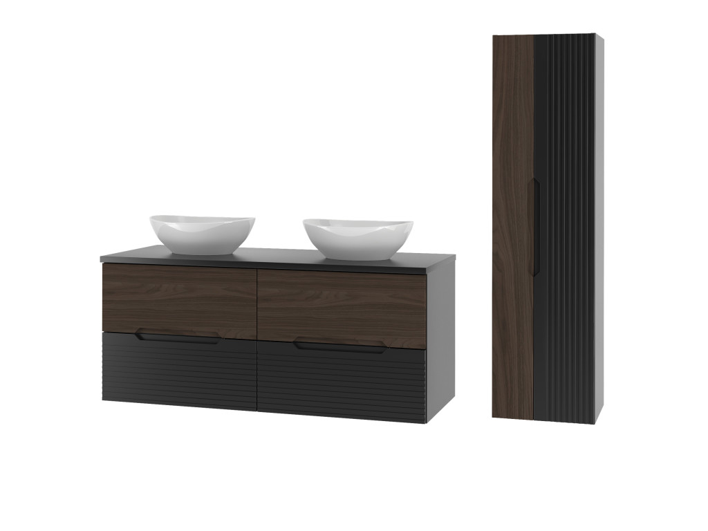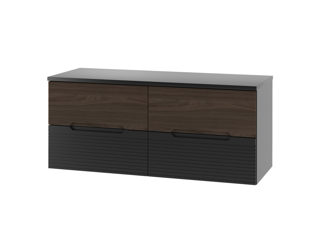 Široká skrinka Avela 02 120 spája orechový dekor na horných zásuvkách s matnou čiernou a vodorovnými zárezmi na spodných zásuvkách. So šírkou 120 cm a štyrmi zásuvkami je dostupná v troch variantoch – s vrchnou doskou, s umývadlami na dosku alebo so zápustným umývadlom. Elegantná kombinácia čiernej a orecha s dôrazom na čistý dizajn robí z tejto skrinky ideálny doplnok pre každú modernú kúpeľňu.
