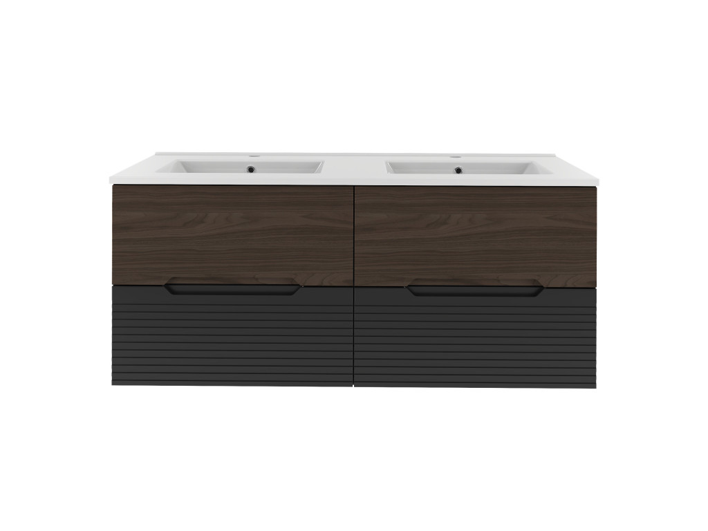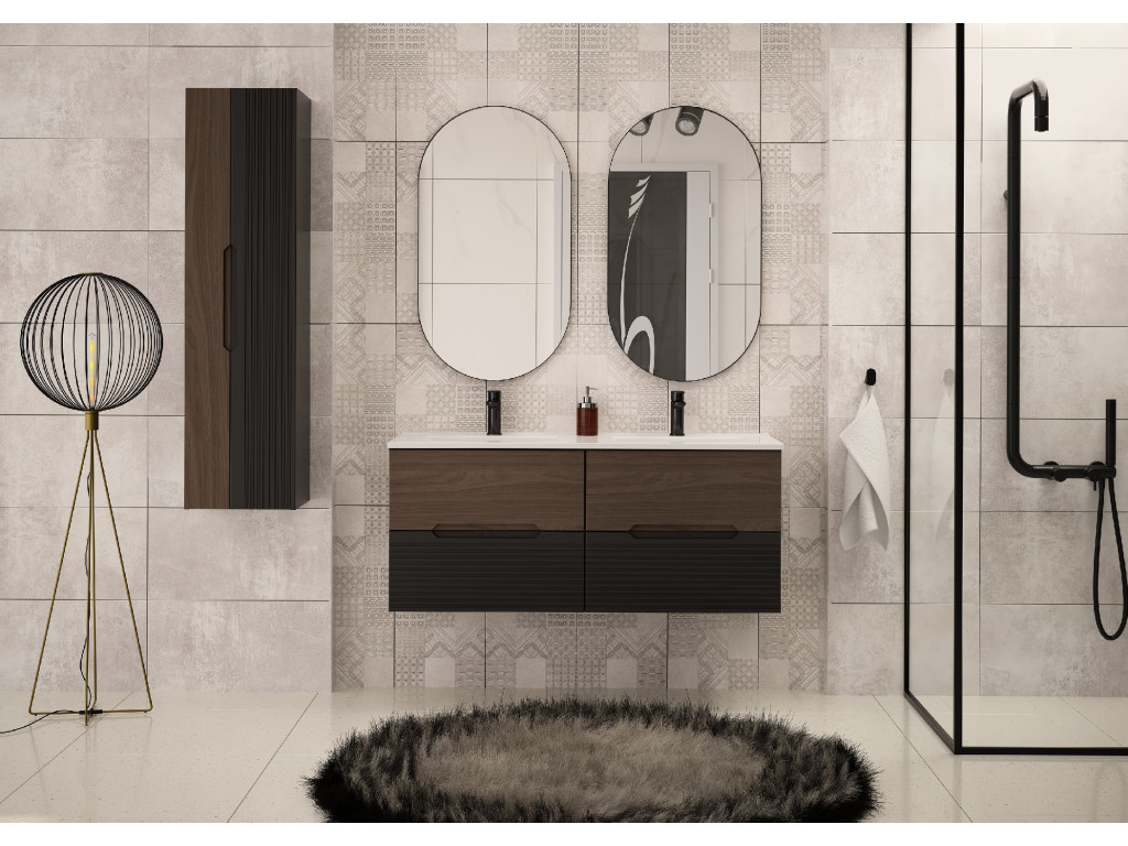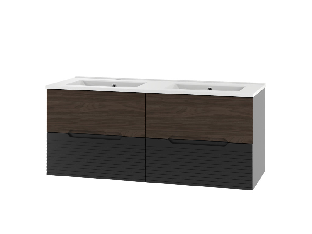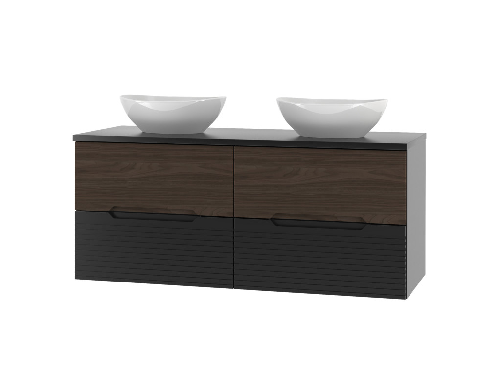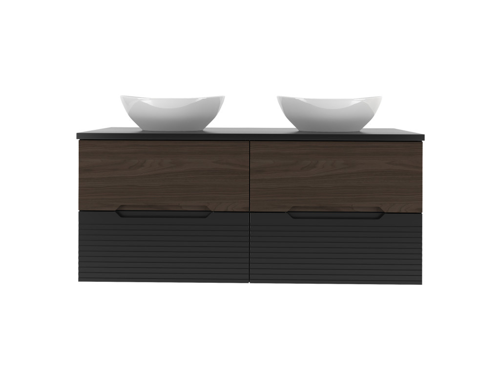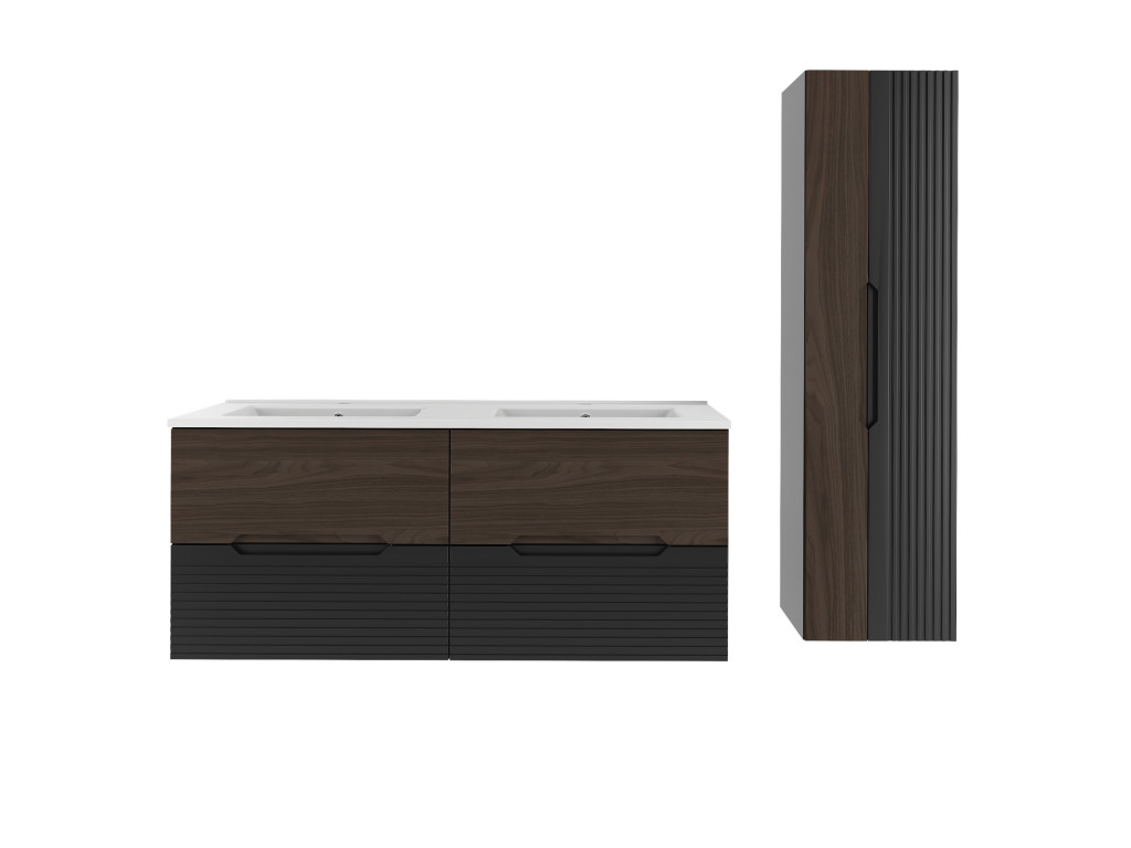 Široká skrinka Avela 02 120 spája orechový dekor na horných zásuvkách s matnou čiernou a vodorovnými zárezmi na spodných zásuvkách. So šírkou 120 cm a štyrmi zásuvkami je dostupná v troch variantoch – s vrchnou doskou, s umývadlami na dosku alebo so zápustným umývadlom. Elegantná kombinácia čiernej a orecha s dôrazom na čistý dizajn robí z tejto skrinky ideálny doplnok pre každú modernú kúpeľňu.