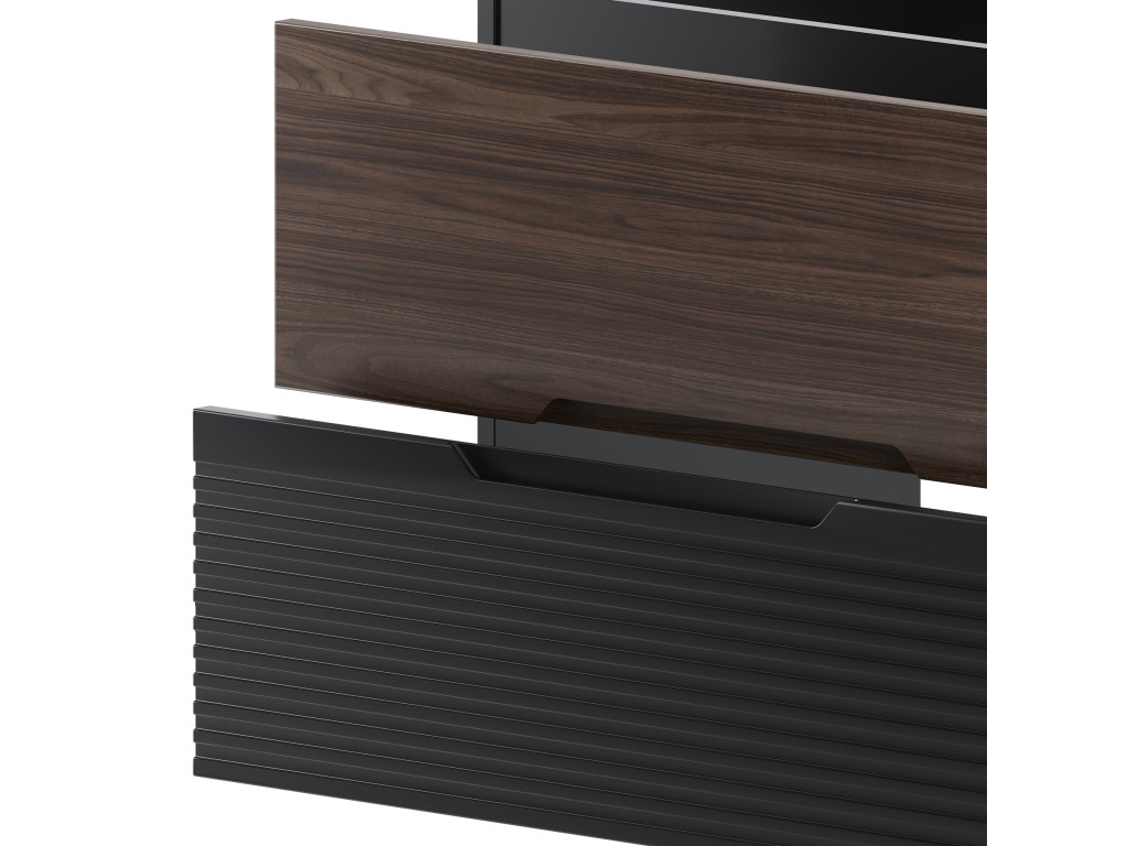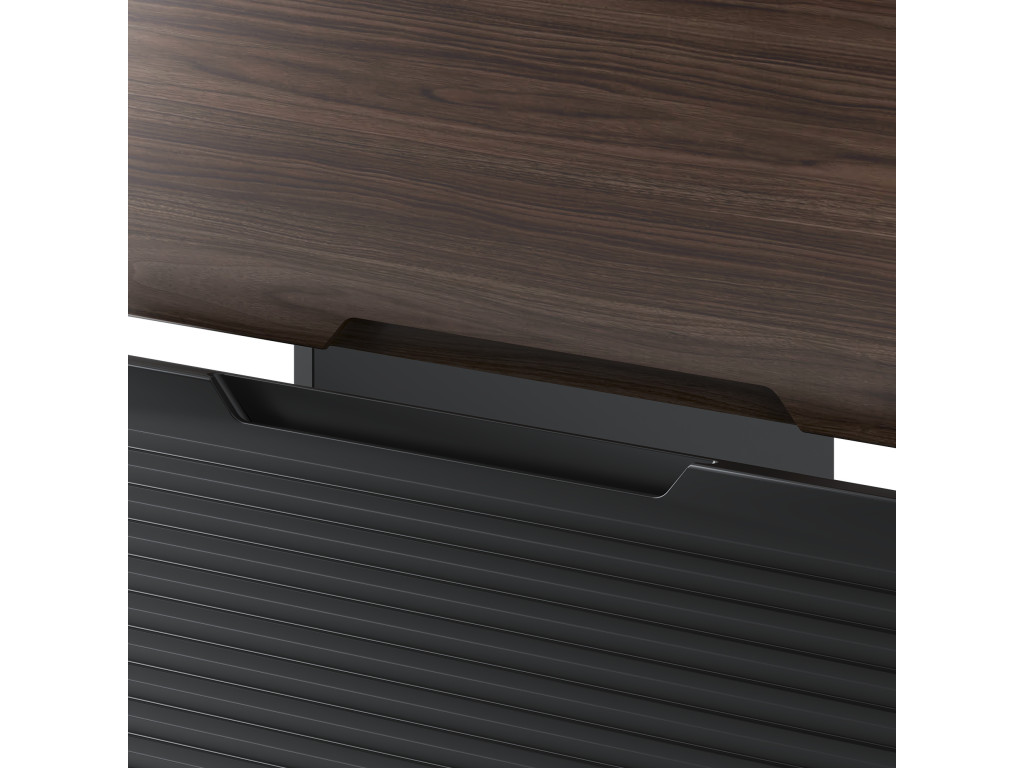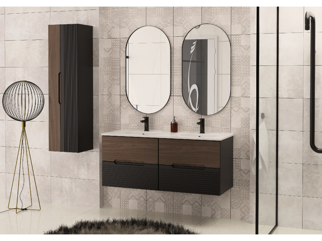 Široká kúpeľňová skrinka pod umývadlo Avela 02 120 z kolekcie Avela kombinuje sofistikovanú matnú čiernu s prírodným orechovým dekorom, čím vytvára moderný a luxusný vzhľad. Skrinka je vytvorená spojením dvoch 60 cm širokých skriniek, pričom ponúka štyri priestranné zásuvky. Horné zásuvky sú v orechovom dekore, spodné v čiernej farbe so vodorovnými zárezmi, ktoré pridávajú dizajnu dynamiku a čistotu.