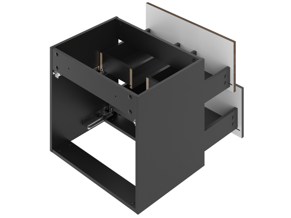 Skrinka je dostupná v troch variantoch: so vrchnou doskou, s umývadlami na dosku alebo so zápustným umývadlom, čo umožňuje prispôsobenie podľa vašich potrieb. Vyrobená je z kvalitných materiálov – laminovaná DTD (16 mm) na korpuse a fóliovaná MDF (18 mm) na čelách – a je navrhnutá tak, aby odolávala vlhkým podmienkam kúpeľne. Závesné prevedenie a tiché dovieranie robia z tejto skrinky ideálne riešenie pre moderné kúpeľne.