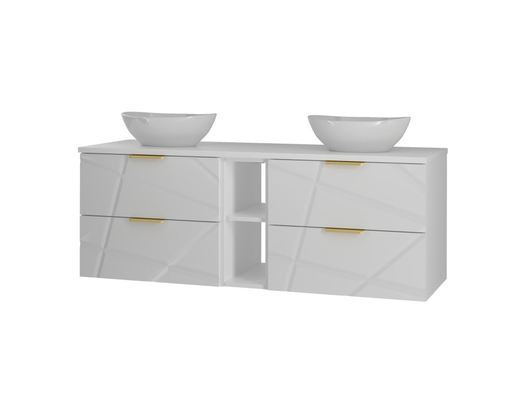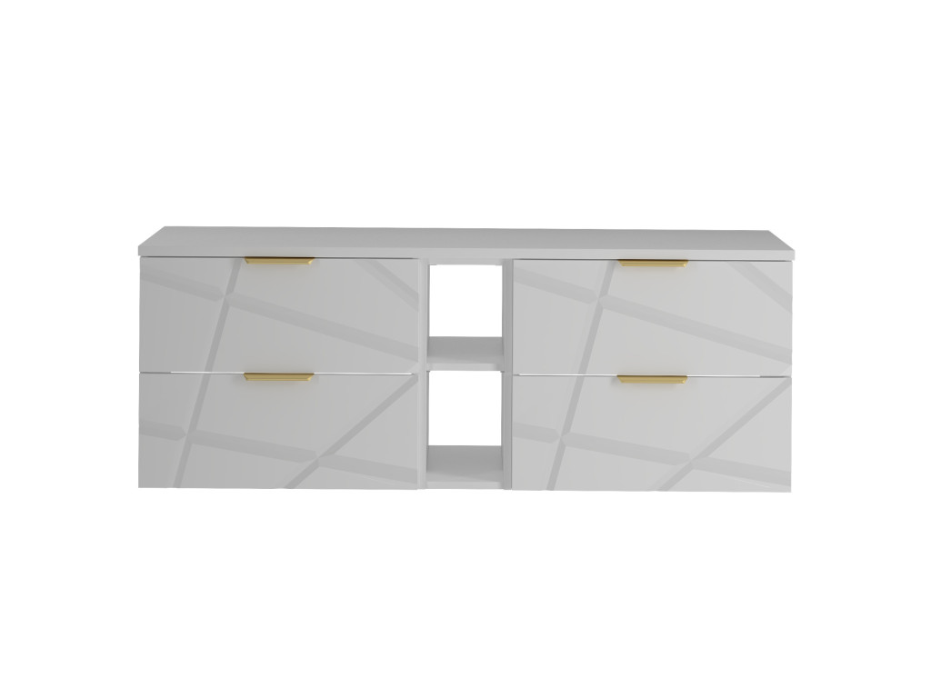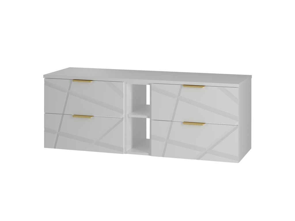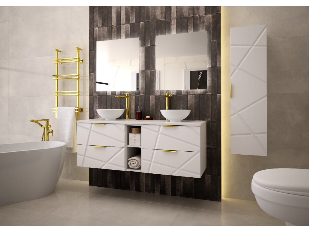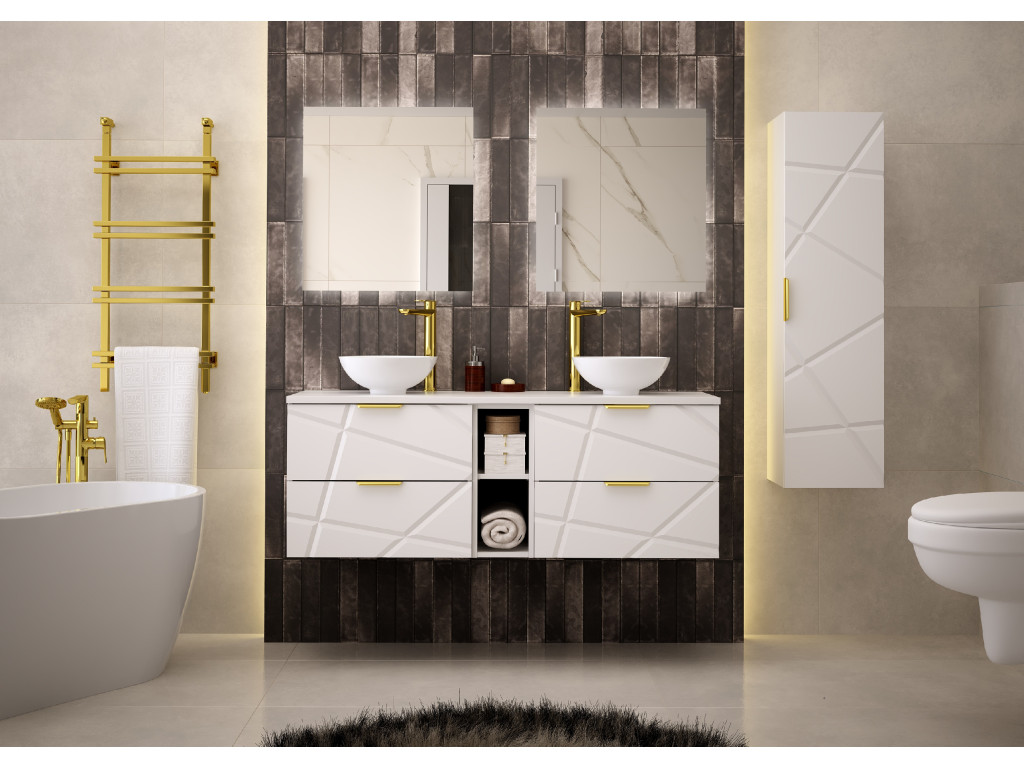 Zaobstarajte si skrinku pod umývadlo s otvorenou policou Radan 07 so šírkou 140 cm a štyrmi zásuvkami s čiastočným výsuvom a tichým dovieraním. Unikátne nepravidelné zárezy na frontoch a zlaté kovové úchytky prinesú vašej kúpeľni sofistikovaný dizajn. Dostupná je v dvoch variantoch – s vrchnou doskou alebo umývadlami na dosku. Ideálna pre štýlovú a priestrannú kúpeľňu.