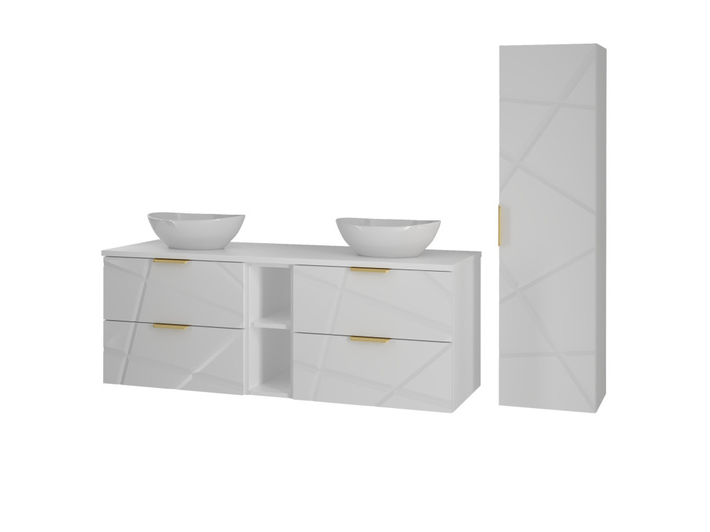 Je vybavená zlatými kovovými úchytkami, ktoré pridávajú luxusný nádych. Skrinka do kúpeľne je dostupná v dvoch variantoch: s doskou a s umývadlami na dosku.