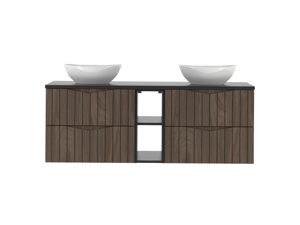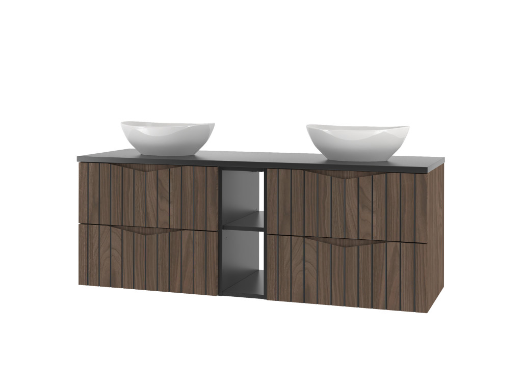 Model širokej kúpeľňovej skrinky pod umývadlo s poličkou Stesy 02 140 so svojimi štyrmi zásuvkami centrálnou poličkou ponúka praktické úložné riešenie pre všetky potrebné kúpeľňové doplnky, čím pomáha udržiavať poriadok a prehľadnosť. Je ideálnou voľbou pre tých, ktorí potrebujú v kúpeľni dve umývadlá a funkčný nábytok, ktorý zároveň neustále dodáva nádych modernosti a elegancie do vášho interiéru.