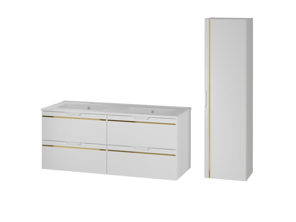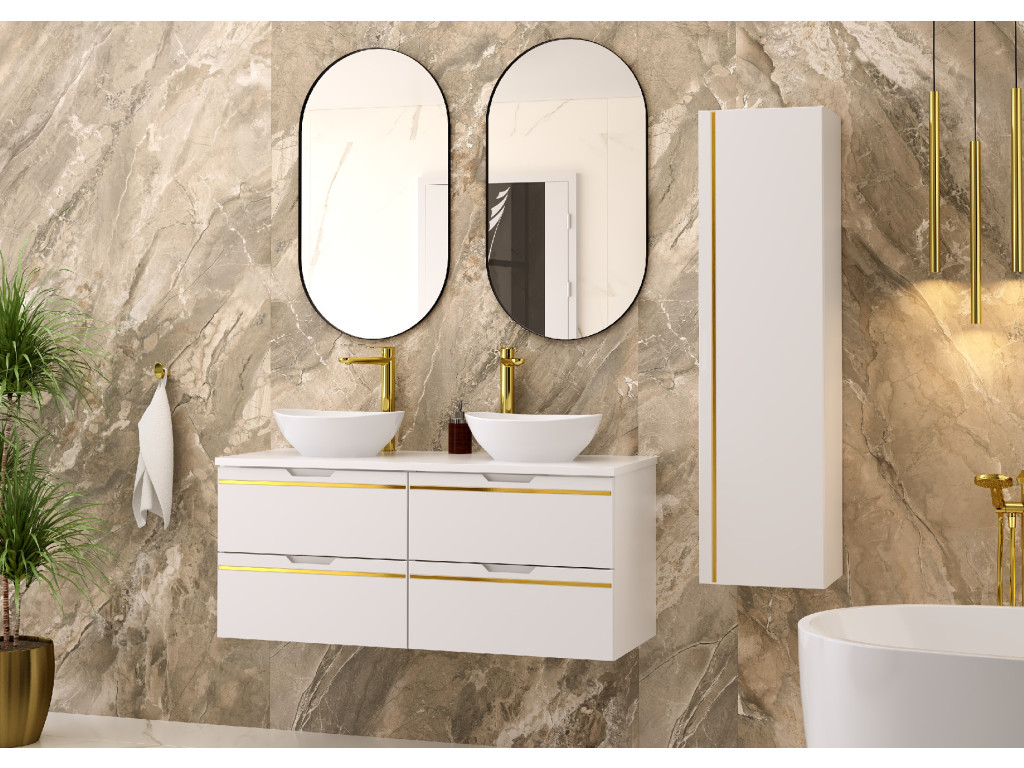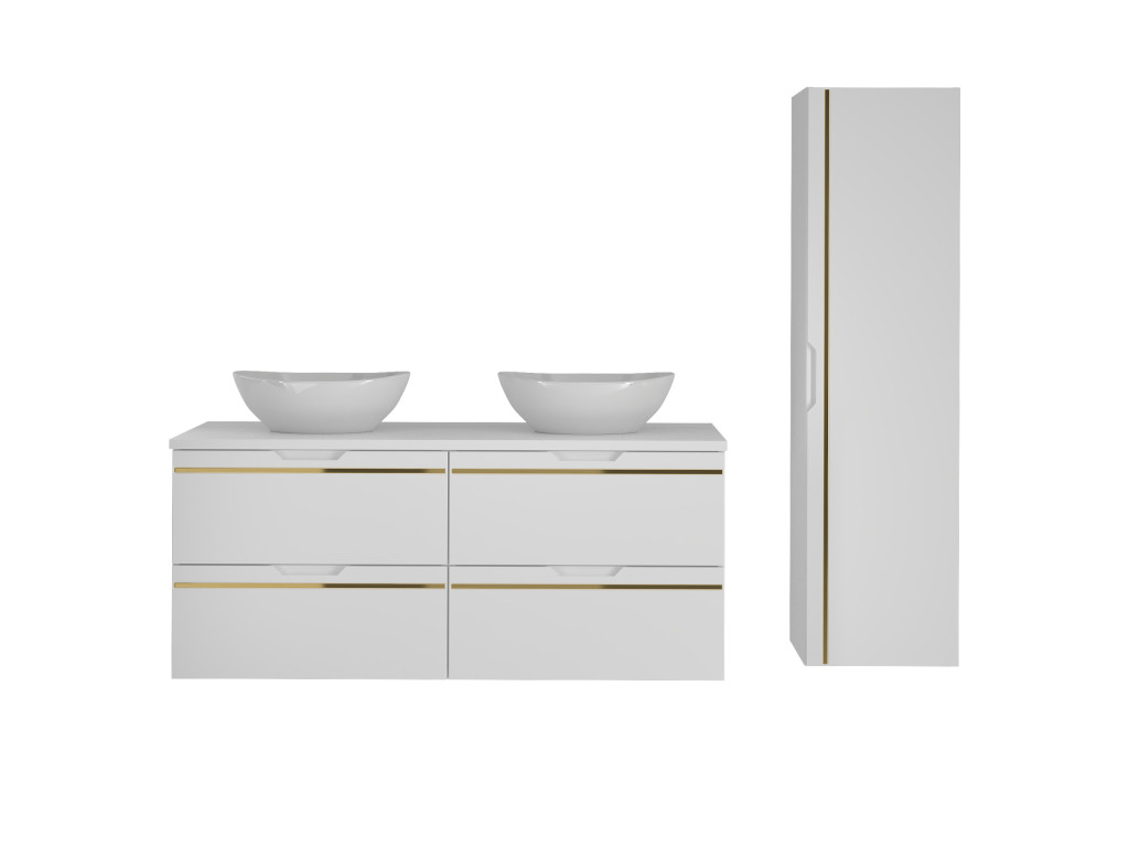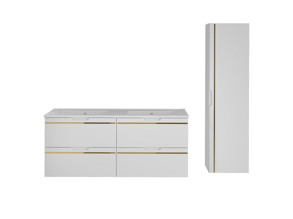 Espero 02 120 je kompaktná a zároveň mimoriadne štýlová skrinka, ktorá zaujme hladkým matným povrchom v bielej farbe so zlatým pásom. Jej šírka 120 cm predurčuje skrinku na využitie vo väčších kúpeľniach, kde si pritom zachová svoj luxusný nádych.