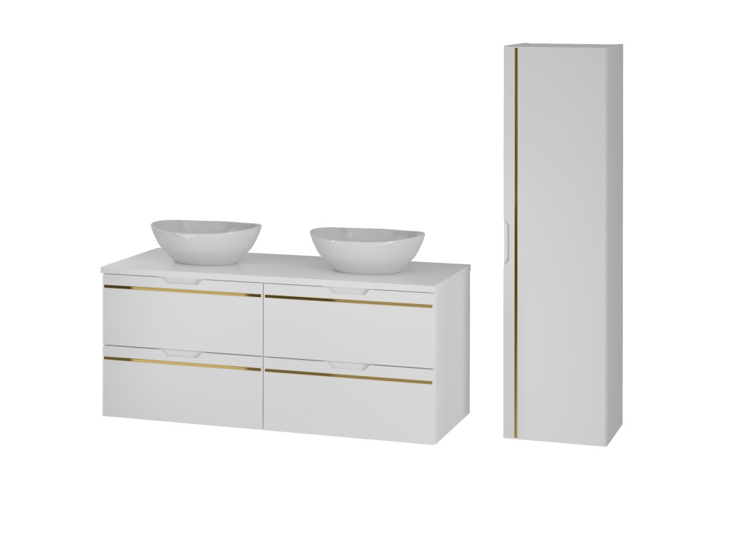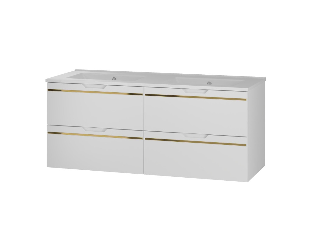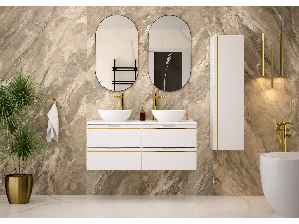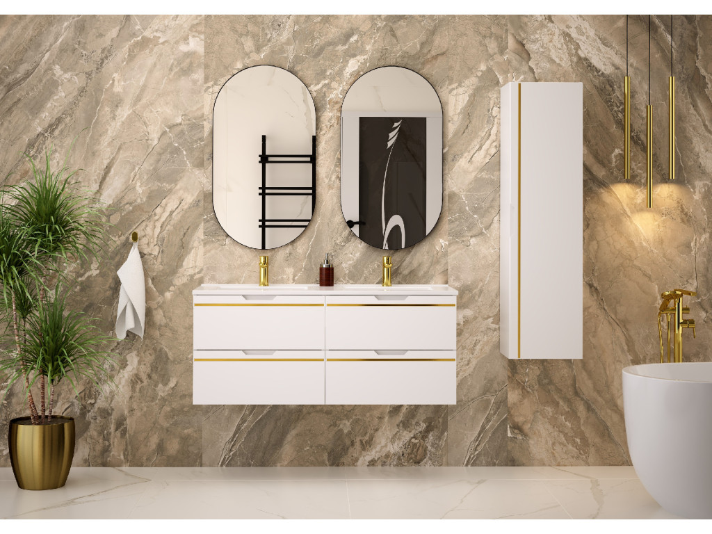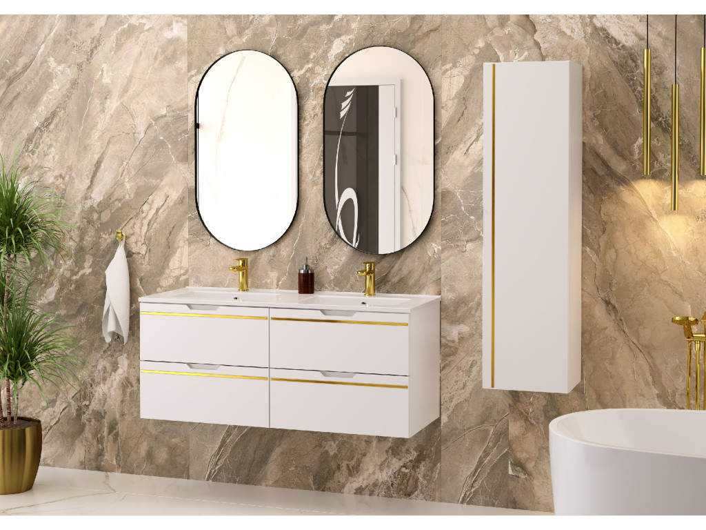 Espero 02 120 je kompaktná a zároveň mimoriadne štýlová skrinka, ktorá zaujme hladkým matným povrchom v bielej farbe so zlatým pásom. Jej šírka 120 cm predurčuje skrinku na využitie vo väčších kúpeľniach, kde si pritom zachová svoj luxusný nádych.