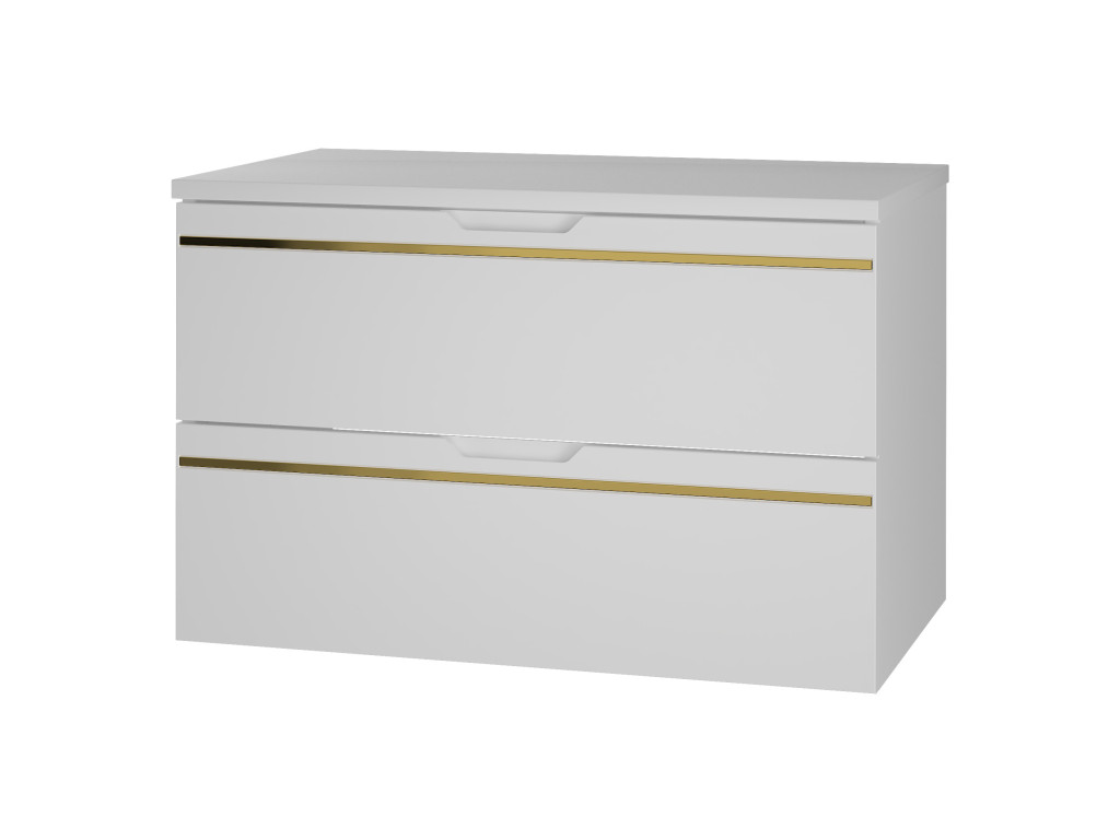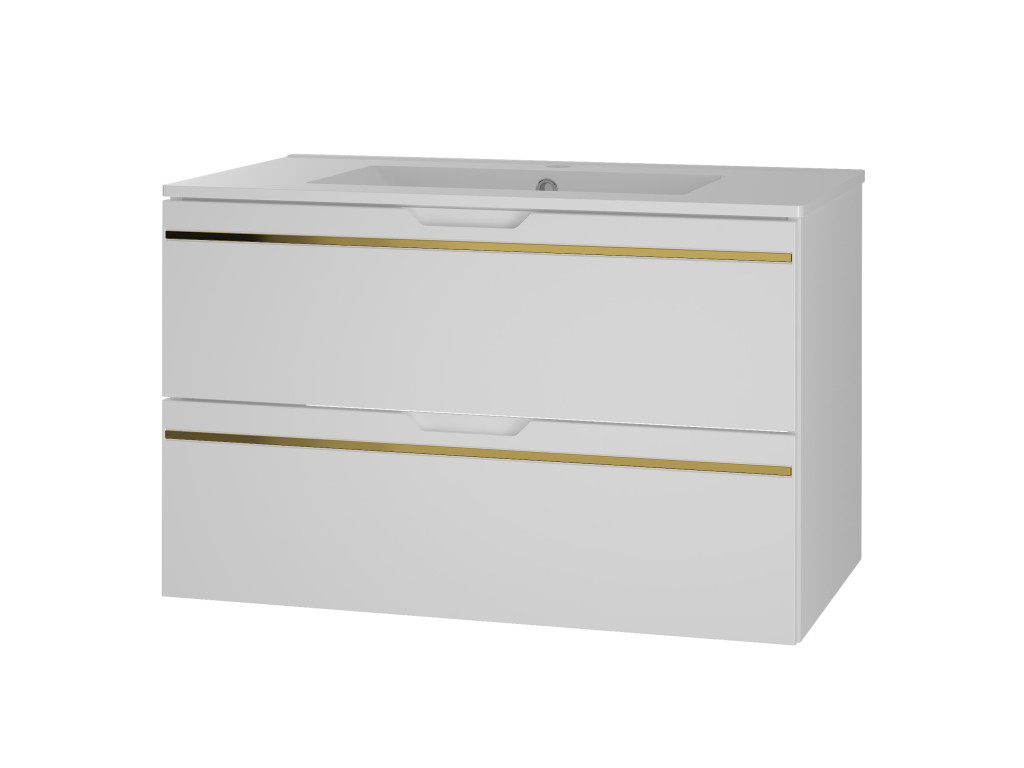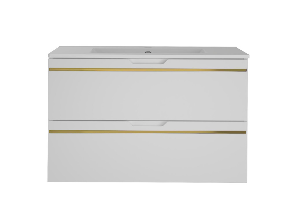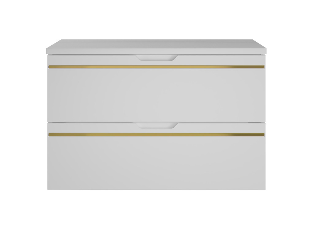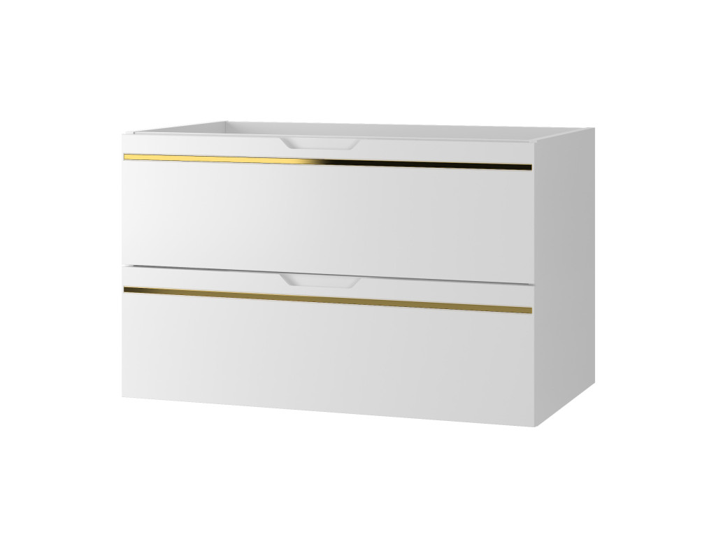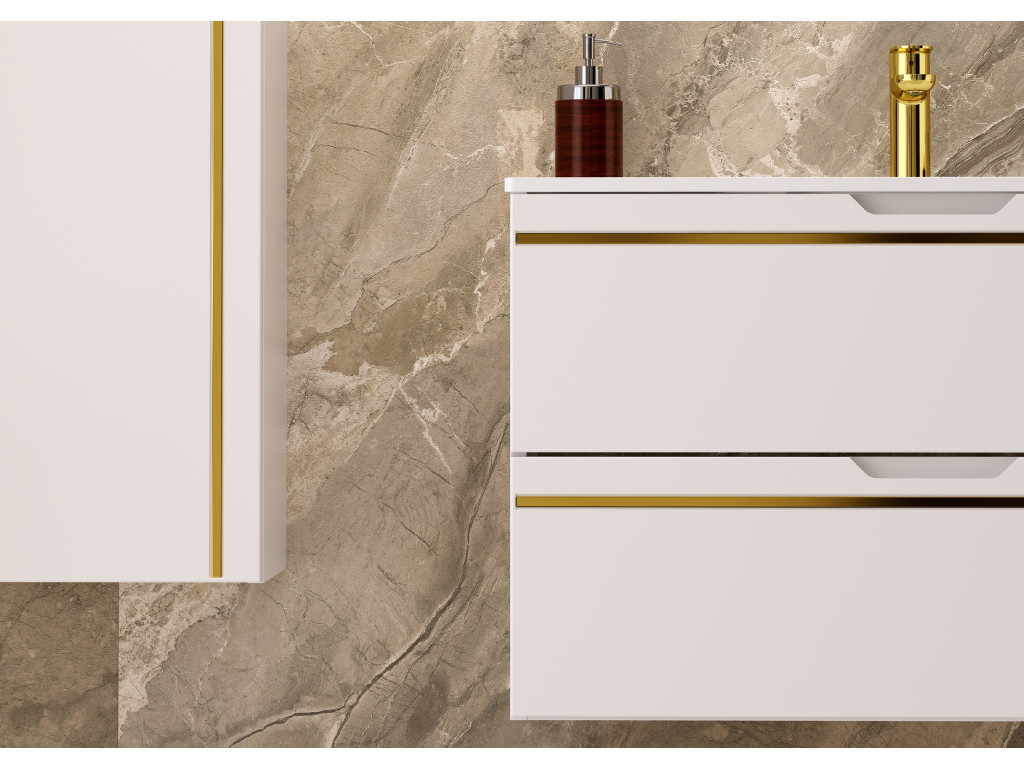 Závesná kúpeľňová skrinka s umývadlom Espero 01 vyniká hladkým bielym matným povrchom so zlatým pásom, ktorý jej dodáva elegantný vzhľad. Ponúka dve zásuvky s polovýsuvom a tichým dovieraním, čo zaručuje pohodlné a tiché používanie. Zásuvky sa otvárajú pomocou zafrézovaných úchytov, vďaka čomu zostávajú línie skrinky čisté a moderné.