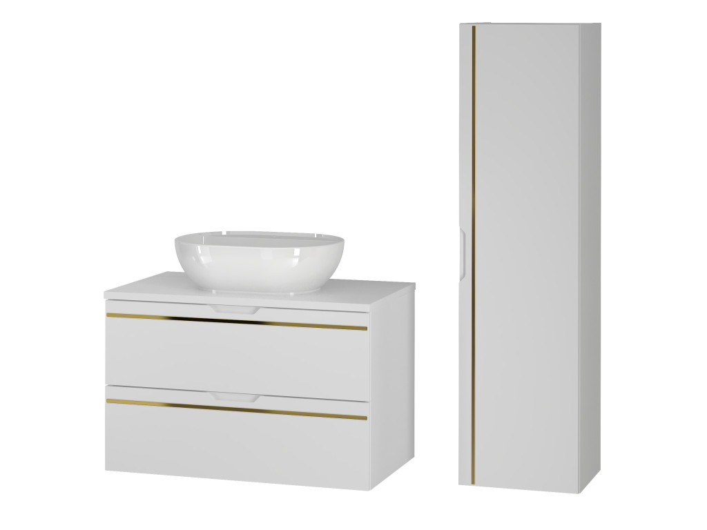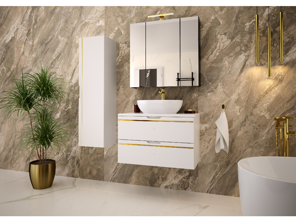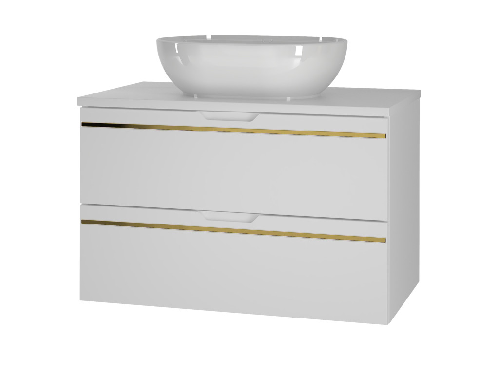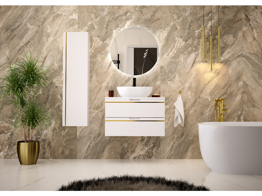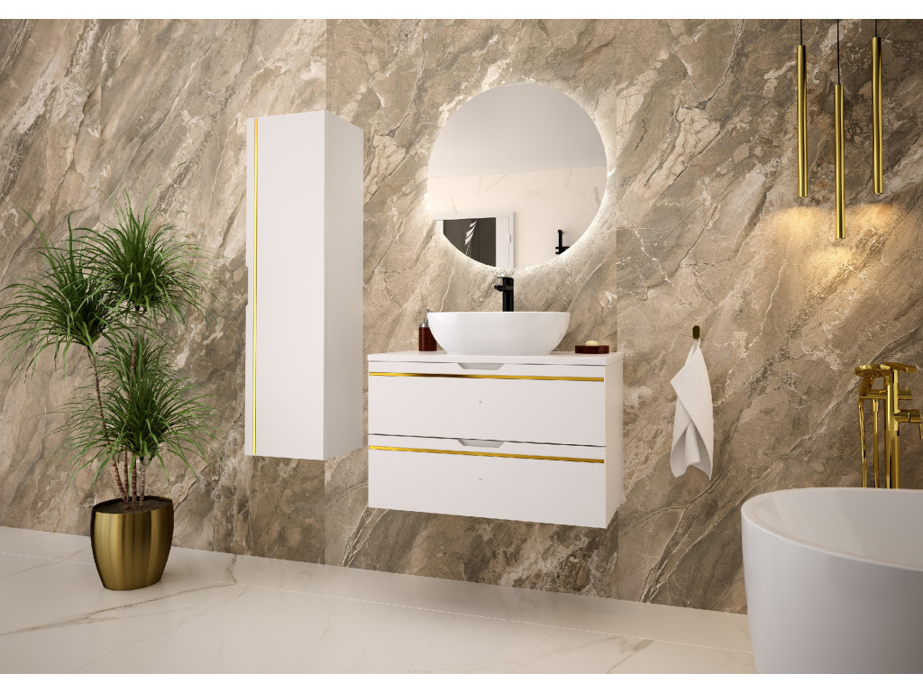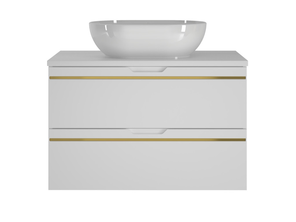 Závesná kúpeľňová skrinka s umývadlom Espero 01 vyniká hladkým bielym matným povrchom so zlatým pásom, ktorý jej dodáva elegantný vzhľad. Ponúka dve zásuvky s polovýsuvom a tichým dovieraním, čo zaručuje pohodlné a tiché používanie. Zásuvky sa otvárajú pomocou zafrézovaných úchytov, vďaka čomu zostávajú línie skrinky čisté a moderné.