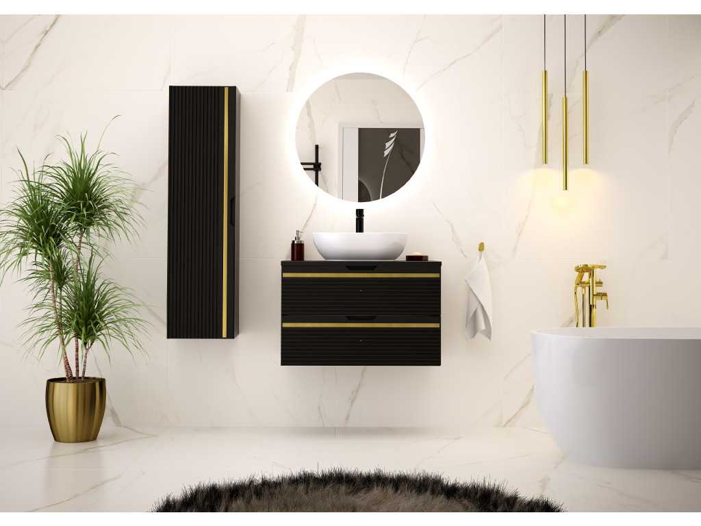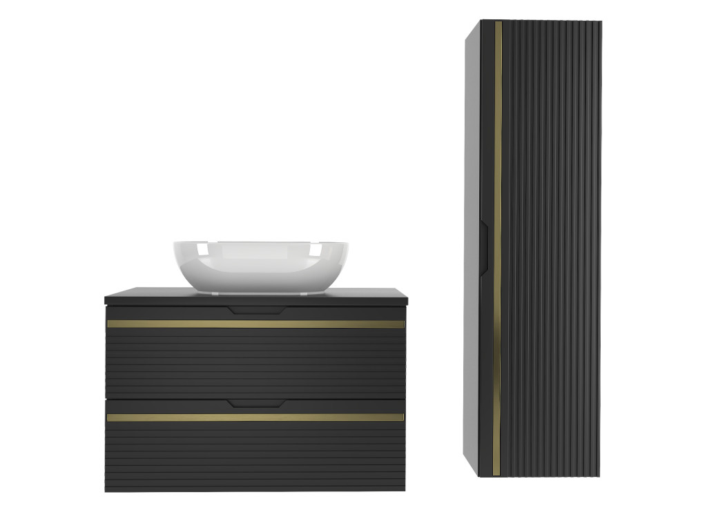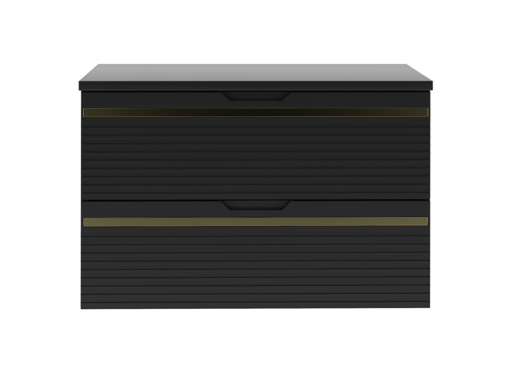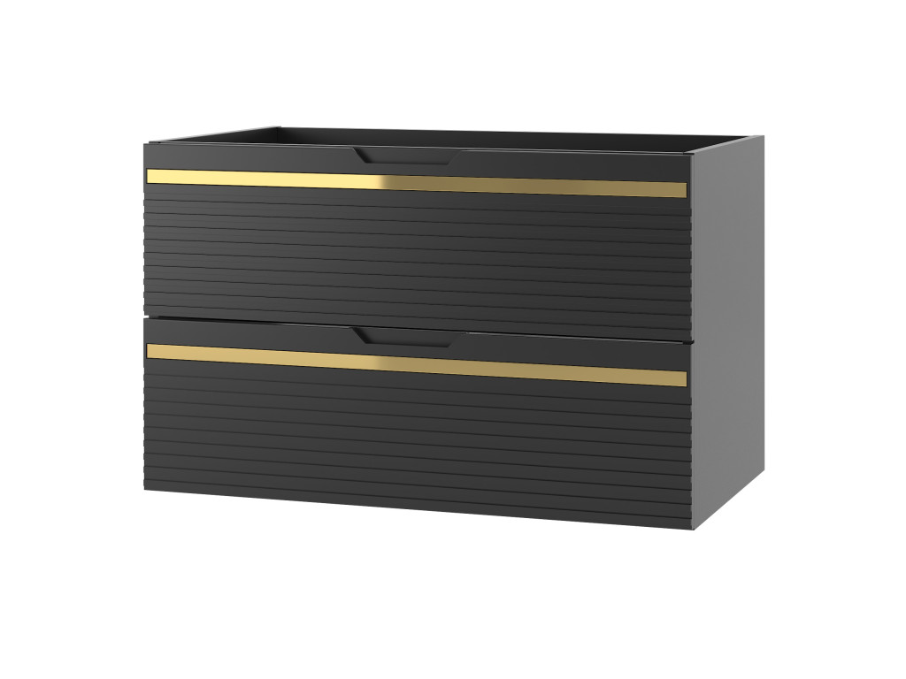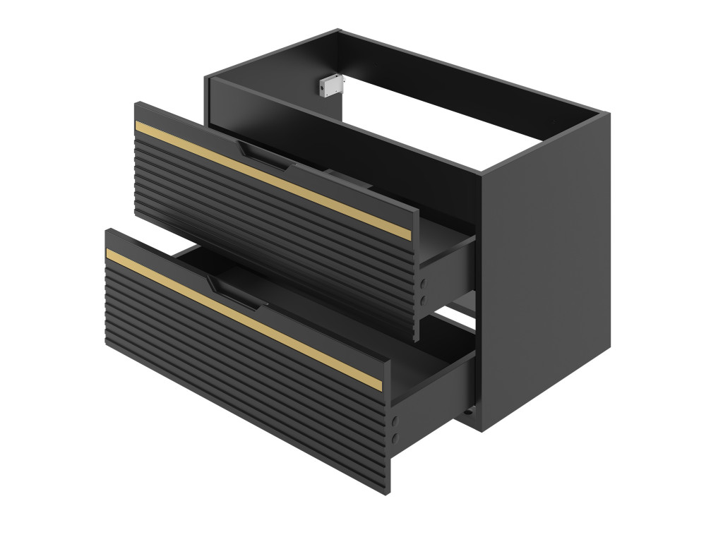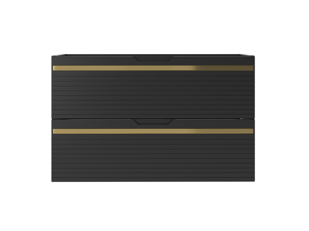 Závesná kúpeľňová skrinka s umývadlom Vesper 01 vyniká čiernym matným povrchom so zlatým pásom, ktorý jej dodáva elegantný vzhľad. Ponúka dve zásuvky s polovýsuvom a tichým dovieraním, čo zaručuje pohodlné a tiché používanie. Zásuvky sa otvárajú pomocou zafrézovaných úchytov, vďaka čomu zostávajú línie skrinky čisté a moderné.