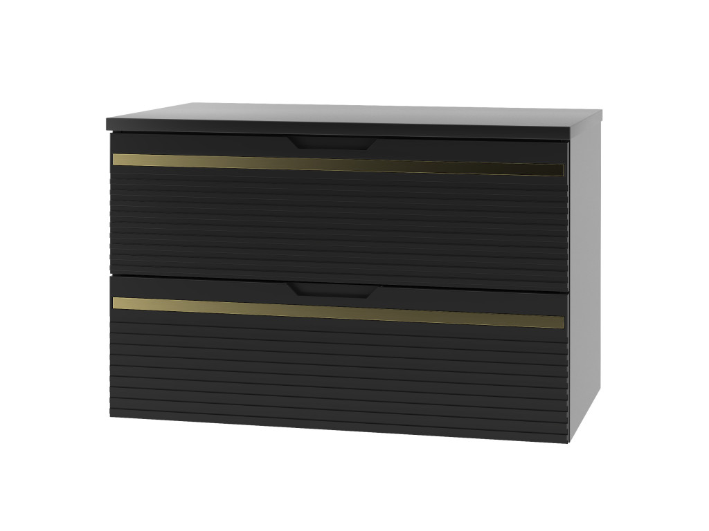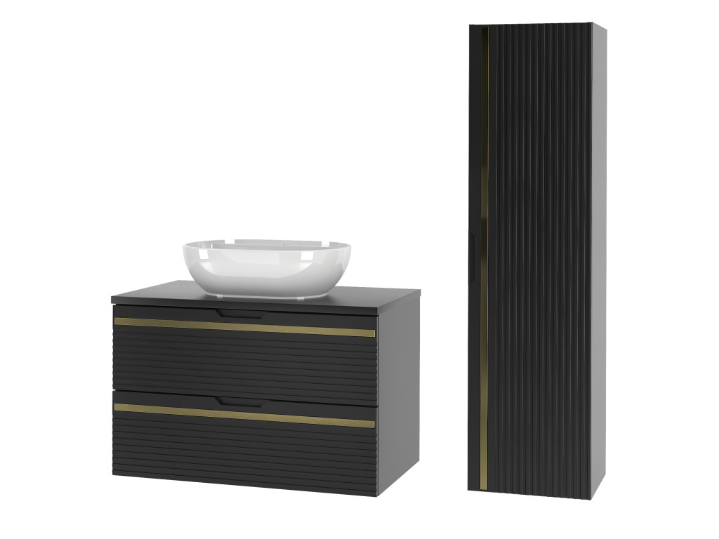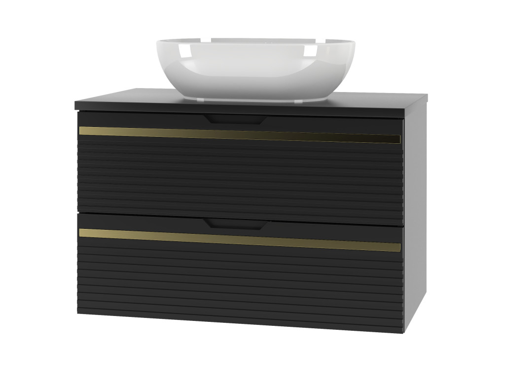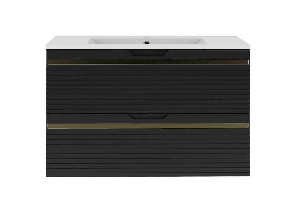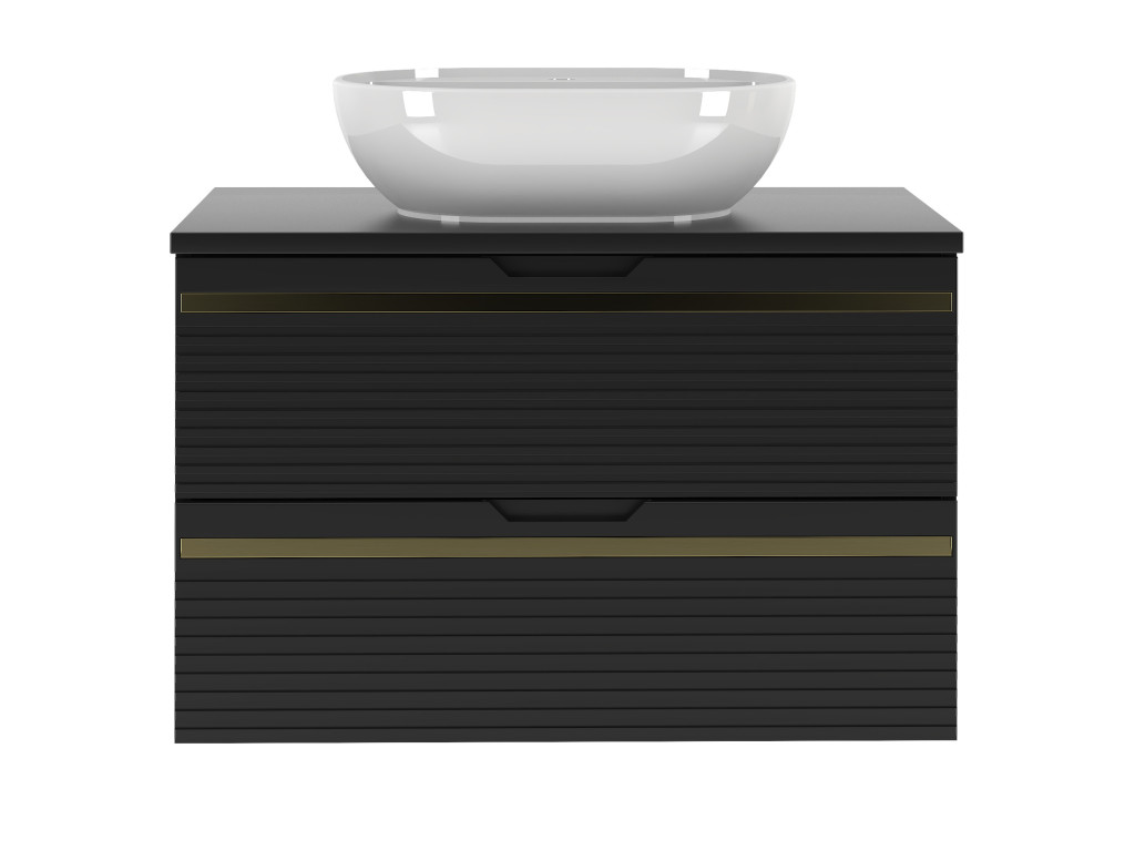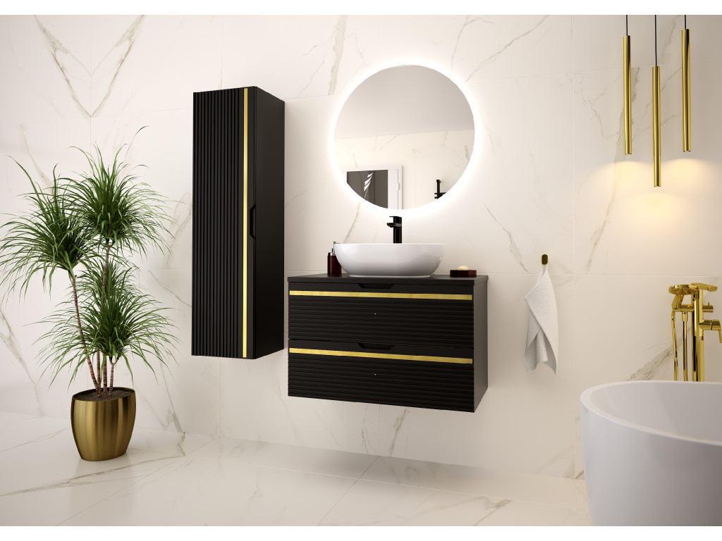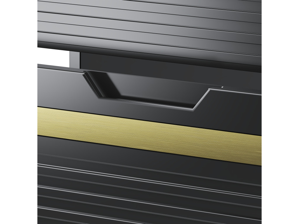 Závesná kúpeľňová skrinka s umývadlom Vesper 01 vyniká čiernym matným povrchom so zlatým pásom, ktorý jej dodáva elegantný vzhľad. Ponúka dve zásuvky s polovýsuvom a tichým dovieraním, čo zaručuje pohodlné a tiché používanie. Zásuvky sa otvárajú pomocou zafrézovaných úchytov, vďaka čomu zostávajú línie skrinky čisté a moderné.