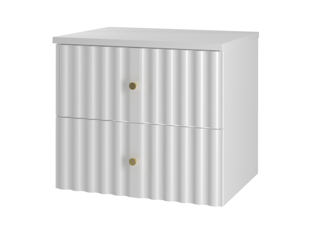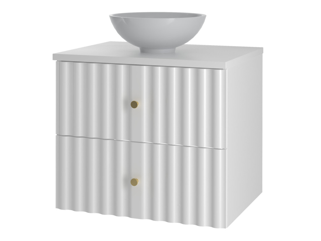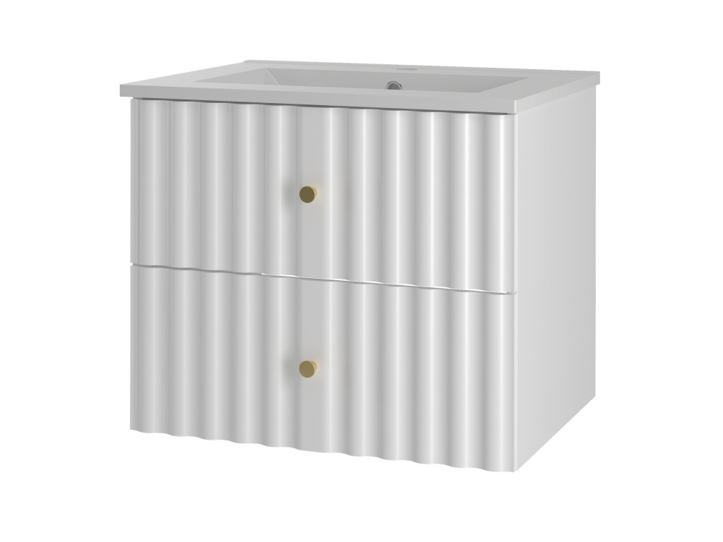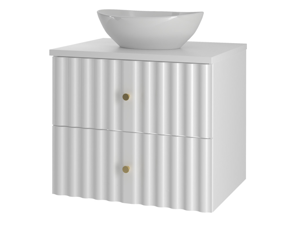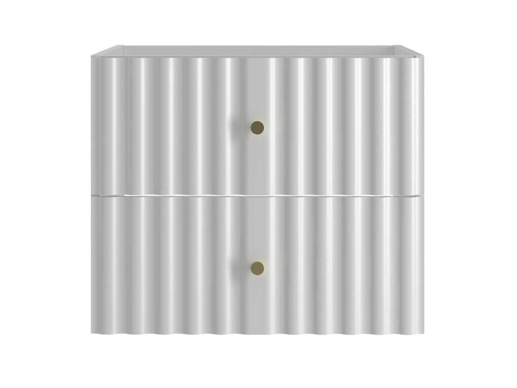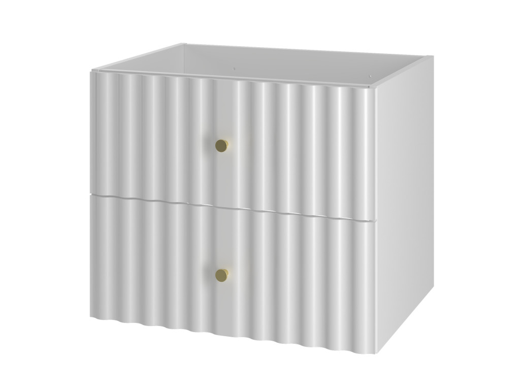 Kúpeľňová skrinka Aqua 02 v matnej bielej farbe je široká 60 cm a disponuje dvomi zásuvkami. Dostupná je vo variantoch: bez vrchnej dosky, so vrchnou doskou, s umývadlom na dosku (dva typy na výber), alebo so zápustným umývadlom. Zlaté úchytky v tvare guličiek spolu s vlnovitým profilom dvierok dodávajú nábytku sofistikovaný vzhľad, zatiaľ čo závesné prevedenie a tiché dovieranie zvyšujú komfort používania.