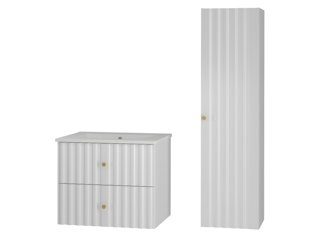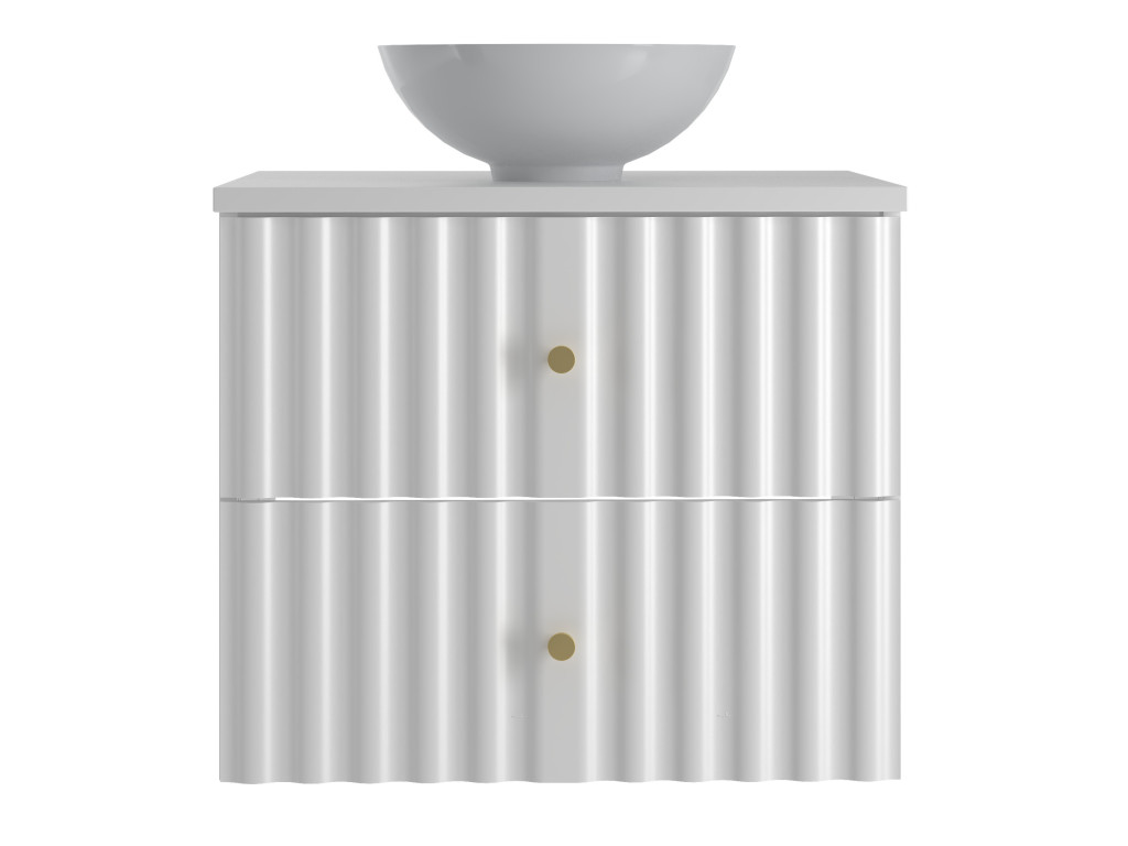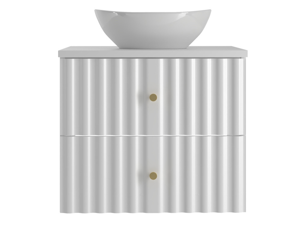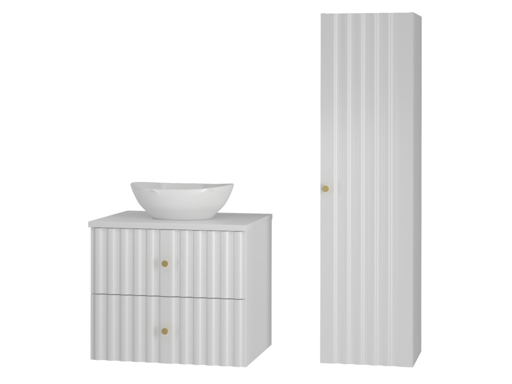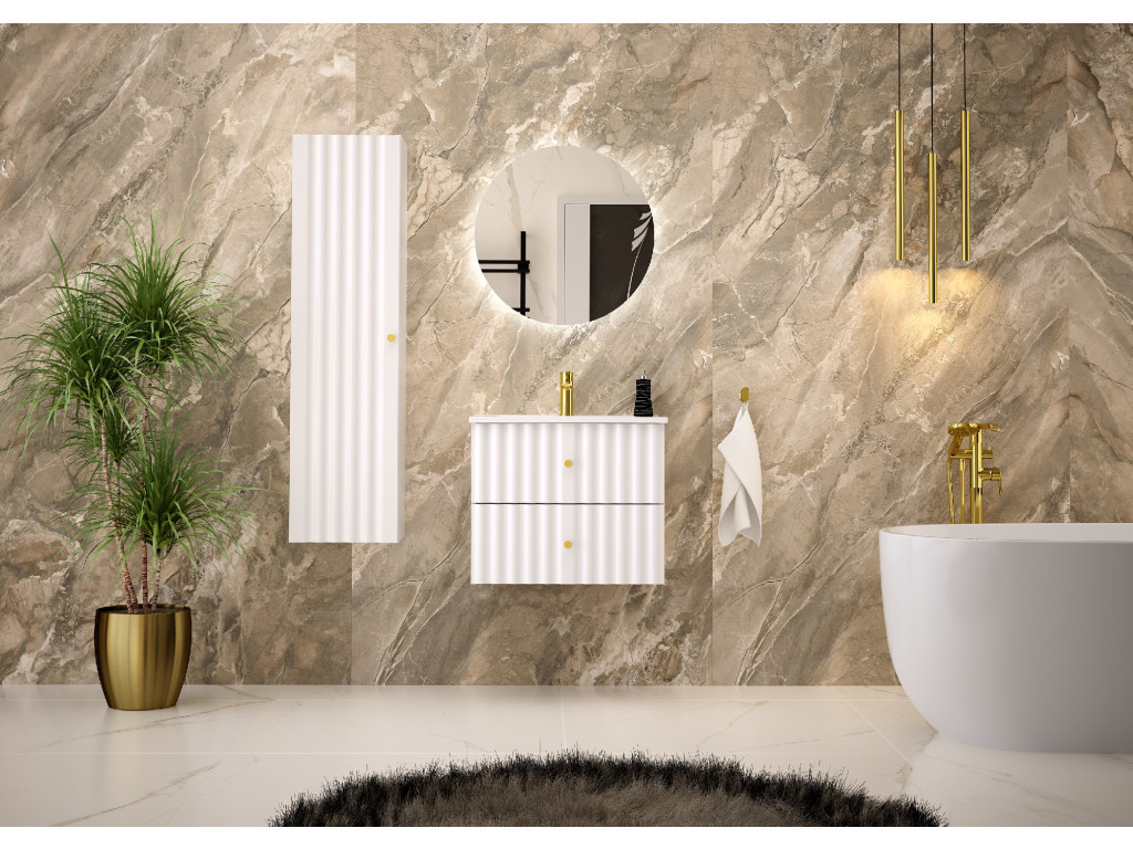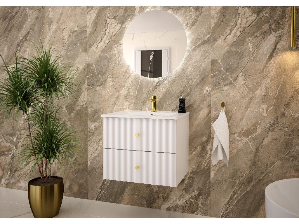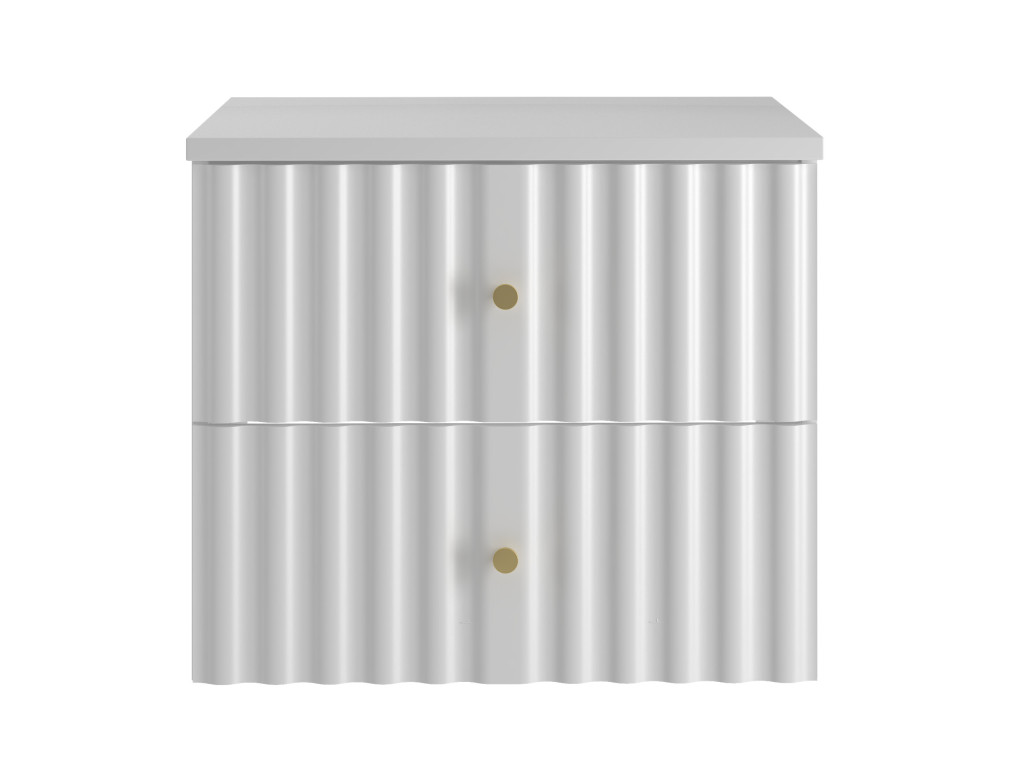 Kúpeľňová skrinka Aqua 02 v matnej bielej farbe je široká 60 cm a disponuje dvomi zásuvkami. Dostupná je vo variantoch: bez vrchnej dosky, so vrchnou doskou, s umývadlom na dosku (dva typy na výber), alebo so zápustným umývadlom. Zlaté úchytky v tvare guličiek spolu s vlnovitým profilom dvierok dodávajú nábytku sofistikovaný vzhľad, zatiaľ čo závesné prevedenie a tiché dovieranie zvyšujú komfort používania.