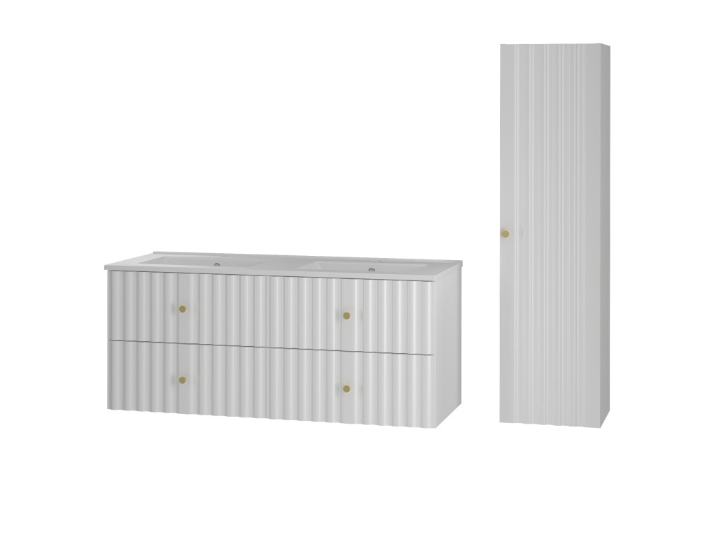 Kolekcia Aqua je moderný a elegantný nábytok do kúpeľne, ktorý spája štýl a funkčnosť. Vlnovitý profil dvierok dodáva nábytku jedinečný vizuálny efekt a jemnú dynamiku, zatiaľ čo luxusné zlaté úchytky v tvare guličky zvýrazňujú jeho sofistikovaný dizajn.