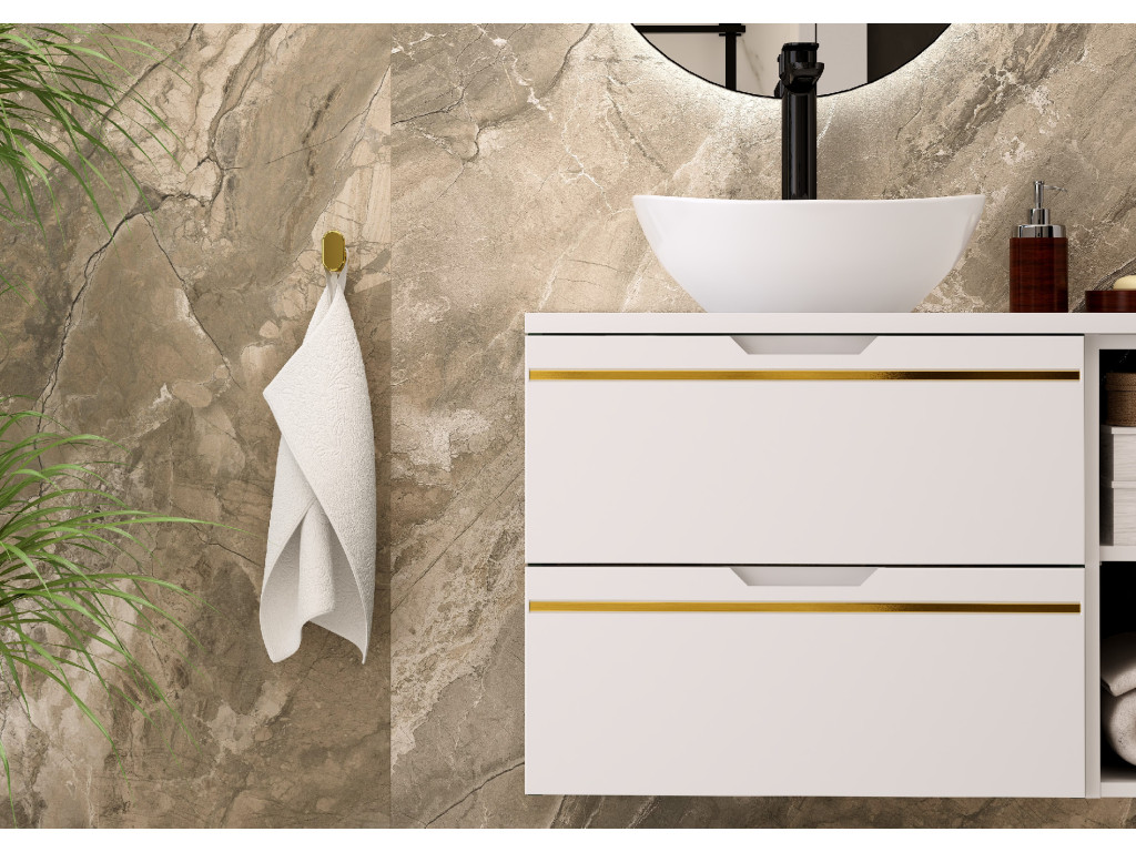 Skrinka pod umývadlo Espero 02P je kompaktná, no zároveň luxusne pôsobiaca skrinka so šírkou 80 cm, navrhnutá s dvoma zásuvkami pre dostatok úložného priestoru. Hladký matný povrch dopĺňa výrazný zlatý pás, ktorý podčiarkuje moderný charakter kolekcie. Zásuvky sa otvárajú pomocou zafrézovaných úchytov, pričom polovýsuv a tiché dovieranie zabezpečujú pohodlné každodenné používanie. Skrinka je dostupná v dvoch variantoch s umývadlom alebo bez, vďaka čomu sa ľahko prispôsobí vašim požiadavkám.