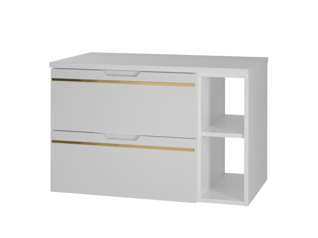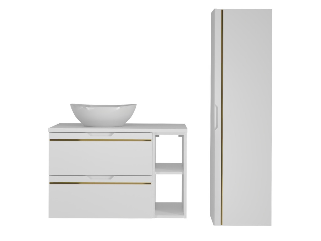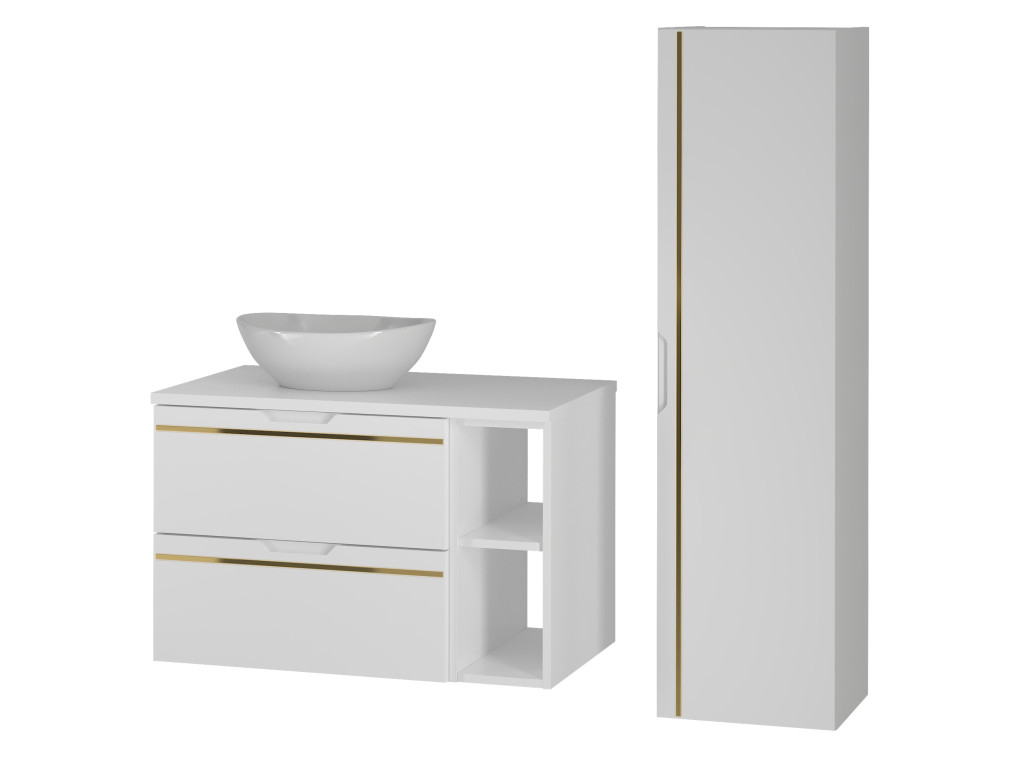 Espero 02P je kompaktná a zároveň mimoriadne štýlová skrinka, ktorá zaujme hladkým matným povrchom so zlatým pásom. Jej šírka 80 cm predurčuje skrinku na využitie v menších kúpeľniach, kde si pritom zachová svoj luxusný nádych. Je doplnená bočnou otvorenou poličkou.