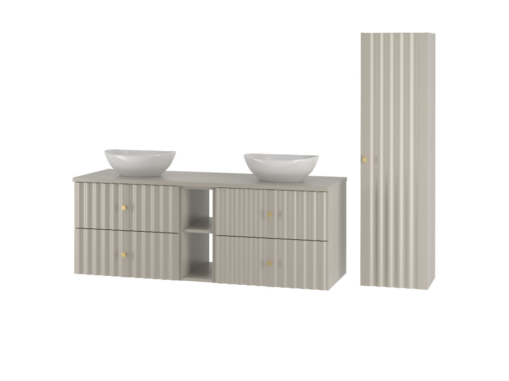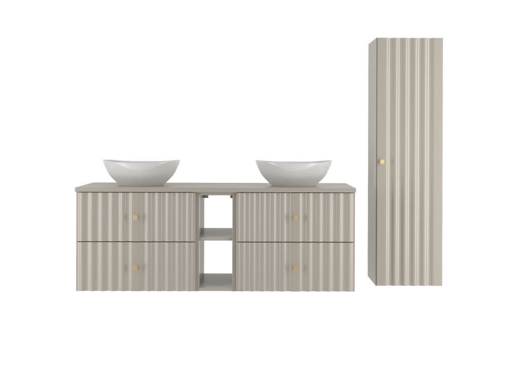 Kúpeľňová skrinka Aqua 02 140 v matnej béžovej farbe prináša jemný, no moderný dizajn s dvojnásobnou praktickosťou. Tento produkt je vytvorený spojením dvoch skriniek so šírkou 60 cm a poličky v šírke 20 cm, pričom vrchná doska je celistvá a má šírku 140 cm. Disponuje štyrmi zásuvkami a je dostupná vo variantoch: s vrchnou doskou, alebo s dvomi umývadlami na dosku.