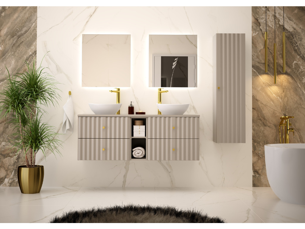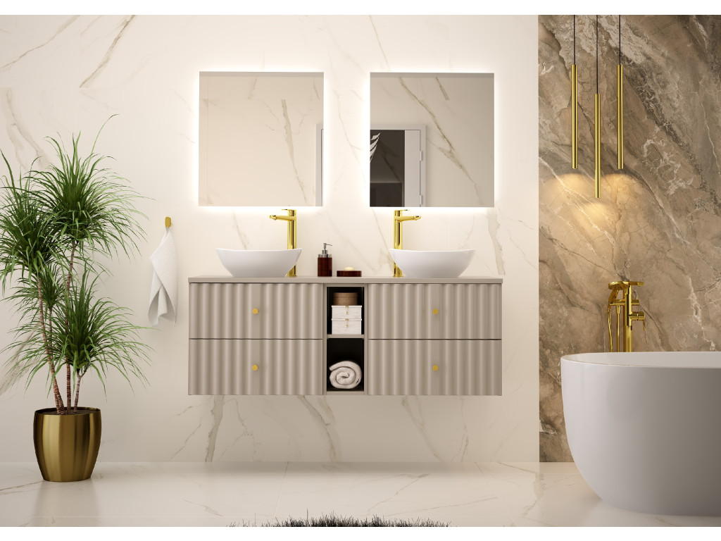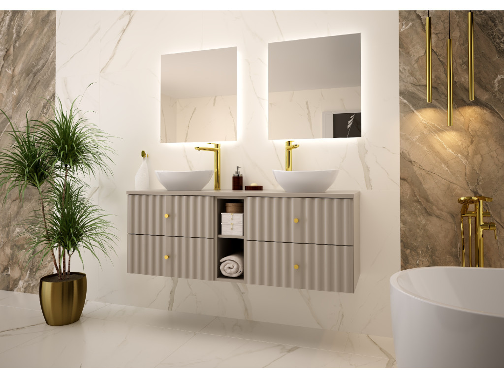 Závesný dizajn, vlnovitý profil dvierok a elegantné zlaté úchytky v tvare guličiek vytvárajú jedinečný a luxusný vzhľad, ktorý dokonale zapadne do každej štýlovej kúpeľne. Táto široká skrinka kombinuje dostatok úložného priestoru s estetickým a moderným dizajnom.