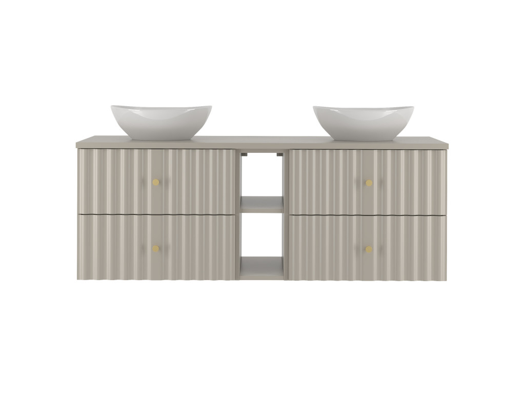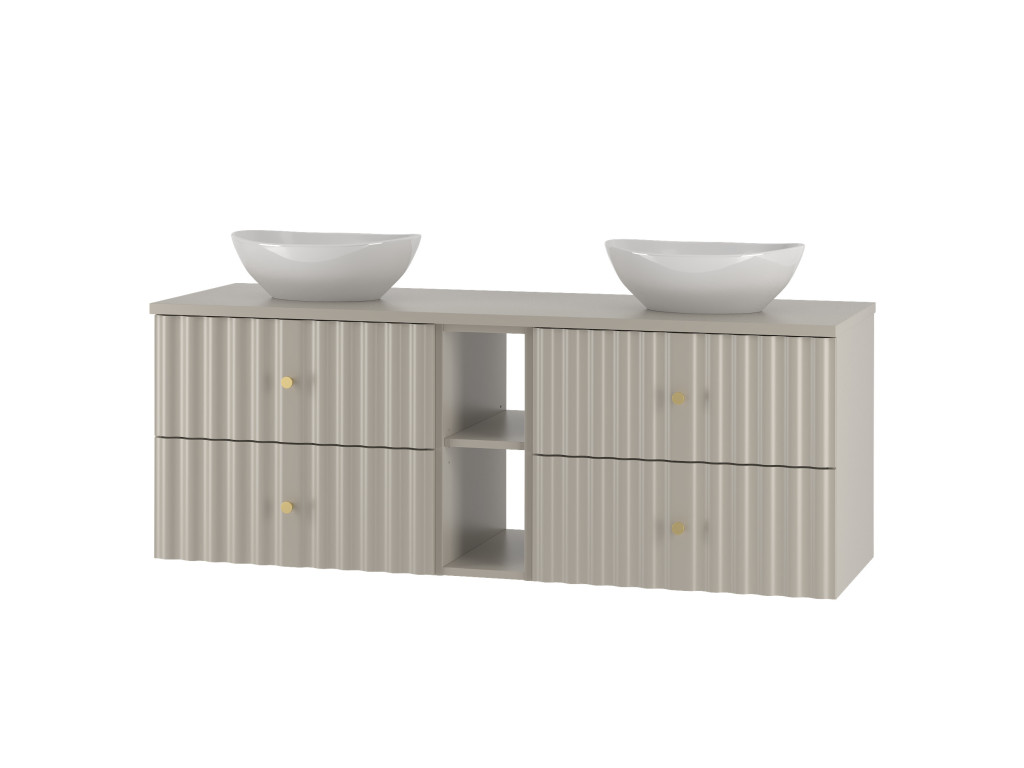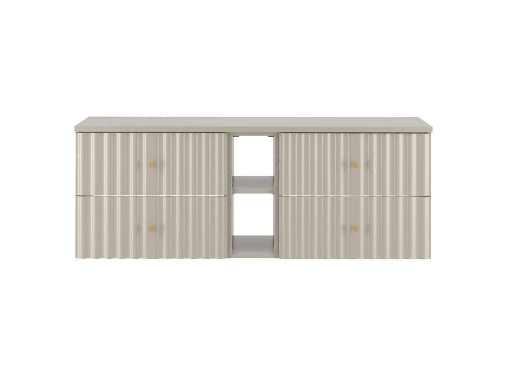 Široká skrinka pod umývadlo Aqua 02 140 v matnej béžovej farbe je dokonalou kombináciou funkčnosti a elegancie. Vytvorená spojením dvoch skriniek 60 cm s celistvou doskou 140 cm, ponúka štyri zásuvky a navyše otvorenú poličku. Vlnovitý profil dvierok a zlaté úchytky v tvare guličiek dodávajú skrinke luxusný a moderný vzhľad, ktorý oživí každú kúpeľňu.