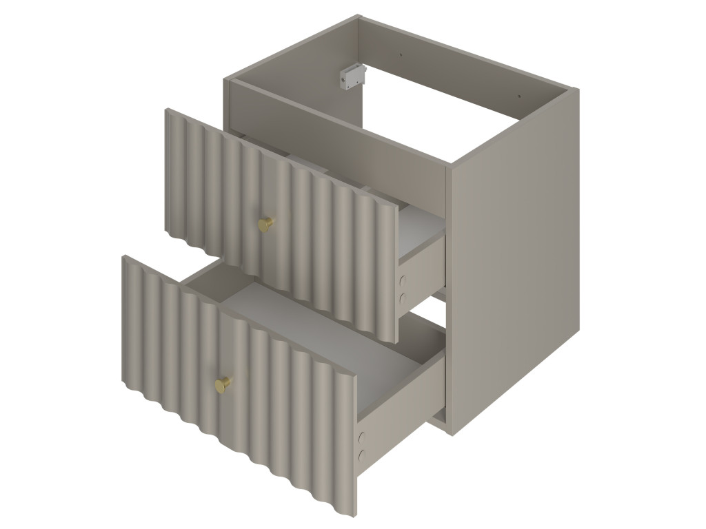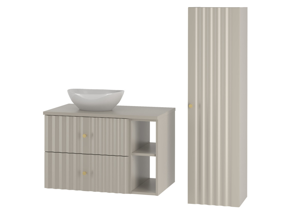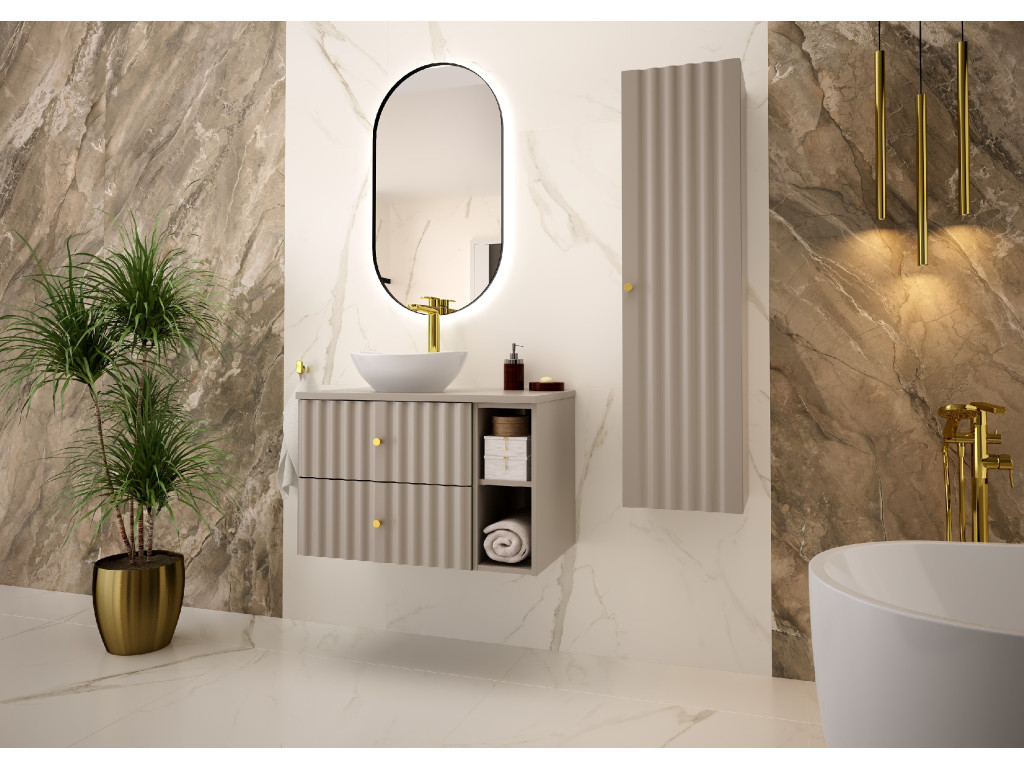 Kúpeľňová skrinka Aqua 02P v matnej béžovej farbe prináša jemný, no moderný dizajn s praktickým riešením. So šírkou 80 cm, dvomi zásuvkami a úzkou otvorenou poličkou je dostupná vo variantoch: s vrchnou doskou a s umývadlom na dosku. Vlnovitý profil dvierok a zlaté úchytky dodávajú skrinke luxusný vzhľad, ktorý dokonale zapadne do moderných kúpeľní.