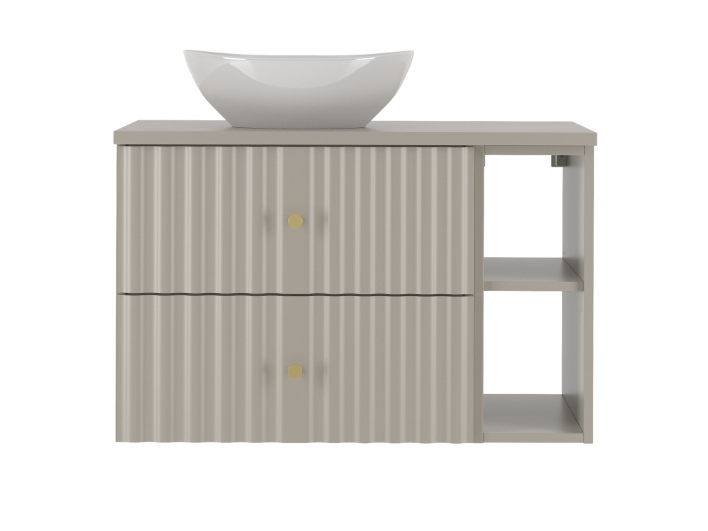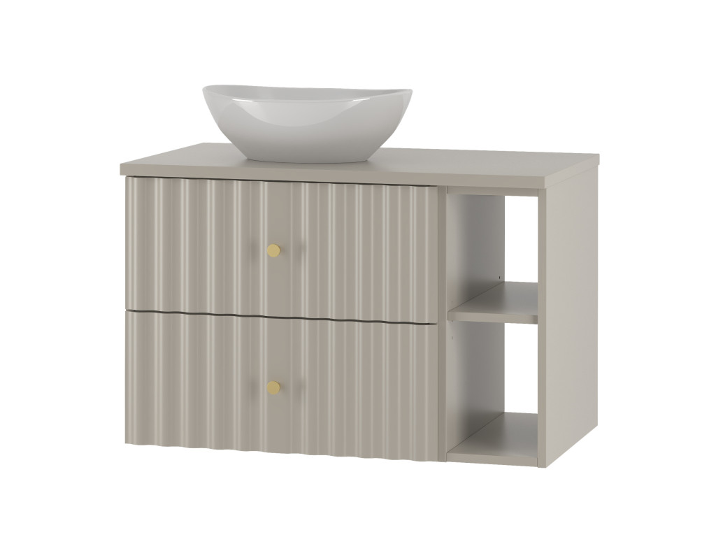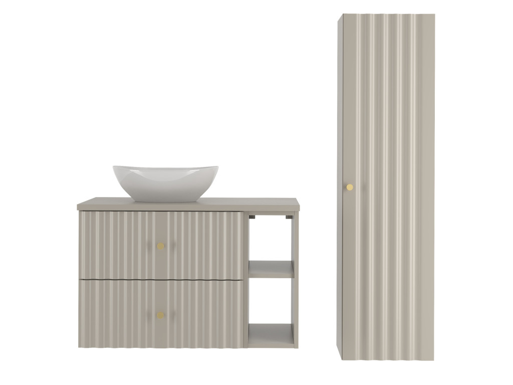 Skrinka pod umývadlo s poličkou Aqua 02P v matnej béžovej farbe prináša jemný, no moderný dizajn. So šírkou 80 cm s dvomi zásuvkami a úzkou otvorenou poličkou je dostupná vo variantoch: s vrchnou doskou, a s umývadlom na dosku. Závesný dizajn, vlnovitý profil dvierok a elegantné zlaté úchytky v tvare guličiek vytvárajú jedinečný a luxusný vzhľad vhodný do každej kúpeľne.