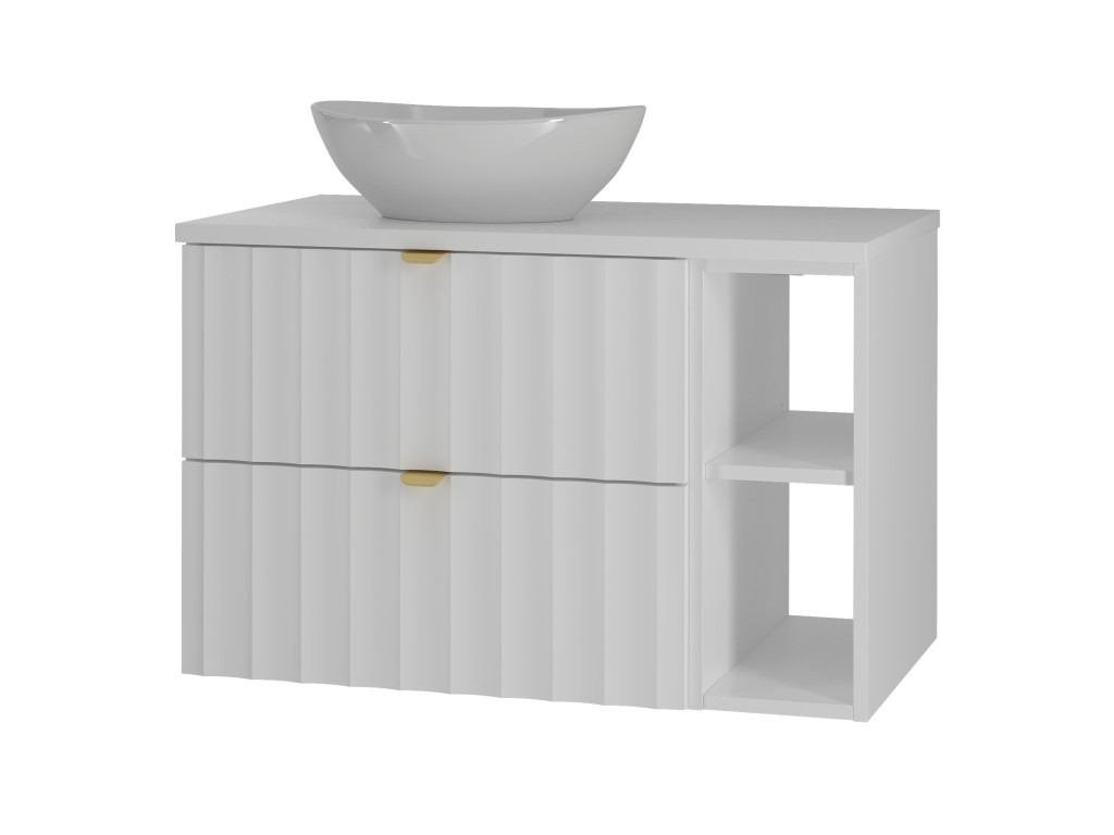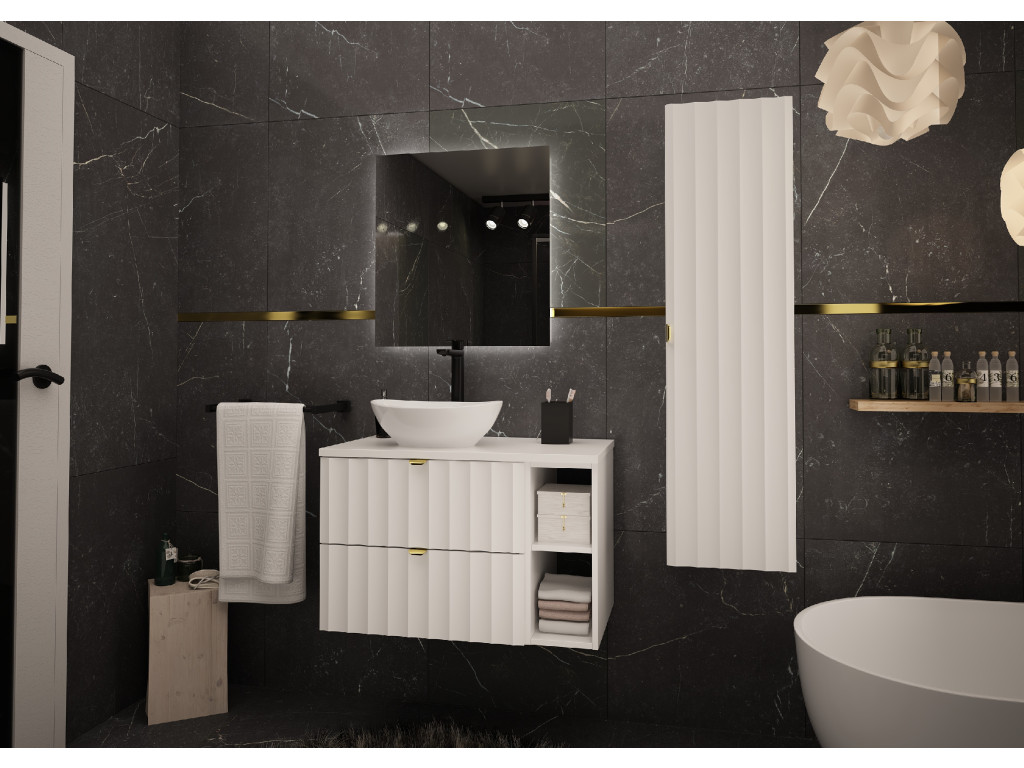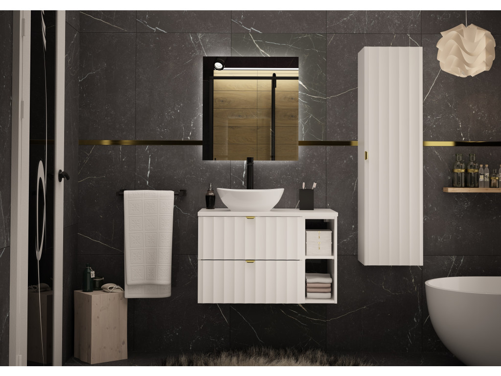 Elegantný profil vtlačených vĺn na čelách zásuviek a zlaté kovové úchytky dodávajú kúpeľni sofistikovaný vzhľad, zatiaľ čo závesné prevedenie zdôrazňuje vzdušnosť a čisté línie priestoru. Kolekcia Arkos je vyrobená z kvalitných materiálov – laminovanej DTD (16 mm) a fóliovanej MDF (18 mm) – ktoré zaručujú odolnosť a dlhú životnosť aj vo vlhkých podmienkach. Skrinka disponuje tichým dovieraním a zásuvkami s polovýsuvmi, čo zvyšuje komfort pri každodennom používaní.