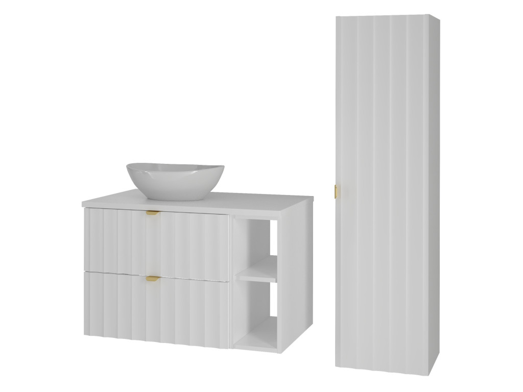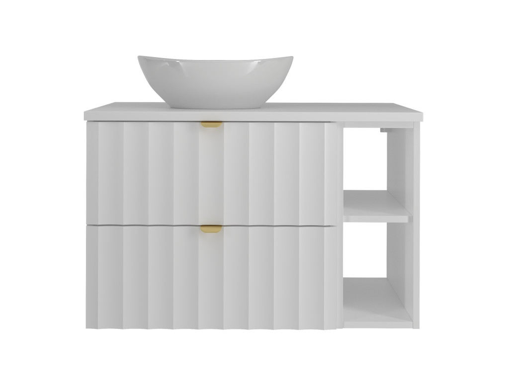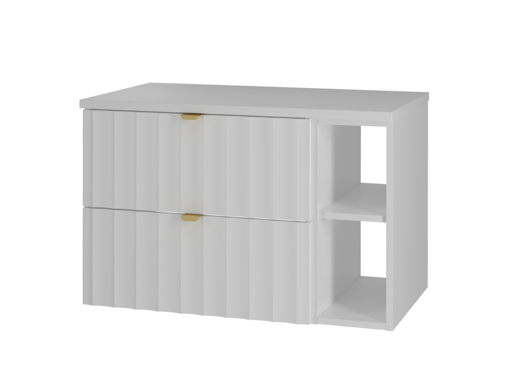 Skrinka pod umývadlo Arkos 06P v matnej bielej farbe prináša štýl a praktickosť do vašej kúpeľne. So šírkou 80 cm, dvomi zásuvkami a úzkou poličkou ponúka dostatok miesta na organizáciu. Dostupná je v dvoch variantoch, aby sa dokonale prispôsobila vašim potrebám, a vďaka profilu vtlačených vĺn a zlatým kovovým úchytkám dodáva interiéru eleganciu a moderný vzhľad.