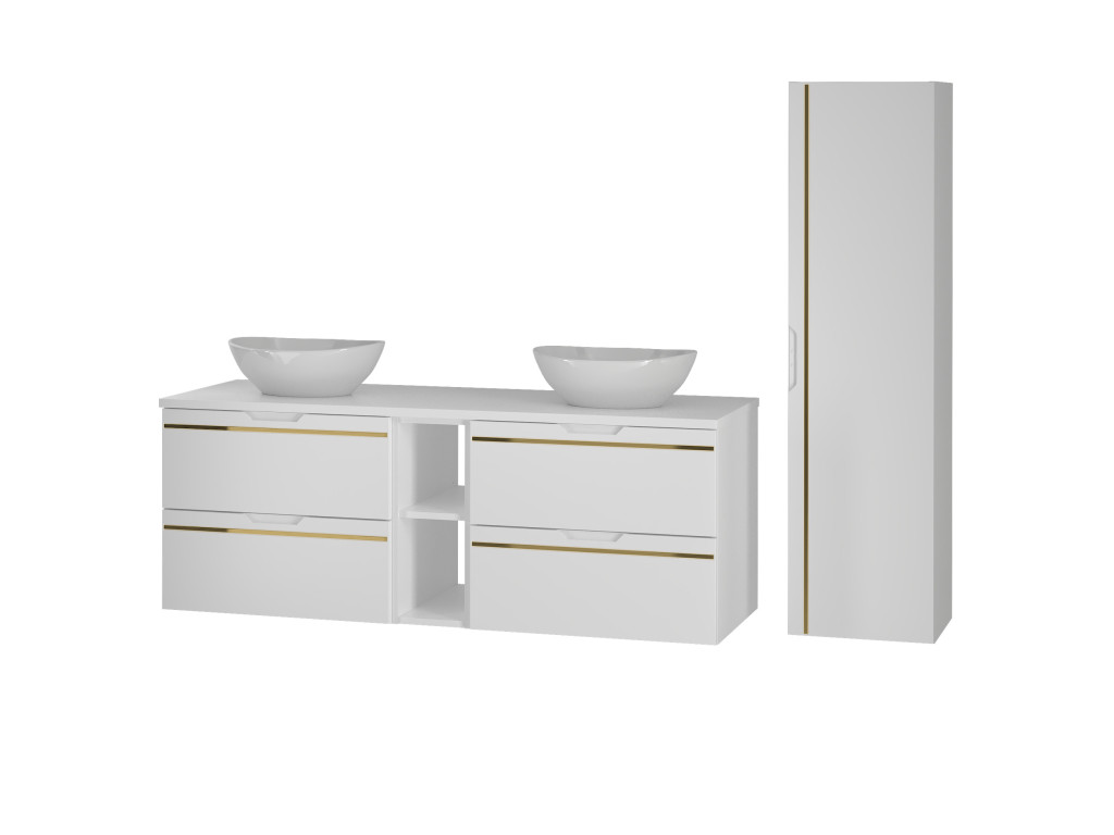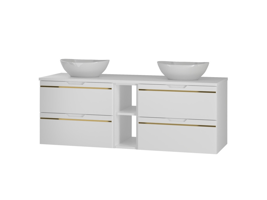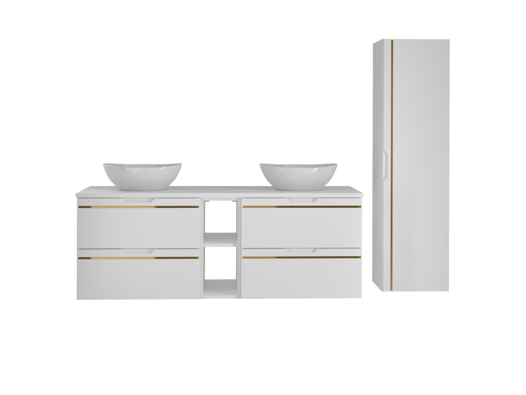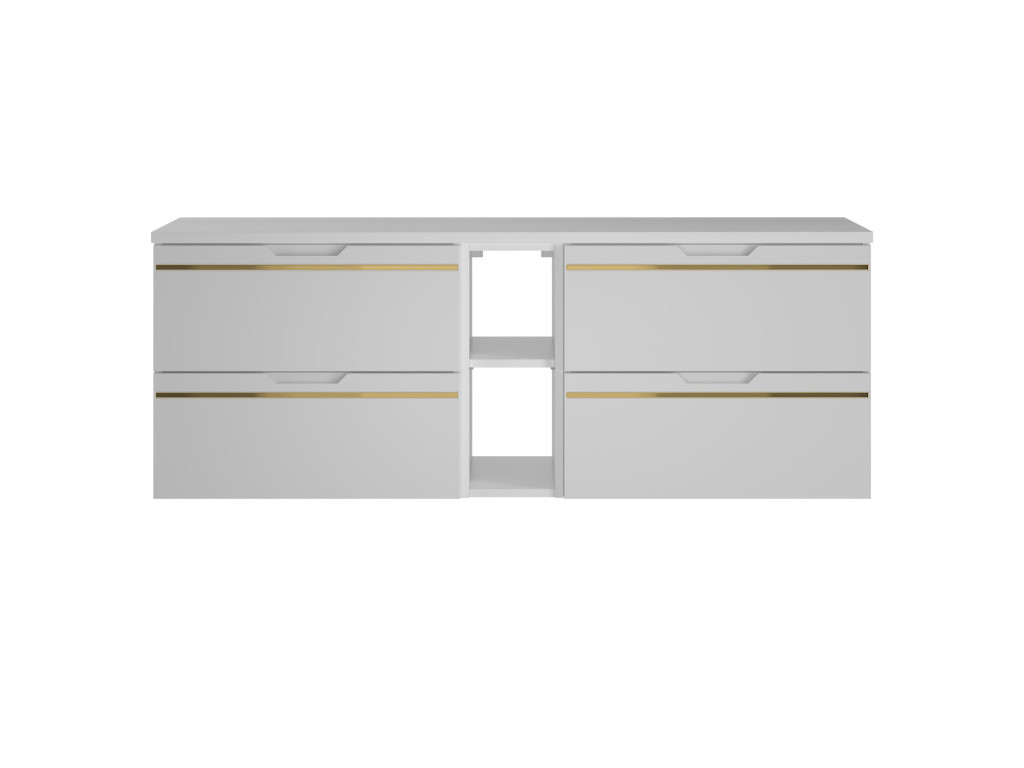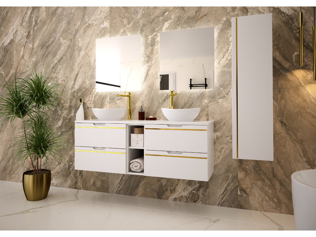 Espero 02 140 je kompaktná a zároveň mimoriadne štýlová skrinka s otvorenou poličkou, ktorá zaujme hladkým matným povrchom v bielej farbe so zlatým pásom. Jej šírka 140 cm predurčuje skrinku na využitie vo väčších kúpeľniach, pretože je vhodná pre dve umývadlá a pritom si zachováva svoj luxusný nádych.